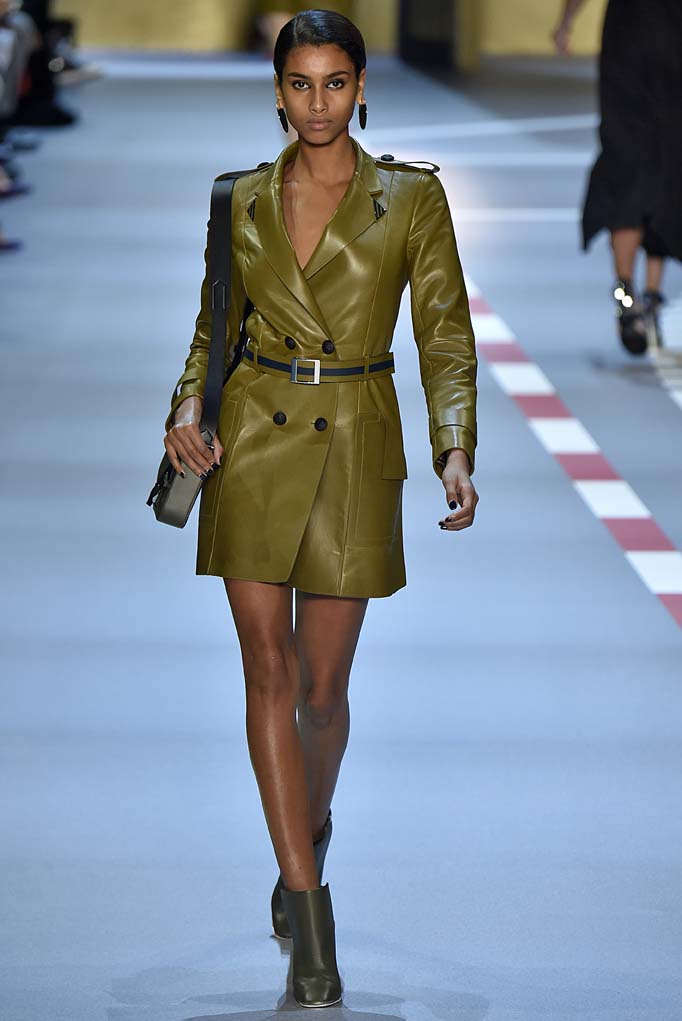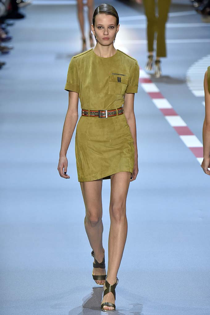 A giant golden propeller and a runway strip, of the airport variety, served as the backdrop for the Mugler show today. It was a military theme featuring nautical looks like a one-piece navy off-the-shoulder jumpsuit that opened the show, or an army green leather trench dress, and a vest dress that had camouflage pockets.