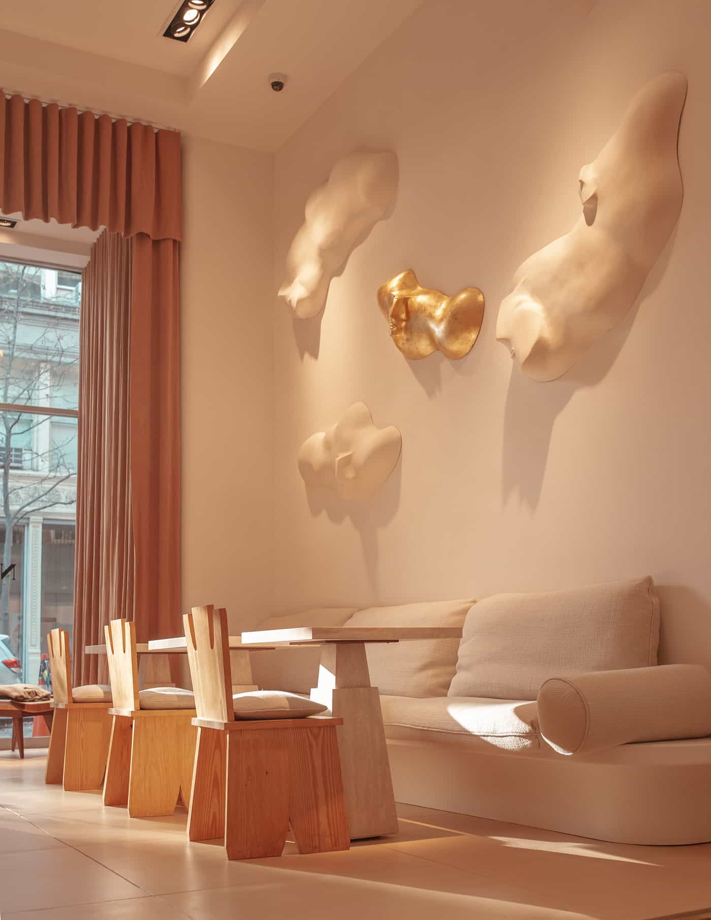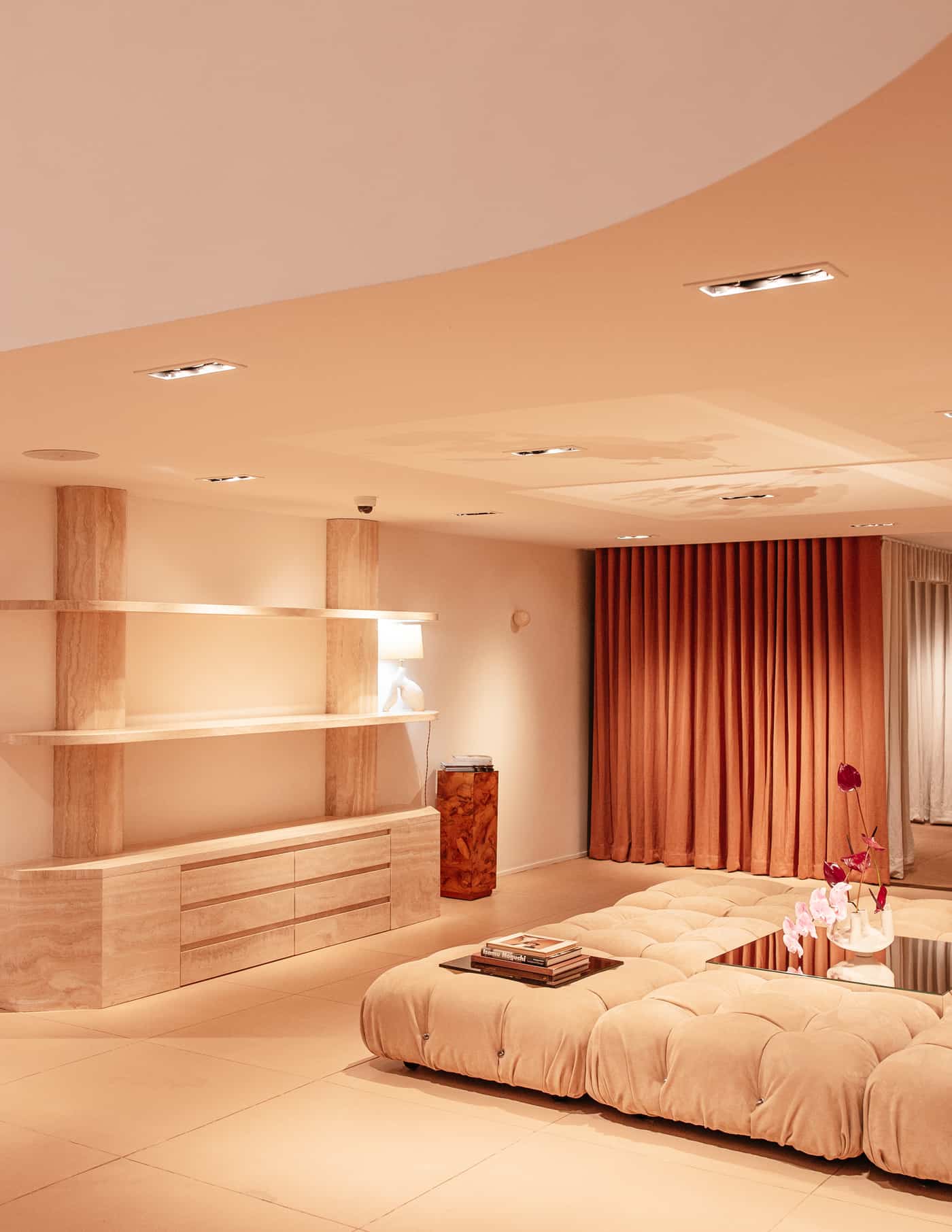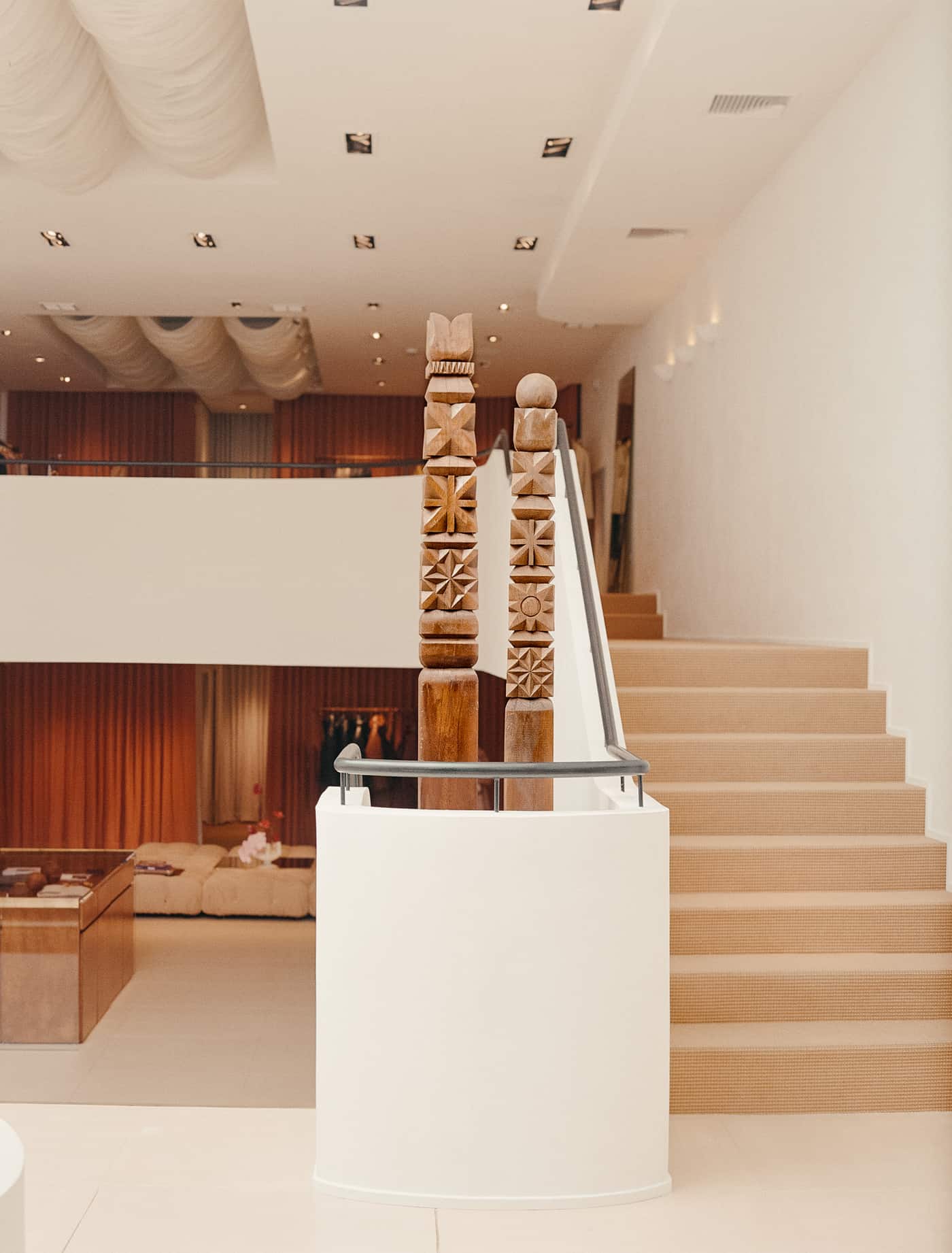 The interiors are like a cross between a sepia-toned 1970s living room and a contemporary art museum, with no shortage of sumptuous textures, soft hues—after all, this brand is famous for its pared back color palette of pinks, beiges and chocolate browns—and elegant pottery thrown into the mix.