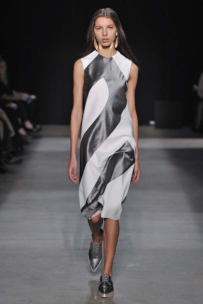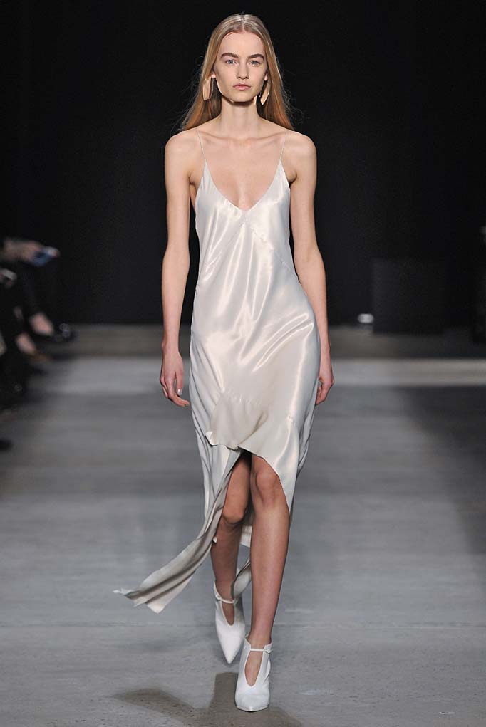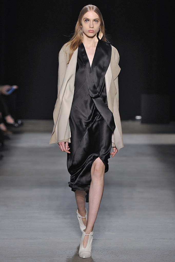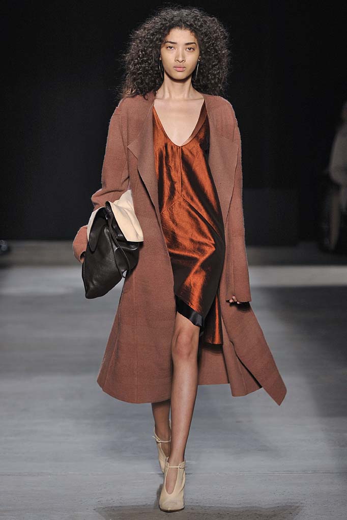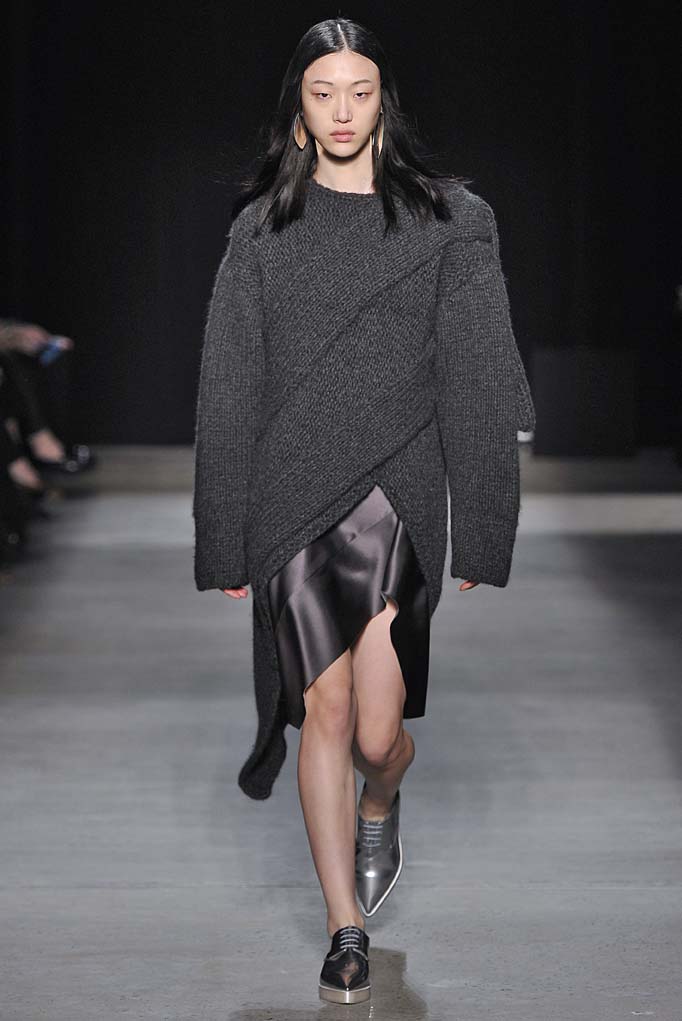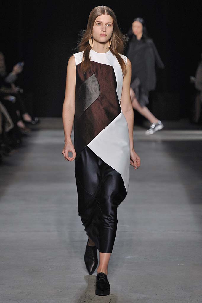 Who doesn’t love a minimalist silky slip dress from Narciso Rodriguez that can be worn in any season? Top that off with a thick knit sweater et voilà, winter ready. Perhaps this is the answer to the “buy now, wear now” retail dilemma, show versatile pieces—some of which can be worn year round. Monochrome assym dresses worn over pants felt equally perennial.