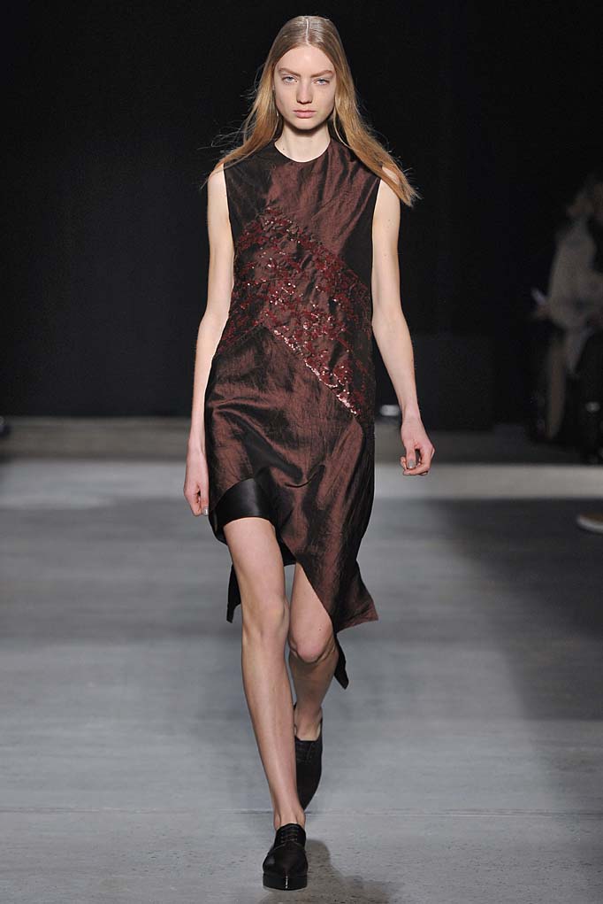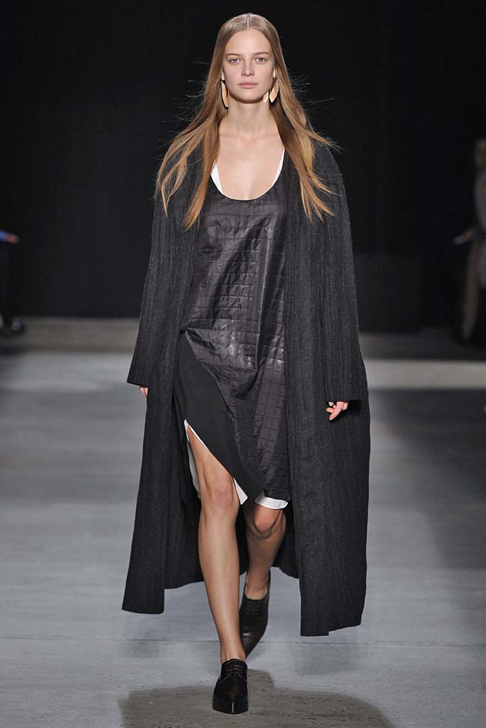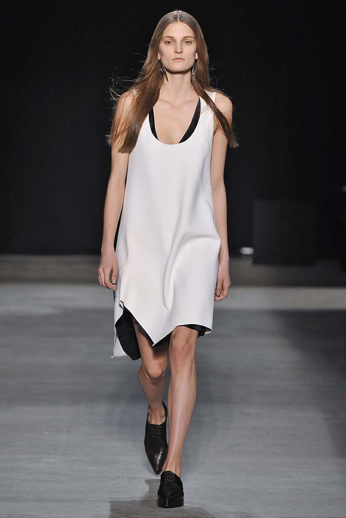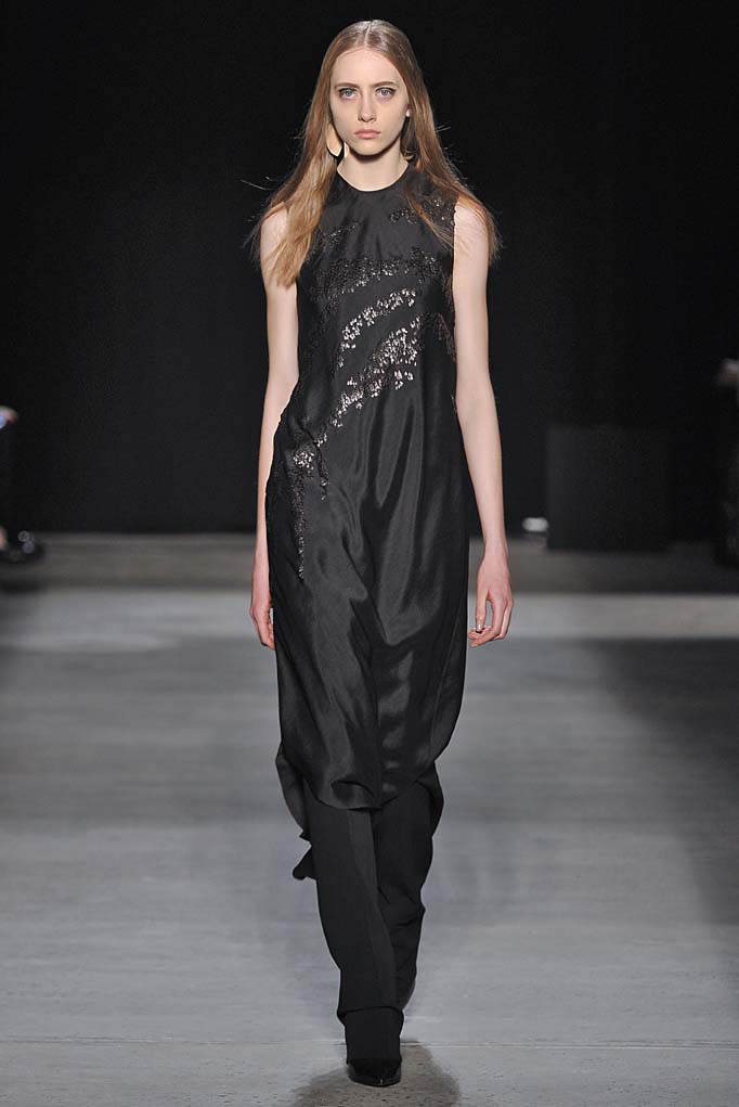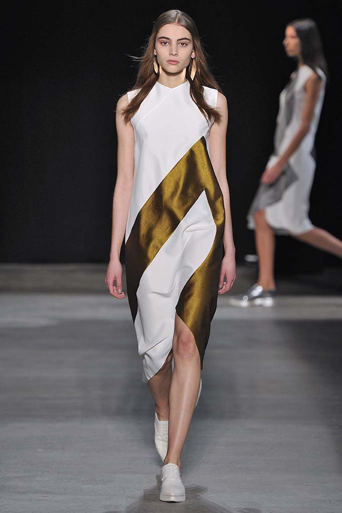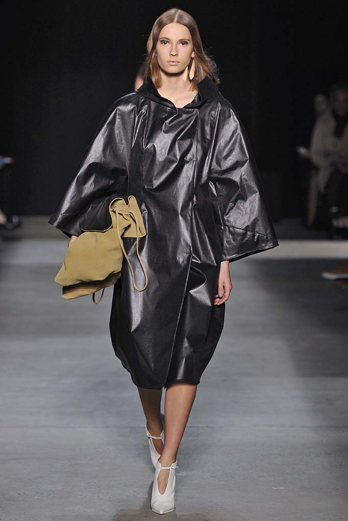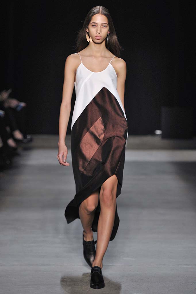Who doesn’t love a minimalist silky slip dress from Narciso Rodriguez that can be worn in any season? Top that off with a thick knit sweater et voilà, winter ready. Perhaps this is the answer to the “buy now, wear now” retail dilemma, show versatile pieces—some of which can be worn year round. Monochrome assym dresses worn over pants felt equally perennial.