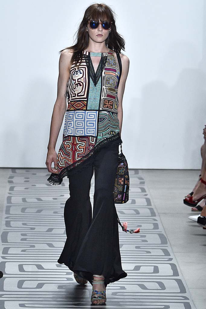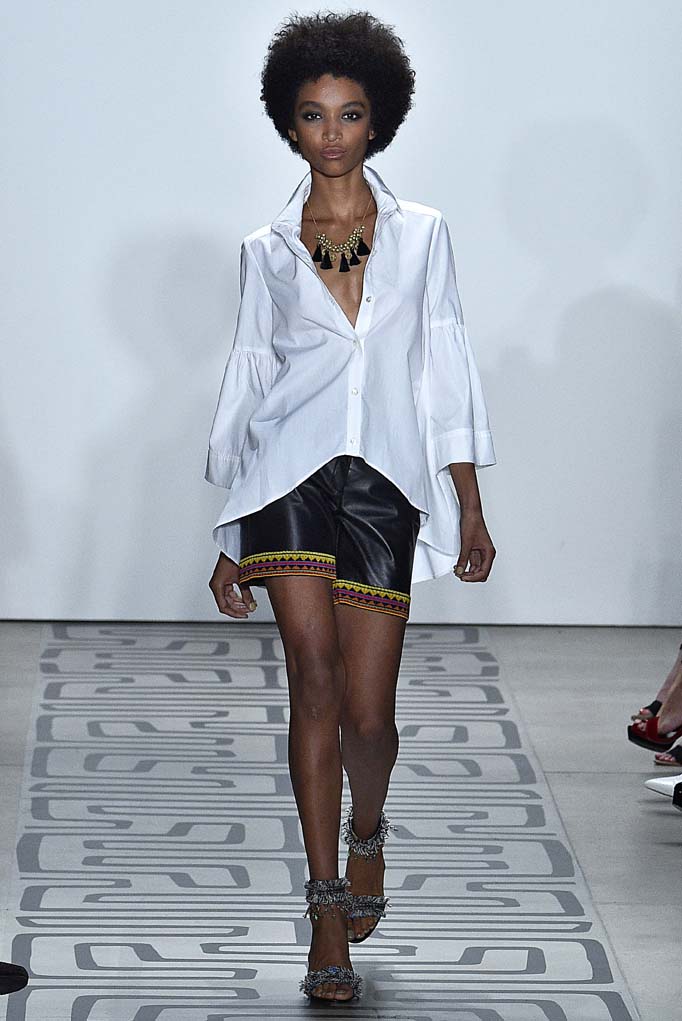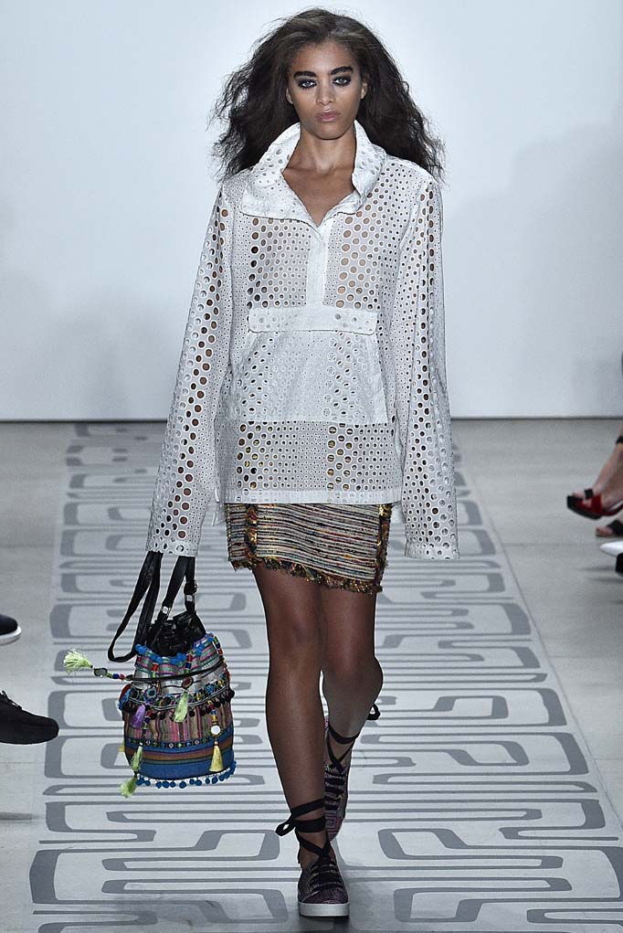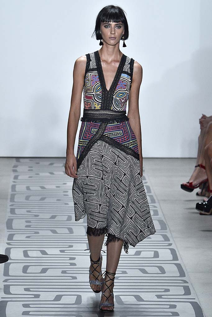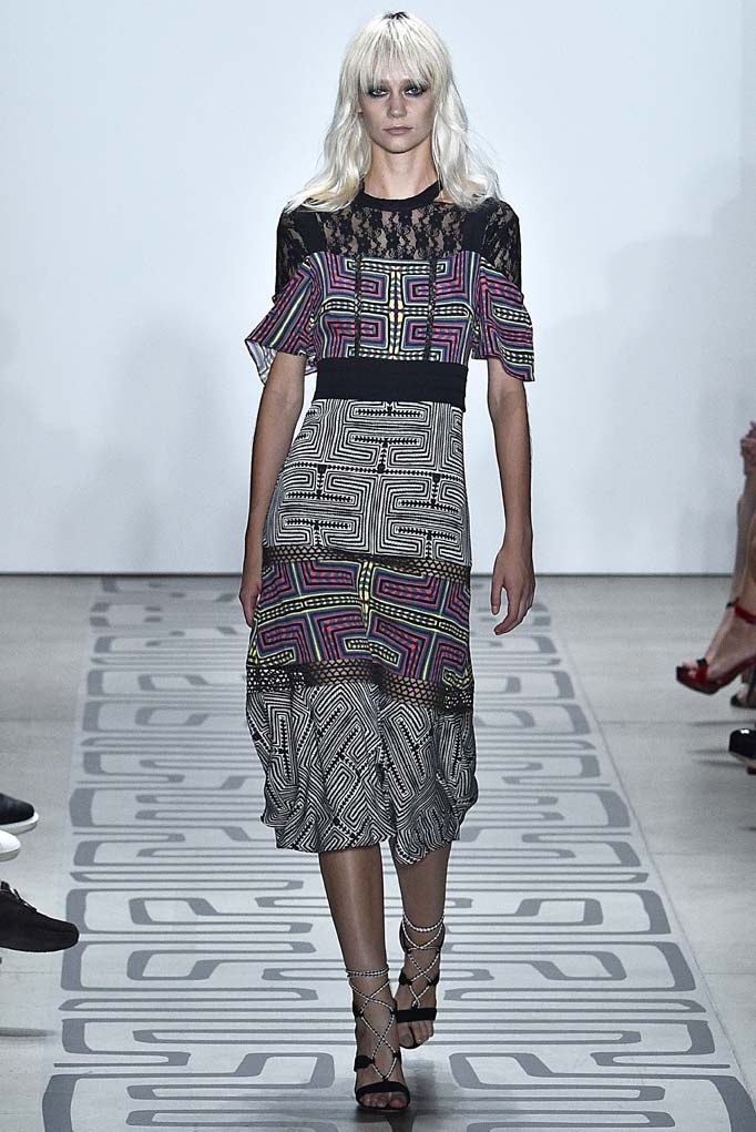 It’s all about the journey, n’est-ce pas? RISD grad Nicole Miller is classically trained as a fine artist, so it’s no wonder that in her world, a trip to a gallery could be the starting point of a new season. A recent exhibit on Panama informed her take on Spring ’17, and the collection was heavy on molas, the traditional dress worn by the country’s Kuna women. Body-con minis, lace tees, and cleverly embroidered necklines rounded out the offering, which is full of groovy options for hard-working city girls and globe-trotting world travelers alike.