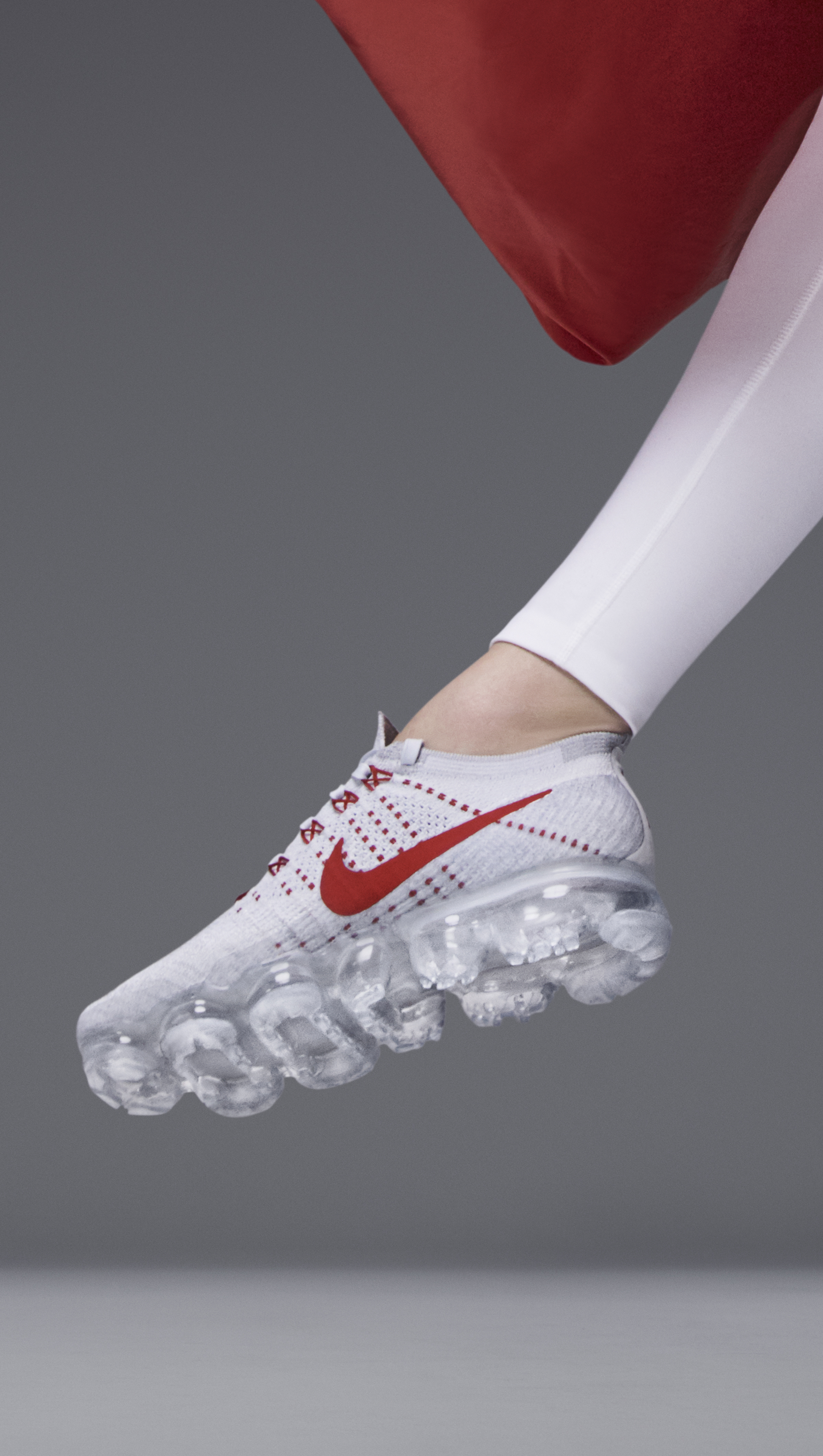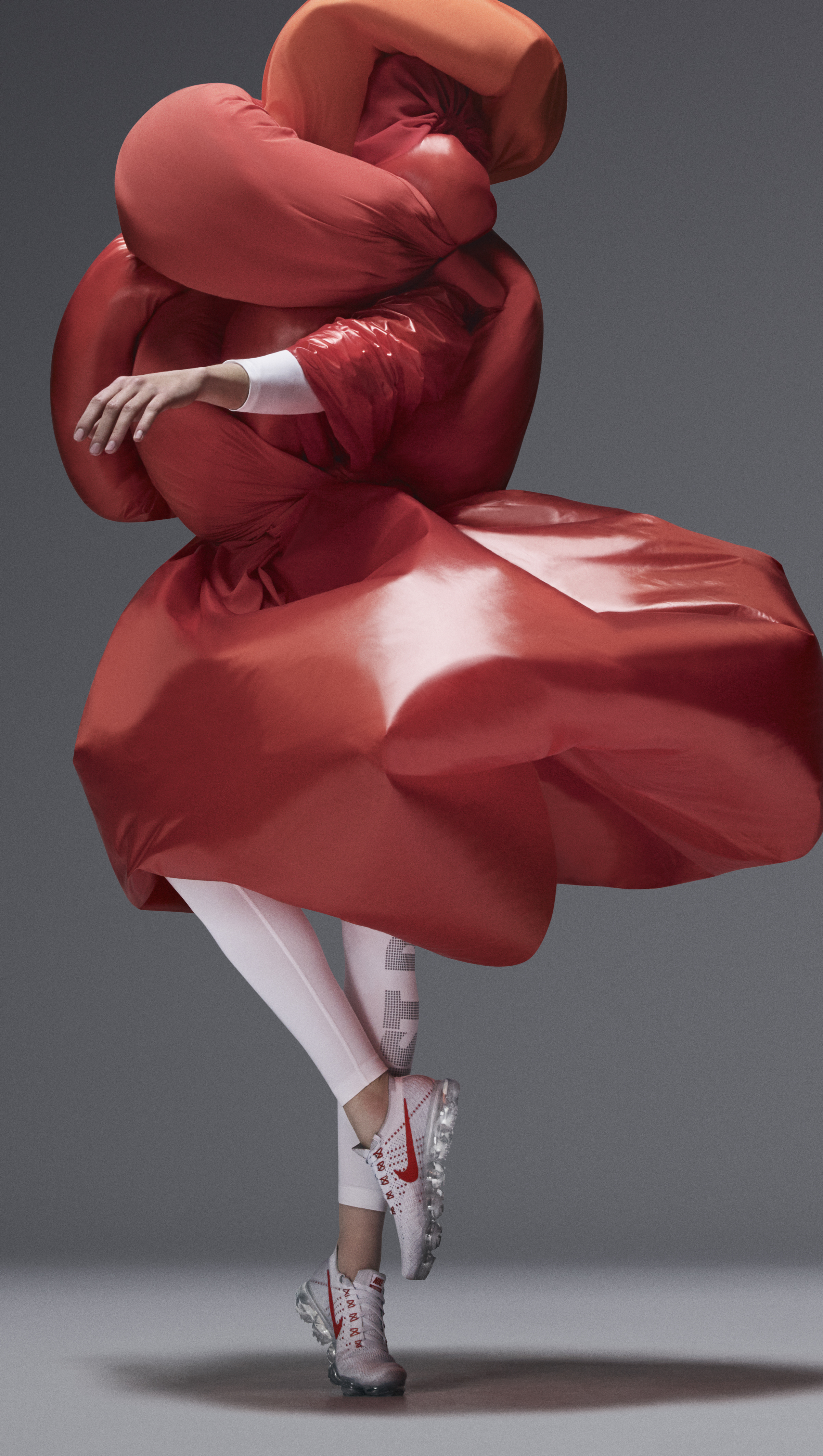 “The project surrounded the idea of garments that change shape through air and that interact with the environment. I have incorporated the idea of knots with a floatier feeling, and I have also documented the way the shapes change when air is introduced. I wanted to capture how the shape changes with movement and how it adapts to both the body and to air. I chose a subtle monochromatic palette of red and orange so that the focus remained on the structure of the garment and the VaporMax. The fabrics chosen are of different qualities of nylons, and the knotted drapes are padded with wadding to give an inflated effect.”