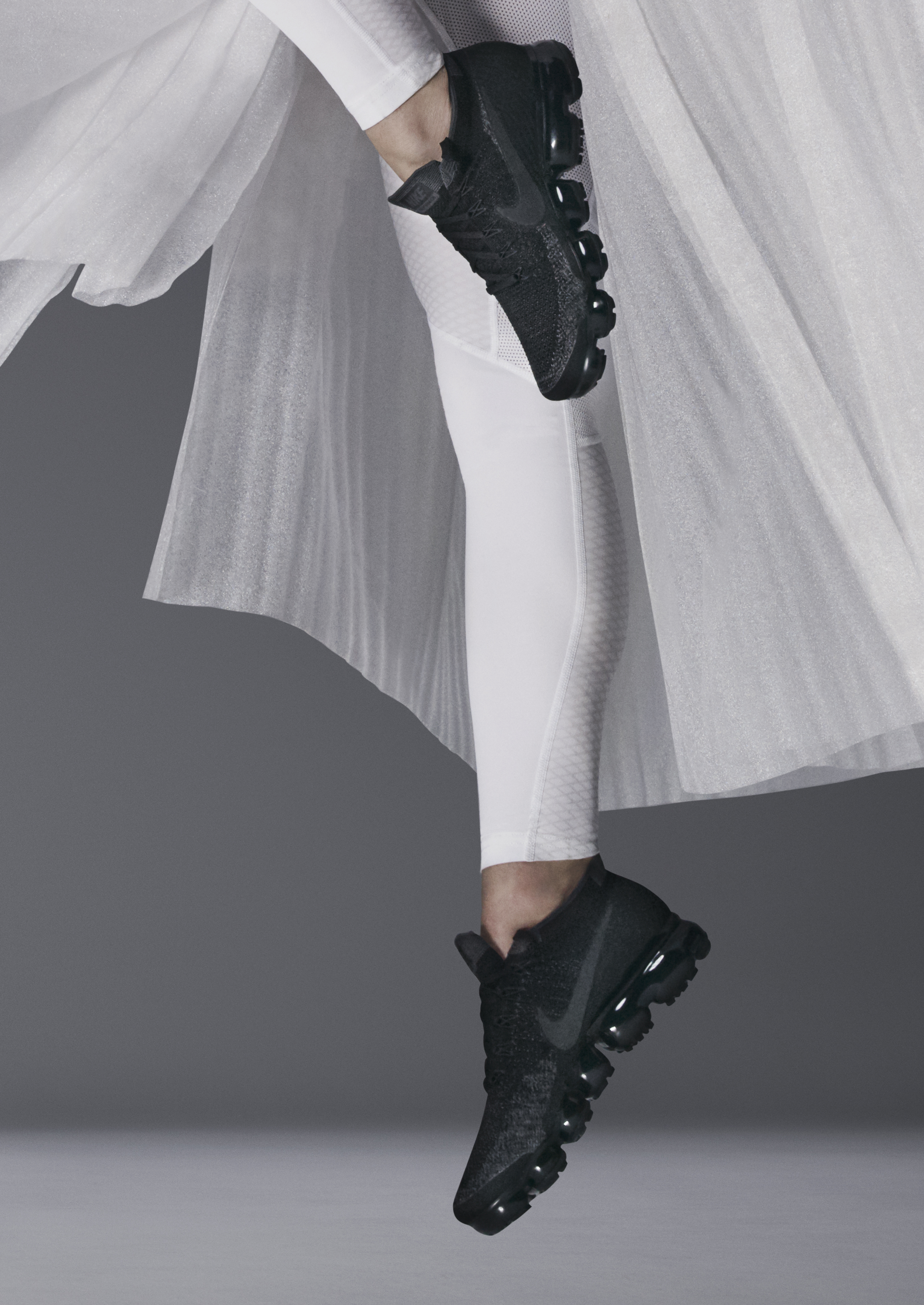 “Innovation and creativity require bravery. Success hides behind the continuous experience. For this collection, I used plastic packaging film as the material, which protects furniture from being damaged during moving. I chose this material because it is not a traditional clothing fabric. Design must be brave in this same way — to try a different way or angle, and to re-think and experience the process. Nike has this very spirit of innovation. The Nike Air VaporMax breaks with tradition by using new technology, structure and air to make the soles lighter and softer and provide consistent cushioning. Visually it may seem hard, but touching the VaporMax gives a completely different feeling. My dress is meant to provide the same effect, which looks like a solid sculpture. But it is, in fact, very light and flexible, allowing the body to easily move with the garment. I made this collection through weaving and knotting. There is no side seam or stitching. Nike Air VaporMax also uses new methods to create the shoe. Through weaving, the upper becomes one solid surface. No side seam gives the Nike Air VaporMax more breathability, softness and flexibility, and it reduces the weight. This less-is-more approach resulted in the exciting change that inspired me.”