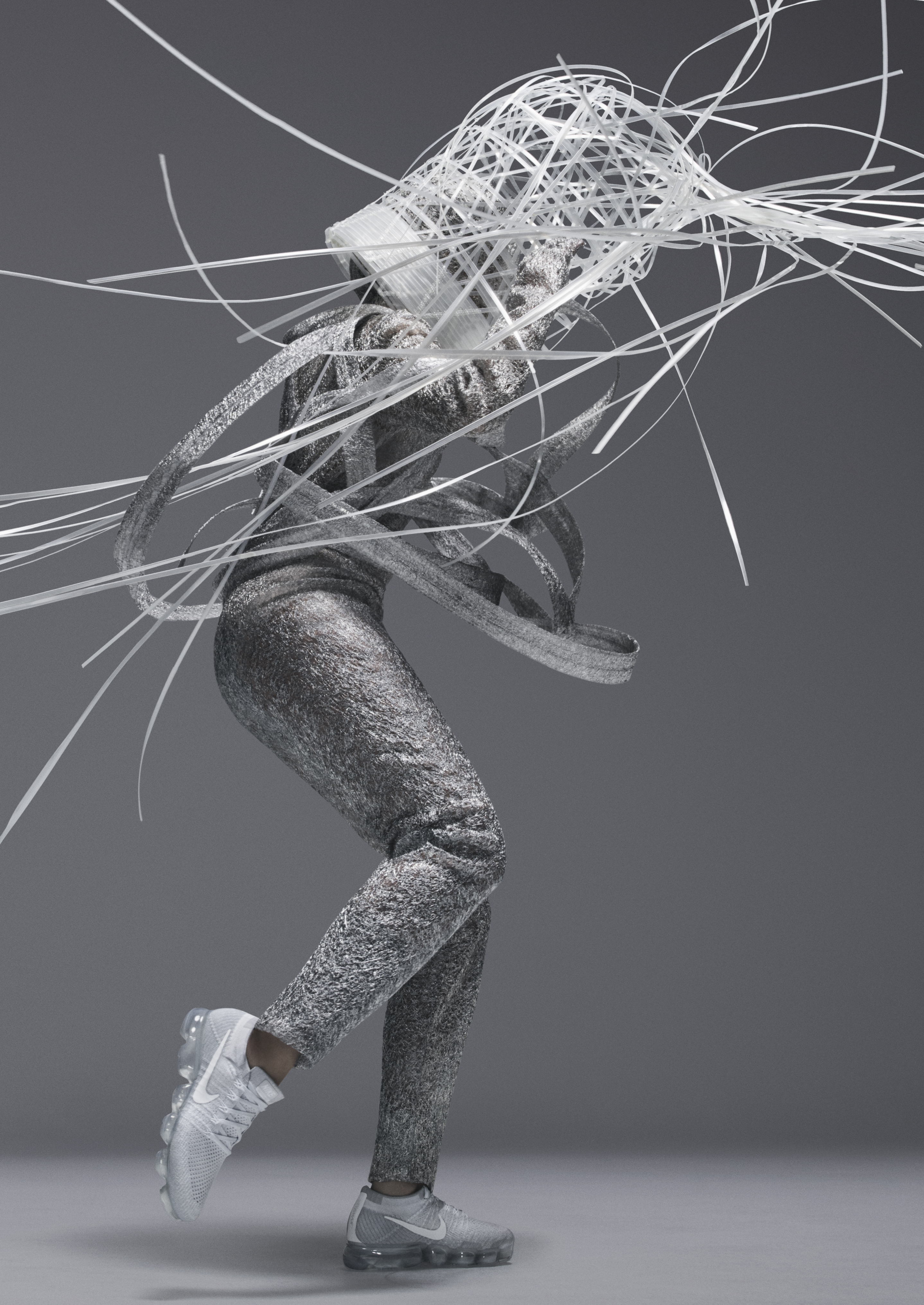 “The first idea came to life as an ode to all things airborne, with the lightness and flexibility of the Nike Vapormax providing a direct reference. The transparent air cushioning unit that acts as a standalone outsole inspired me to create a flawless outfit that creates harmony between body and environment. A sense of movement is evoked using a structural fishbone piece that floats around the body — an idea reinforced with a headpiece that was carefully woven, allowing a variety of shapes presented through emotions to slowly build a picture of texture and motion. Flyknit inspired the silver polyurethane textile used to make the full-length bodysuit. The material is moulded around the body seamlessly by heat. Its stretchable features allow the body to move freely and dramatically.”