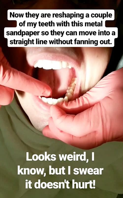 After that, they filed down the edges of a few of my lower front teeth. The reason, they explained, was to allow my lower front teeth to move into a straight line without having to pitch them forward. Since my lower teeth (like most people’s) are a little wider at the top than they are at the bottom, the only way to get them in a straight line is to either move all my teeth backward to give them more space, pitch them forward, or shave off a 10th of a millimeter here and there to allow them to turn easily in place. The filing took 5 minutes and I didn’t even feel it!