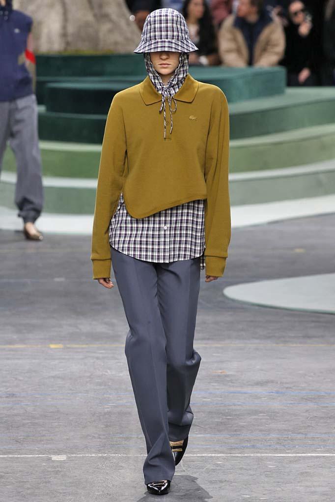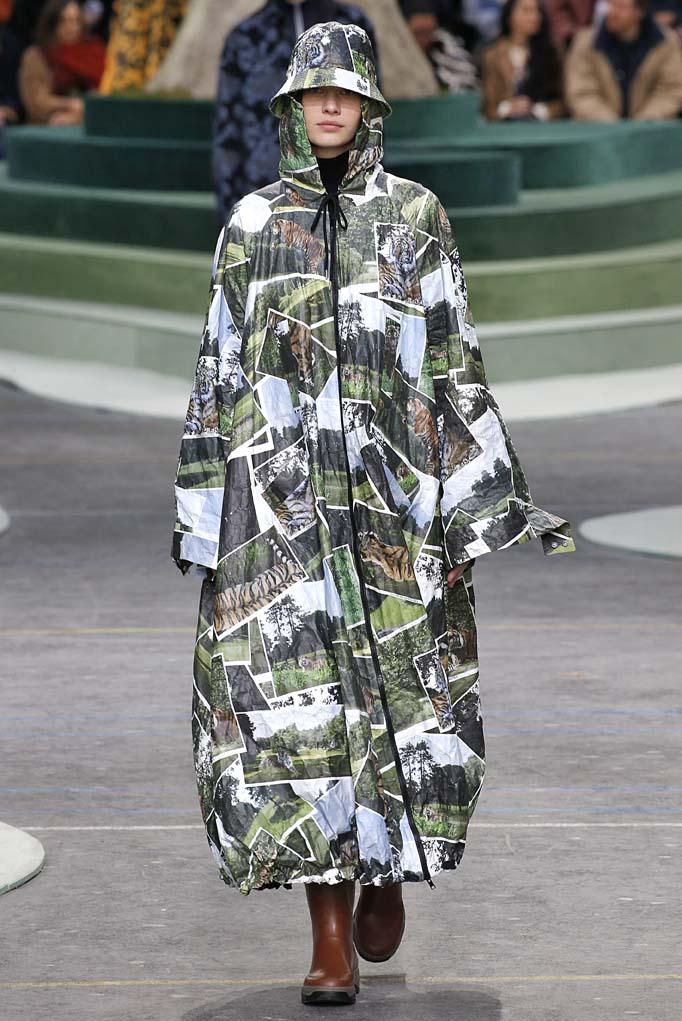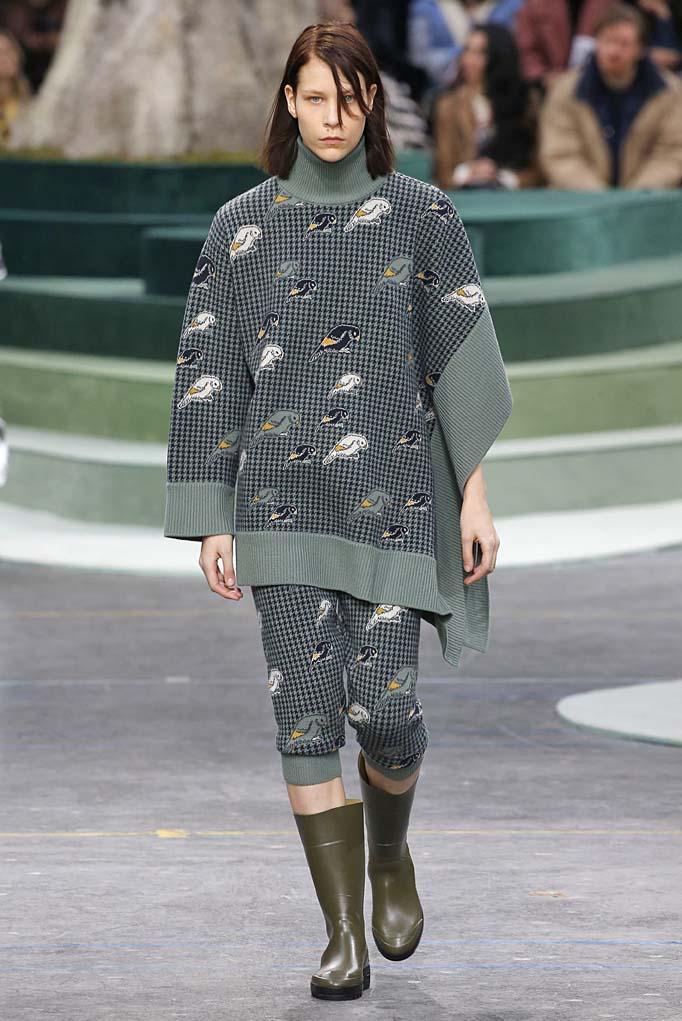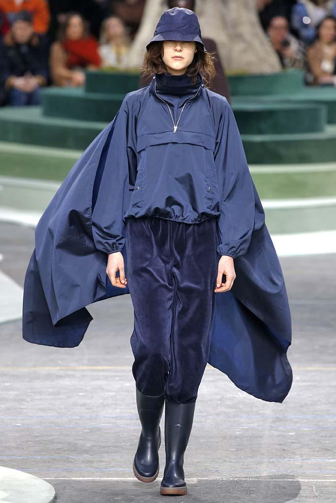 Lacoste’s fall 2018 collection was a perfect mix of nature and fashion: from raincoats drenched in jungle images to rubber-heeled boots, the brand represented “chic meets cool” at its best. The models wore very little make-up, all the better for them to display the checkered raincoats and the little bucket hats that accompanied many of the looks.