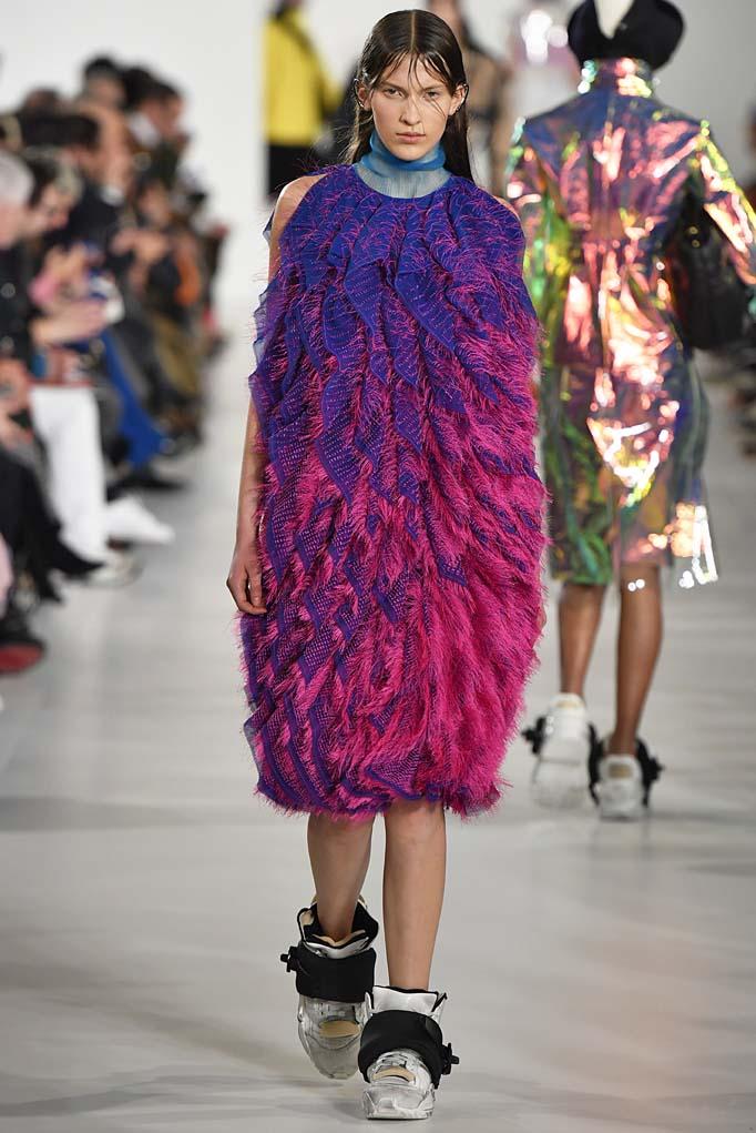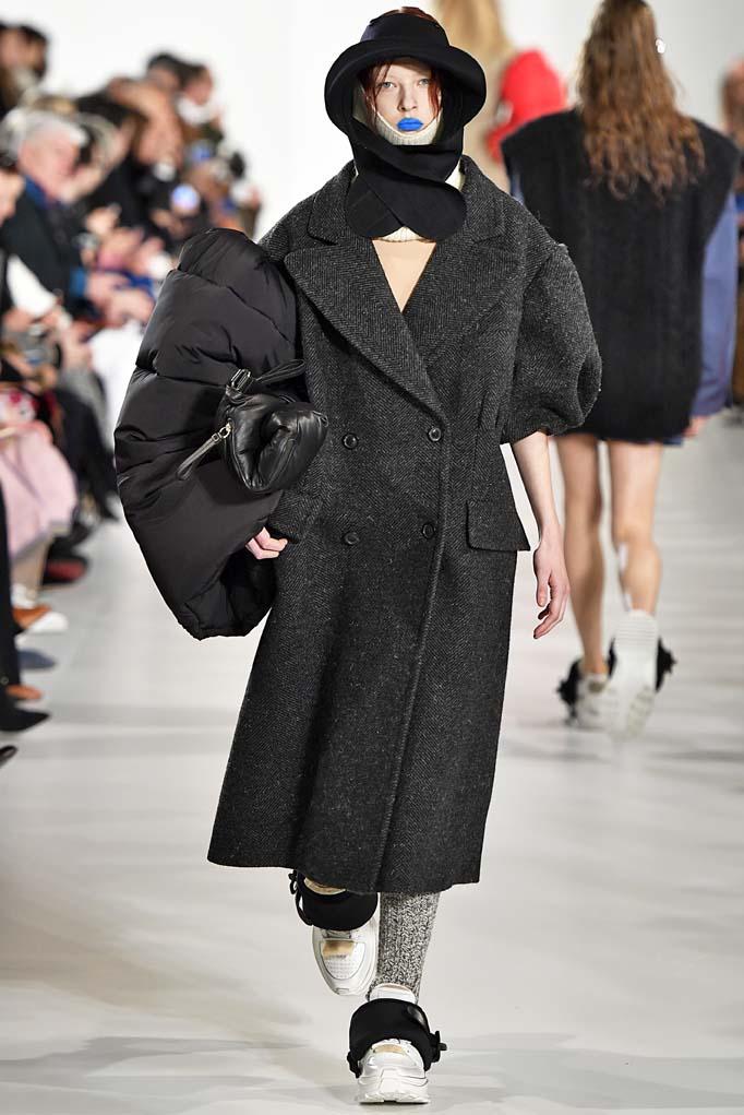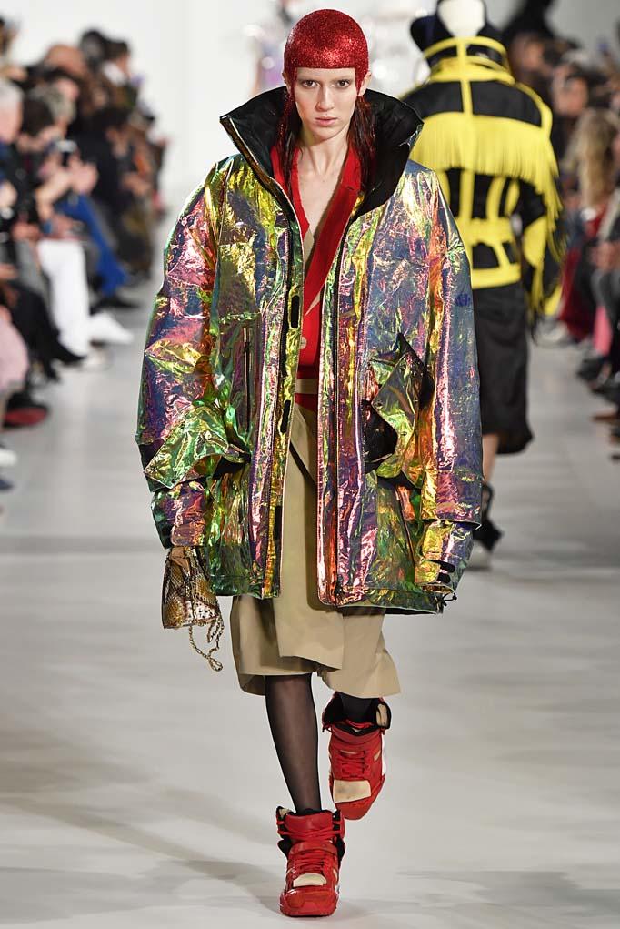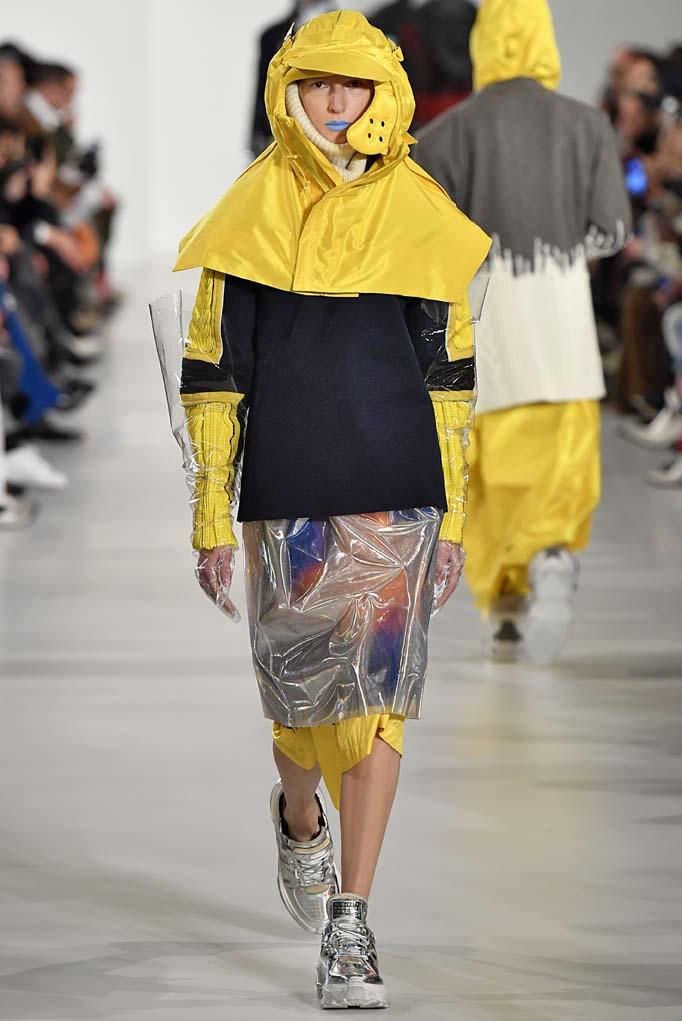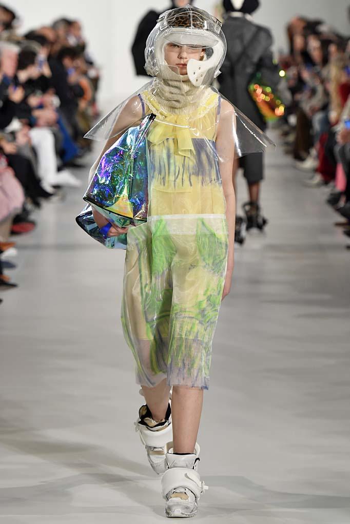 John Galliano mixed art and modernism at the Grand Palais for Maison Margiela’s fall 2018 show. The influence of streetwear and athleticwear was obvious in the oversized silhouettes and high-top trainers used throughout the collection. The bold color pallet featured a lot of black and irridescence with hits of neon yellow and something approaching Yves Klein blue popping up throughout. A large iridescent bag was a standout among the accessories, which, like the clothes, were generally oversized. Almost every look included a hoodie with a little hat over it and the use of clear plastic throughout the collection many of the looks a shape-shifting quality.