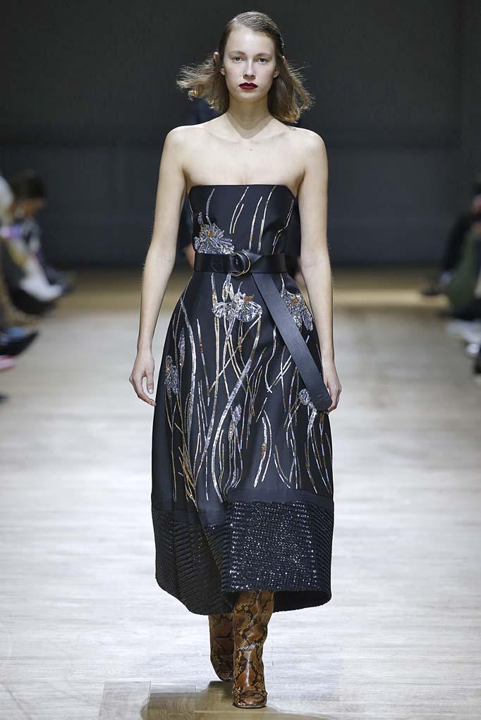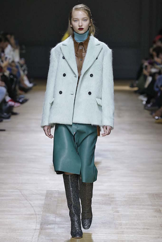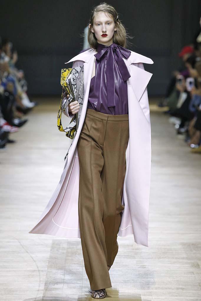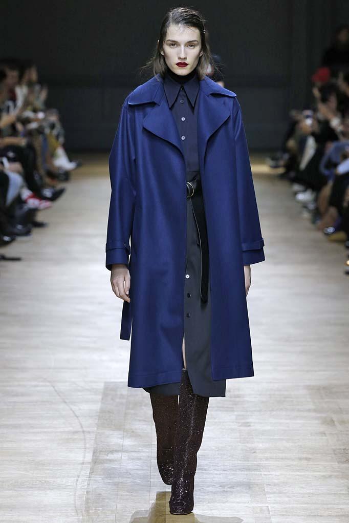Models walked down the runway at the Grand Palais accompanied by a dramatic soundtrack that made the atmosphere mysterious and glamorous. The first look, an extra-large brown suit, set the tone for a collection full of masculine influences. Oversized outerwear was mixed with ladylike separates and easy-to-wear dresses in a color palette that included brown, light blue, purple, green, gold, black and yellow. It was a solid, if not exactly groundbreaking, collection from designer Alessandro Dell’Acqua, who joined Rochas in 2013 when then-creative director Marco Zanini left the brand for Schiaparelli.