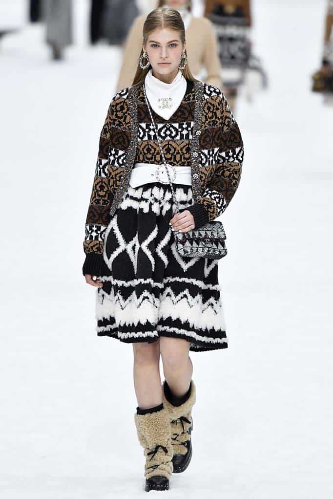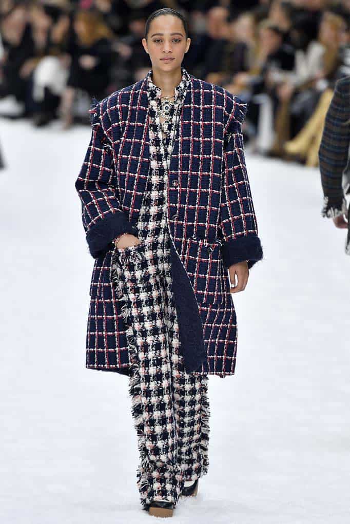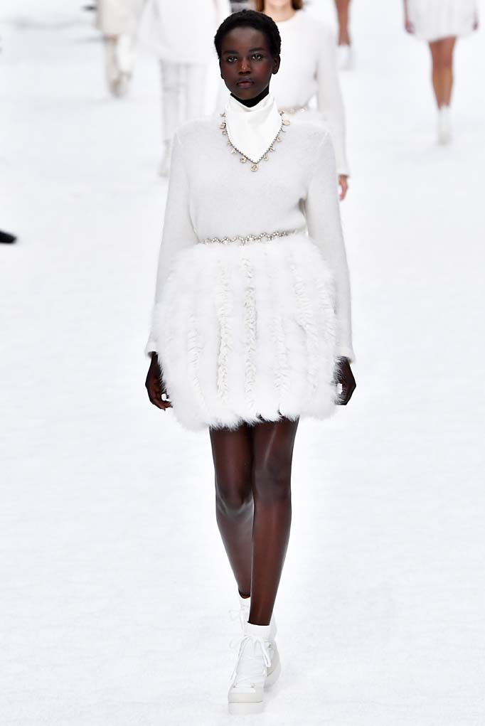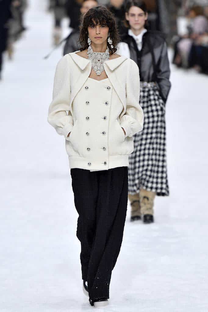 Chanel presented the last collection designed by Karl Lagerfeld before his death. The Grand Palais turned into the alpine town of Gstaad, covered in snow and with wooden houses and lit chimneys. A minute of silence preceded the show in honor of the “Kaiser” of fashion, followed by audio of Lagerfeld explaining his beginnings at the house. Sitting front row were some of his favorite muses: Claudia Schiffer, Naomi Campbell and Kristen Stewart. On the runway Cara Delevingne stood out wearing wide pants, a low-cut top and hat. Penélope Cruz surprised everyone looking like a bride in an all-white outfit with a feathered skirt and leather boots. My other favorite look was an outfit of white sequin pants with a black jacket. Overall it was a very emotional fashion show all things considered.