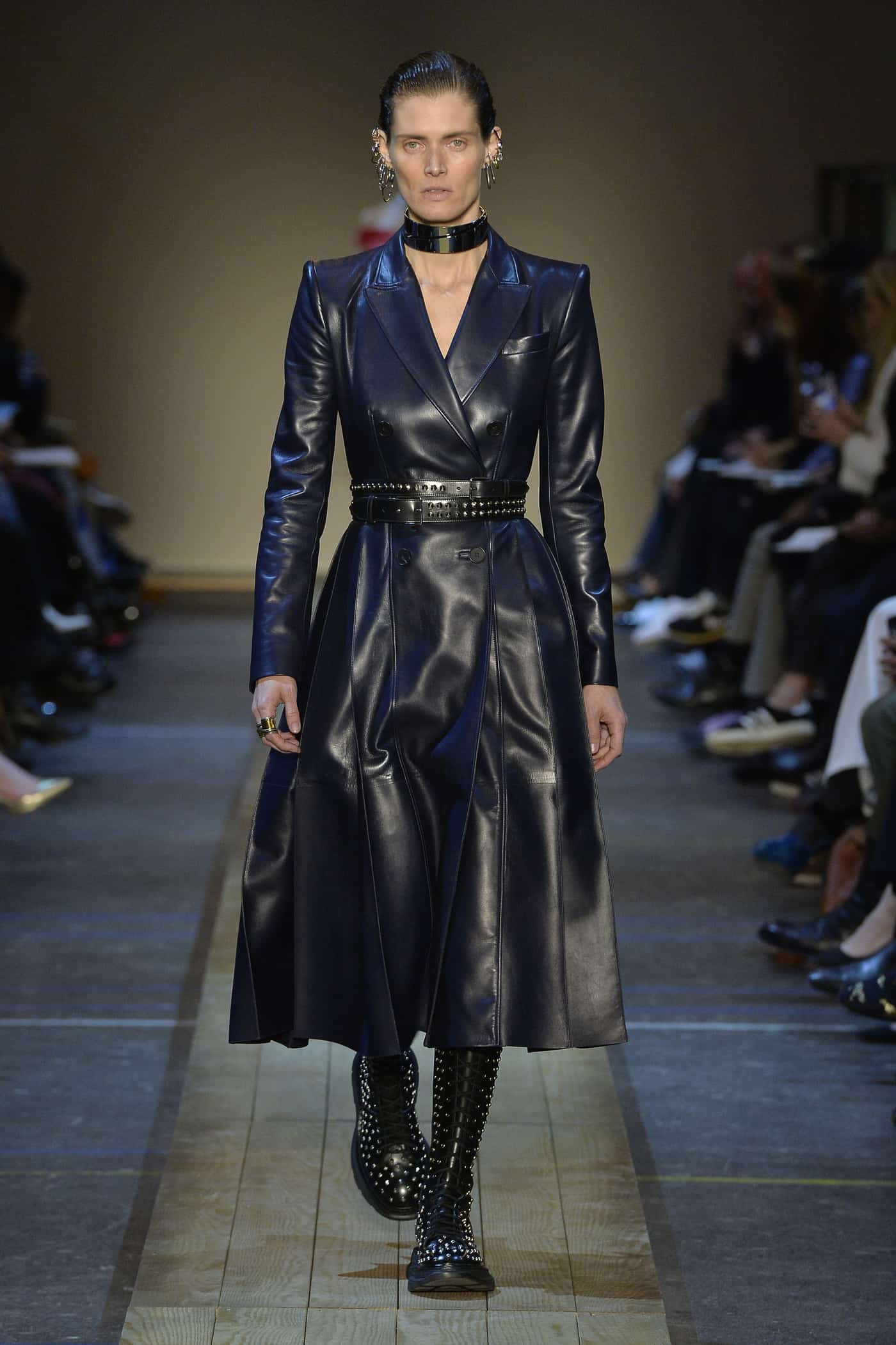 Instead of chairs or benches, guests at the Alexander McQueen show sat on rolls of cloth and wool from British mills. Sarah Burton returned to where she grew up — Northern England — for inspiration. The collection placed an emphasis on textiles, including leather, tulle, and wool. A dress with metallic laser-cut sequins imitated the sound of a factory floor when it moved. Voluminous dresses with leather belts at the waist kept McQueen’s spirit alive, especially the dramatic red taffeta gown that closed the show.