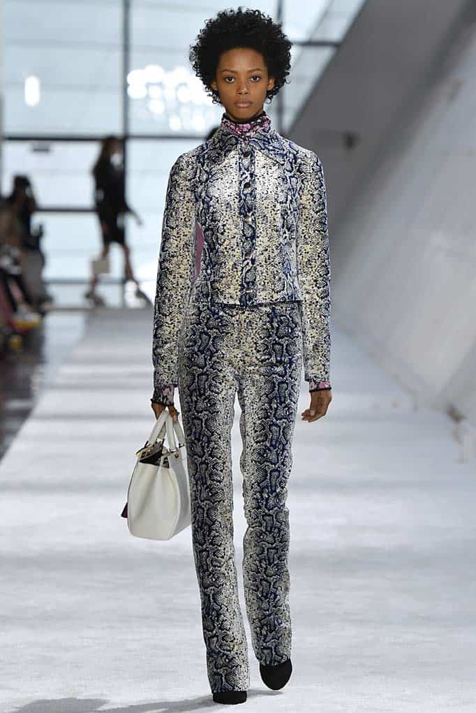 Stella McCartney invited several celebrities to view her new collection, including Oprah Winfrey, Janelle Monáe, and Karlie Kloss. McCartney, a known eco-friendly designer, further promoted her “There She Grows” campaign, which aims to help the endangered Leuser Ecosystem in Sumatra, Indonesia. The show featured several recycled dresses made from old shirts. The coats, in fall colors, had shoulder-pads in big sizes, while ones made out of brown faux fur featured printed phrases like “There’s no planet B” and “Earth Day every day.” Models also wore loose dresses in bottle green, pink, and yellow.