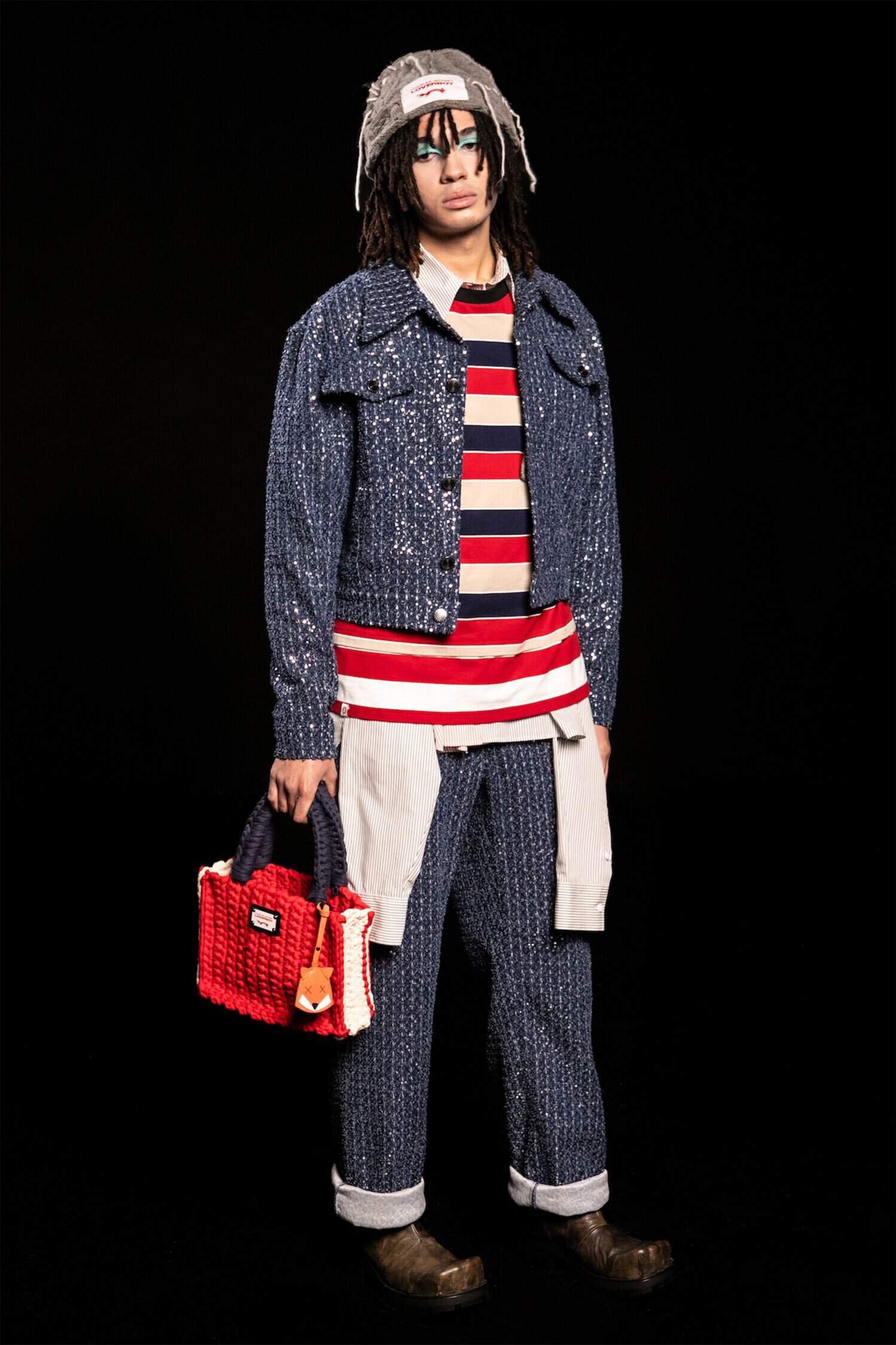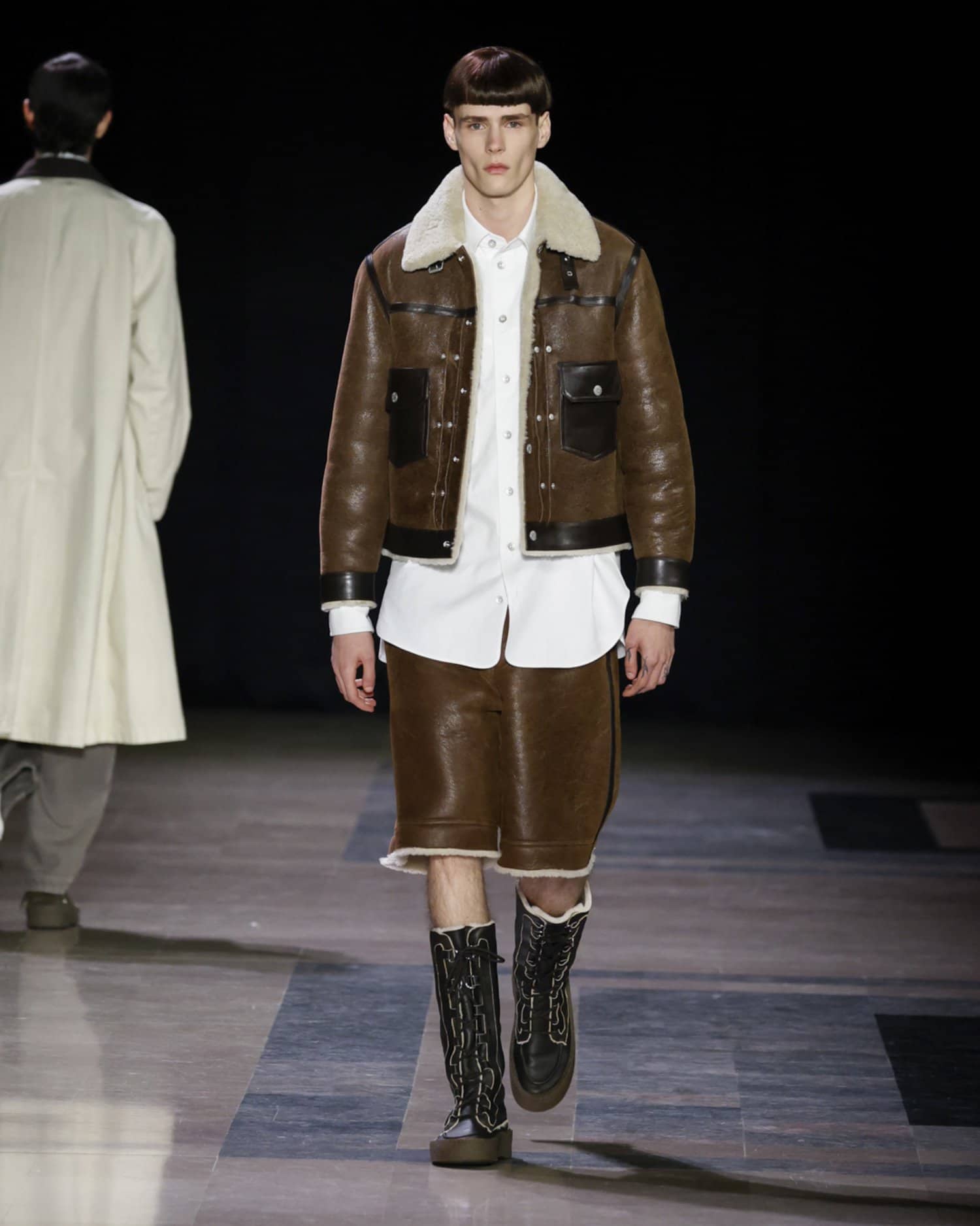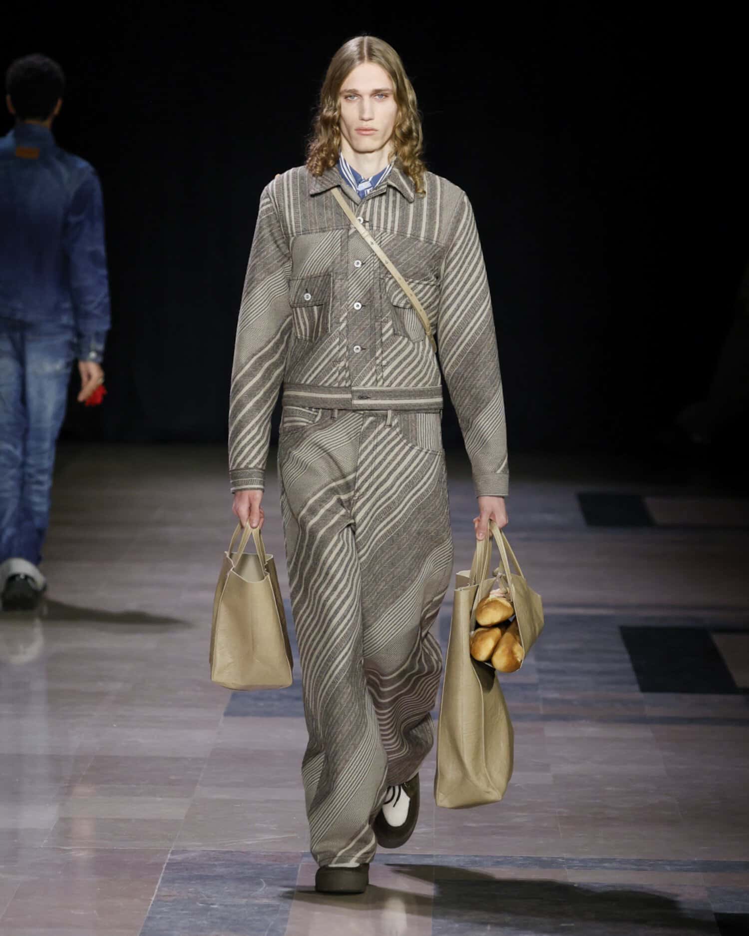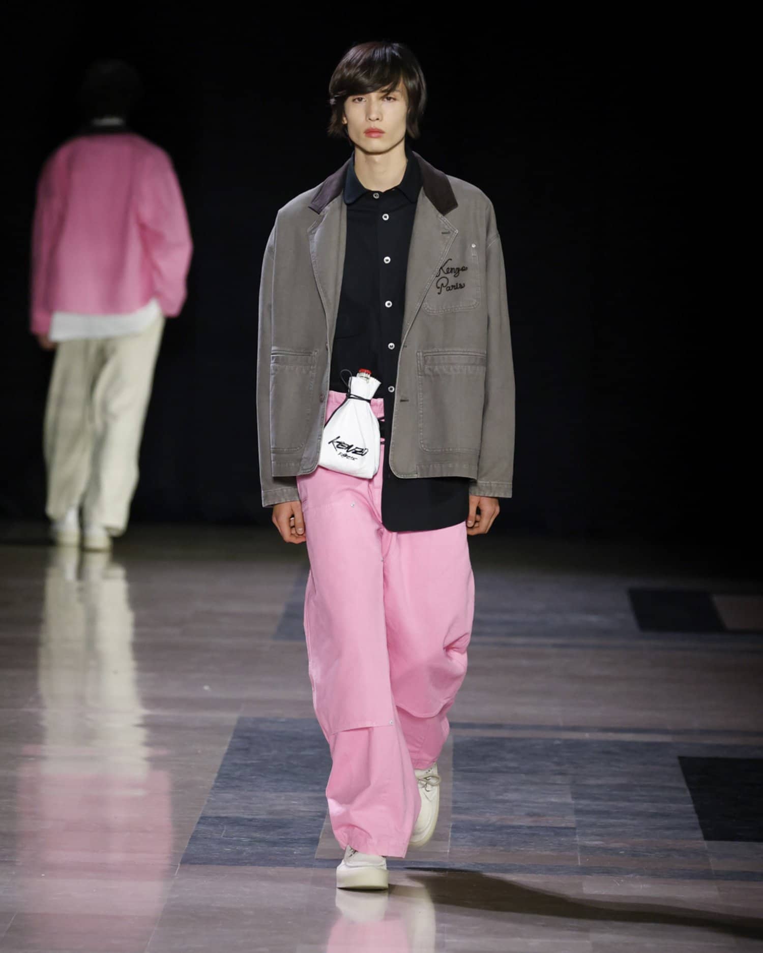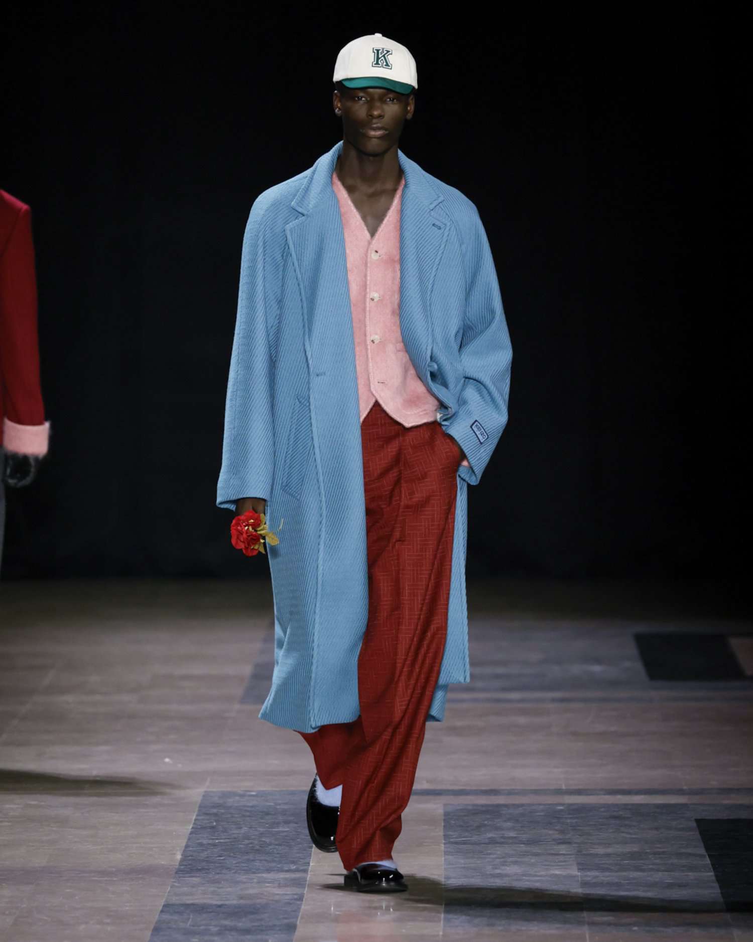 Nigo took a futuristic approach to his latest Kenzo collection, inspired by the brand’s Fall 1998 “Train Show” runway. In a similar vein, the creative director blended formal and casual dress codes when imagining today’s traveling gents. Mohair-cuffed utility jackets, wide overcoats, smooth sweaters, and buttoned waistcoats were layered over pleated trousers and sharp Japanese denim. Meanwhile, matching trouser and shorts sets with bomber, coach, and aviator jackets were cast in two-toned leathers and colorful floral patterns made by artist Futura 2000. Pouches, totes, and crossbody bags completed the range with a nod to nomadic lifestyles, while Nigo’s playful nature emerged with pops of yellow, red, pink, and blue—which have quickly become his signature colors of choice at Kenzo.