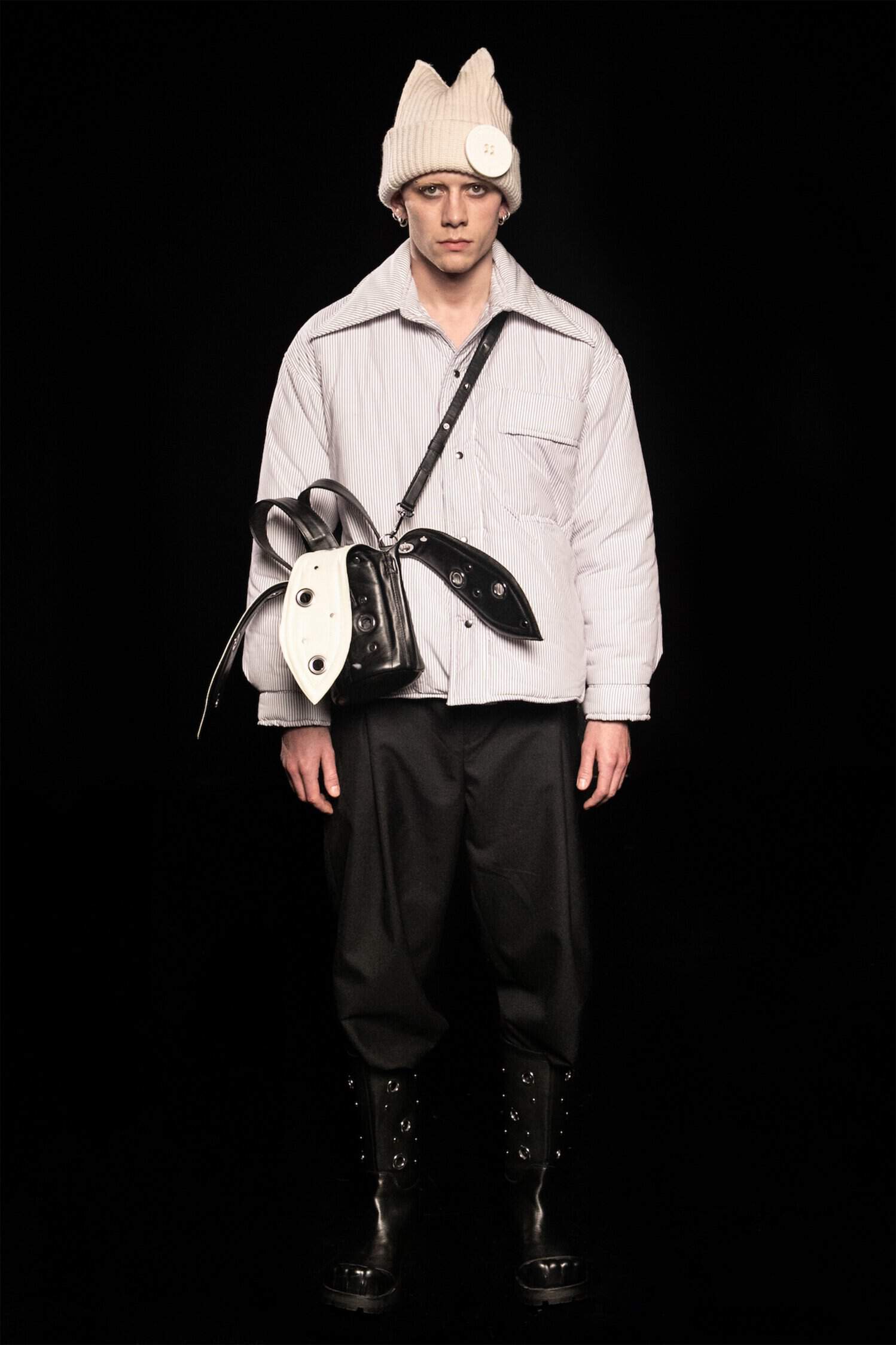 Charles Jeffrey looked to themes of passion and rebellion in his Fall 2025 collection for Charles Jeffrey Loverboy. Rooted in the need to push against convention, the designer showed traditional styles in revamped textures and silhouettes—from silky blazers covered in wide stripes to oversized tweed jackets, frayed miniskirts, and more. Punchy crocheted hats, bags, and more added a cheeky edge to the line—fitting, as they were made in collaboration with Pornhub. The line was complete with plenty of Jeffrey’s signature viral banana peels, seen across knee-high boots, motorcycle jackets, beanies, and crossbody bags—both in yellow and eyelet-studded black leather.