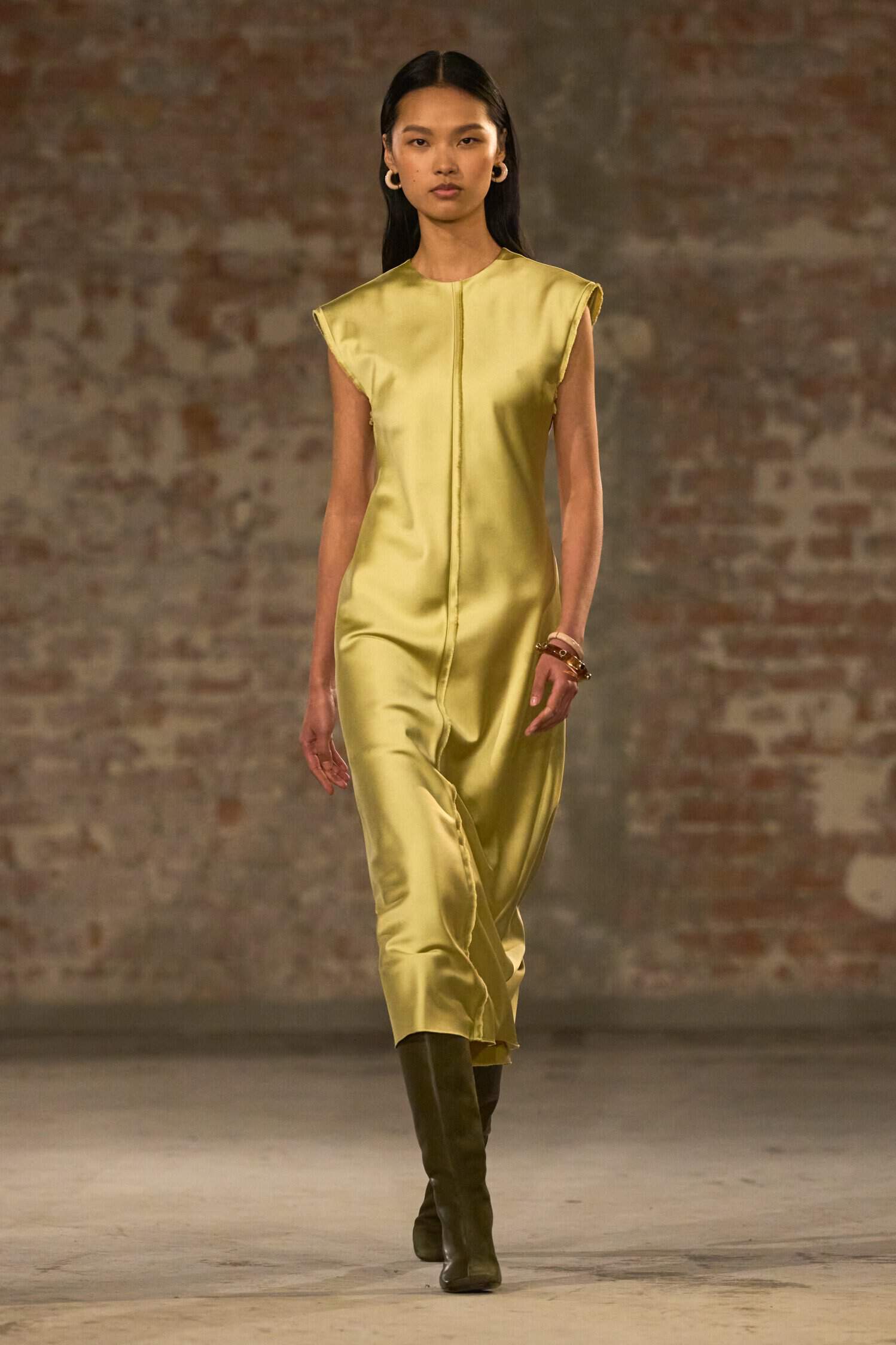 For Fall 2025, Alexandre Mattiussi embraced serenity in his latest collection for AMI. A bare brick building in Paris’ Rue du Faubourg Poissonnière neighborhood provided an industrial backdrop to the clothing, which was designed to hold a permanent place in its wearers’ wardrobes. Double-breasted overcoats, silky dresses, wide-legged trousers, and elegantly draped suiting and wide-legged trousers brought an ease to Mattiussi’s crisp palette of brown, gray, black, deep olive, cream, and light gold. AMI’s playful nature remained intact as well, seen in nonchalant nods like open plaid prints and soft leather bags. The show was given added star power with major model runway cameos, including Liya Kebede, Leon Dame, and Karen Elson.