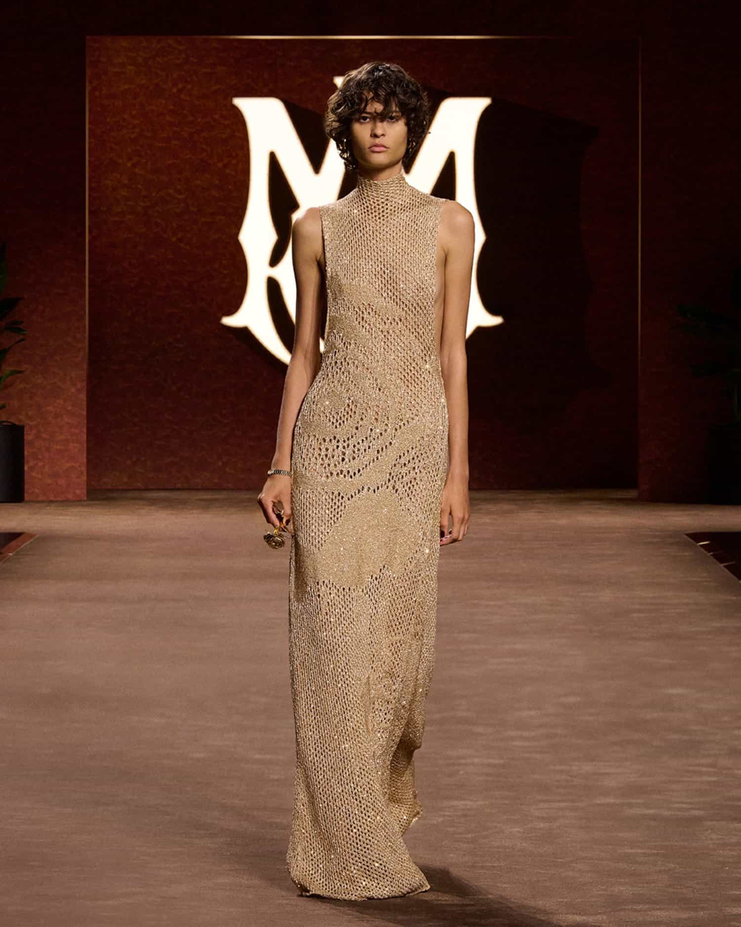 Romance was core to Amiri‘s Fall 2025 collection, which also featured the brand’s first foray at womenswear. Mike Amiri’s latest designs were set in the dreamy Hollywood lounge “Club Amiri,” populated by velvety men’s suits, sharp leather jackets, and plenty of embellished cardigans and sweaters in dark browns and reds, deep green, gold, and inky blue. A similar ethos was seen in his women’s offering, which included complementary relaxed suits and tuxedos—plus draped silk and metallic knit dresses with an array of sleek clutches. The range was complete with the label’s equally sharp Art Deco-inspired eyewear, while gold-dipped roses brought the runway show a luxuriously romantic feel.