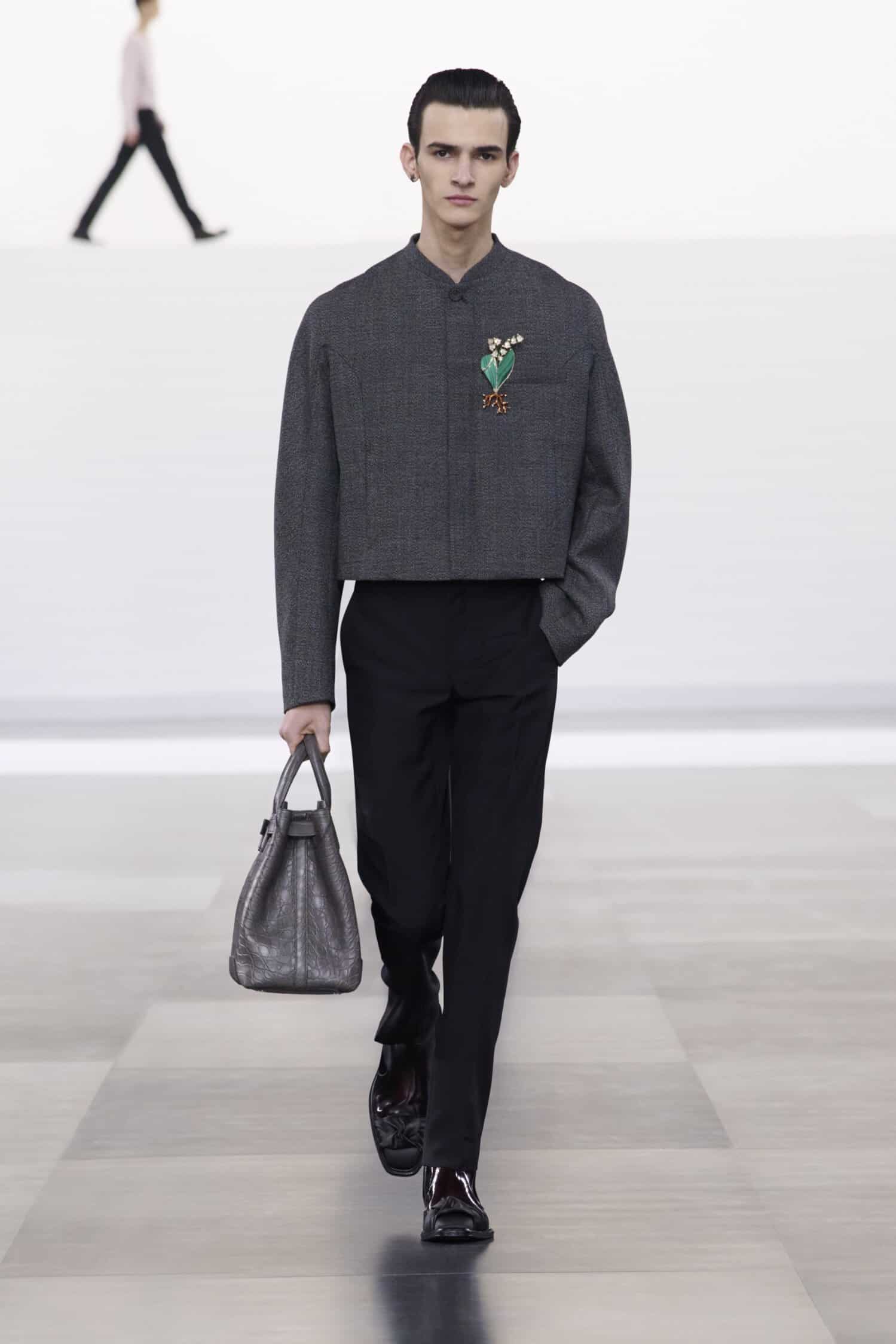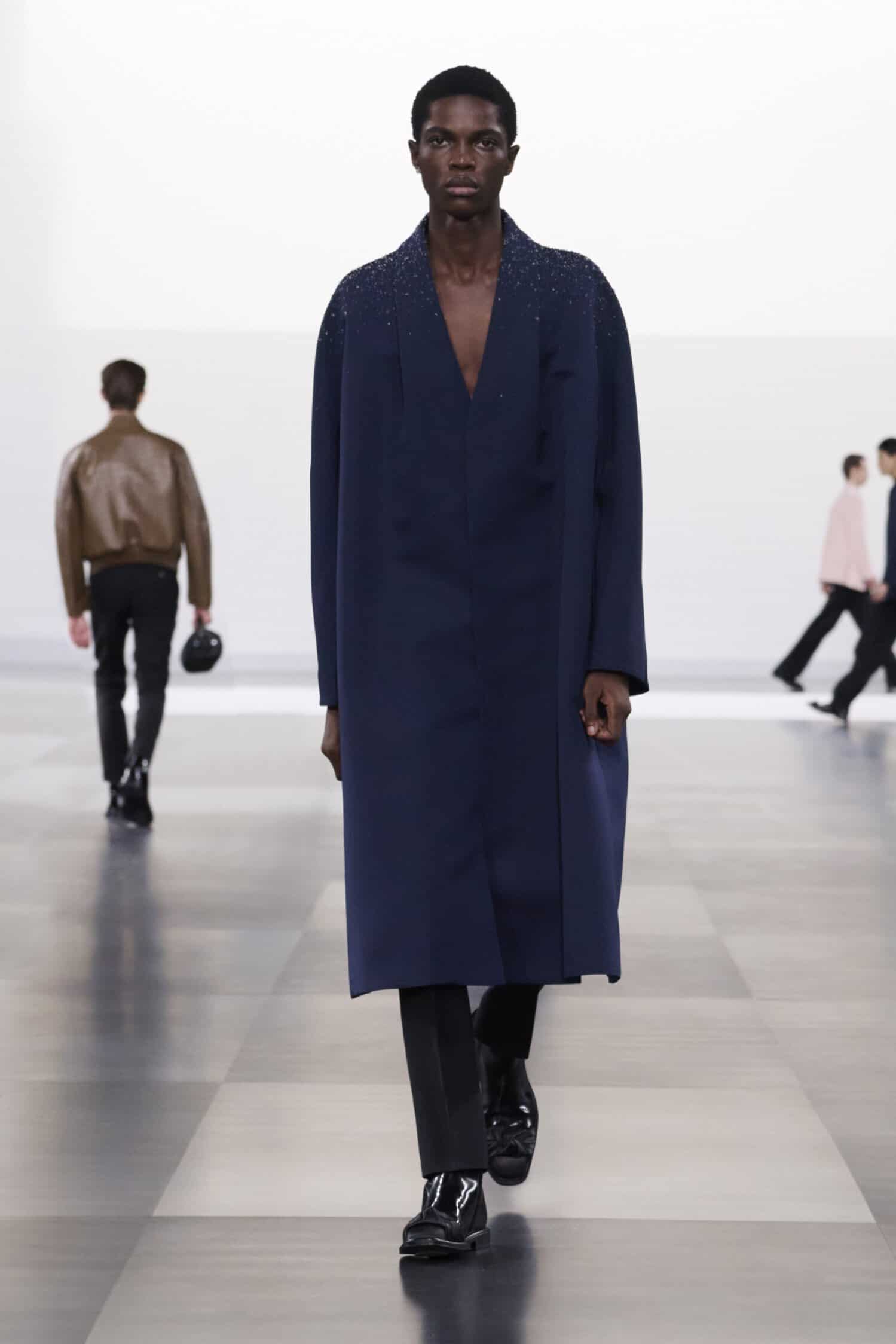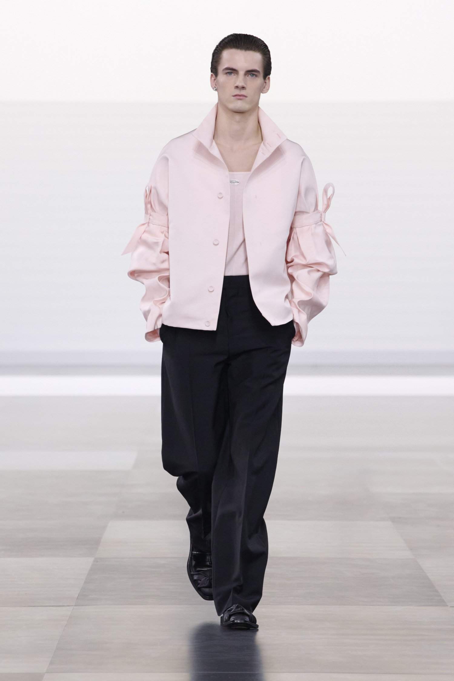 Monsieur Christian Dior’s Ligne H—a women’s silhouette made to simplify post-war dressing—served as chief inspiration for Kim Jones’ latest Dior menswear collection. That simplicity took center stage with a minimalist palette of pale pink, white, black, and various shades of inky blue and brown. However, Jones’ silhouettes and techniques were far from simple. The designer utilized styles that have become his signatures at Dior, revamped with textures from smooth silk to reptilian embossments—including wide-legged trousers to draped bombers, sharply cut jackets, and subtly oversized suiting. Nods to womenswear came in the form of bow-tied armbands, rounded top sleeves, and subtle splashes of crystals, all culminating in a viral finale look: a pale pink coat cinched with a knotted wash and covered in light gray and silver floral patterns, sequins, and beadwork.