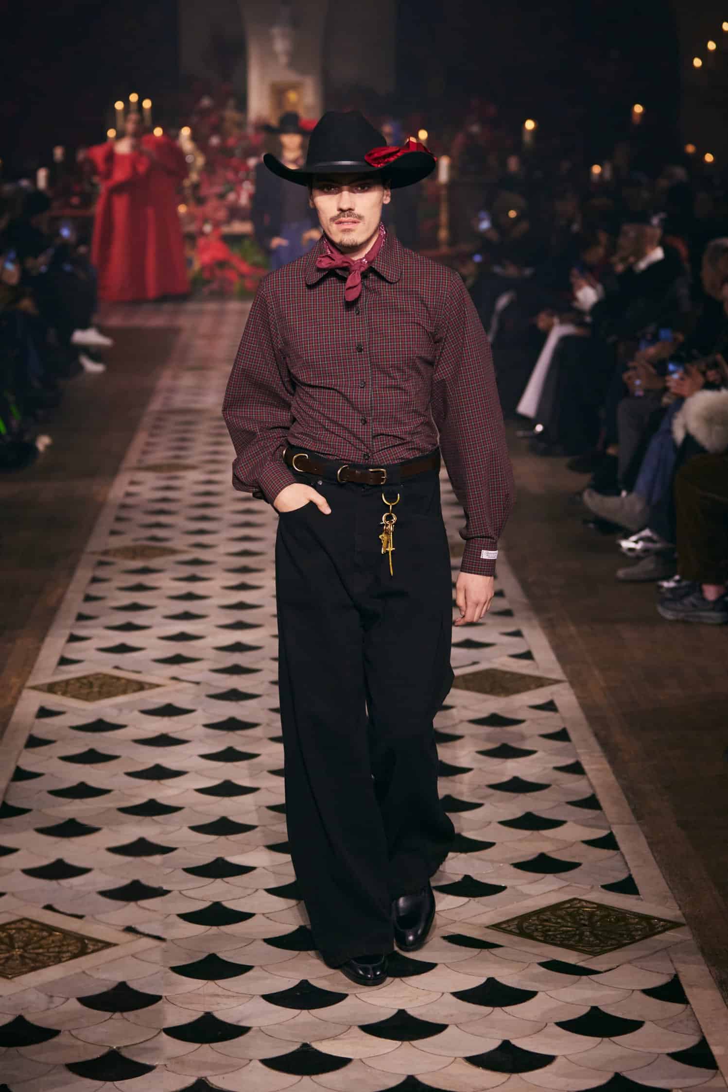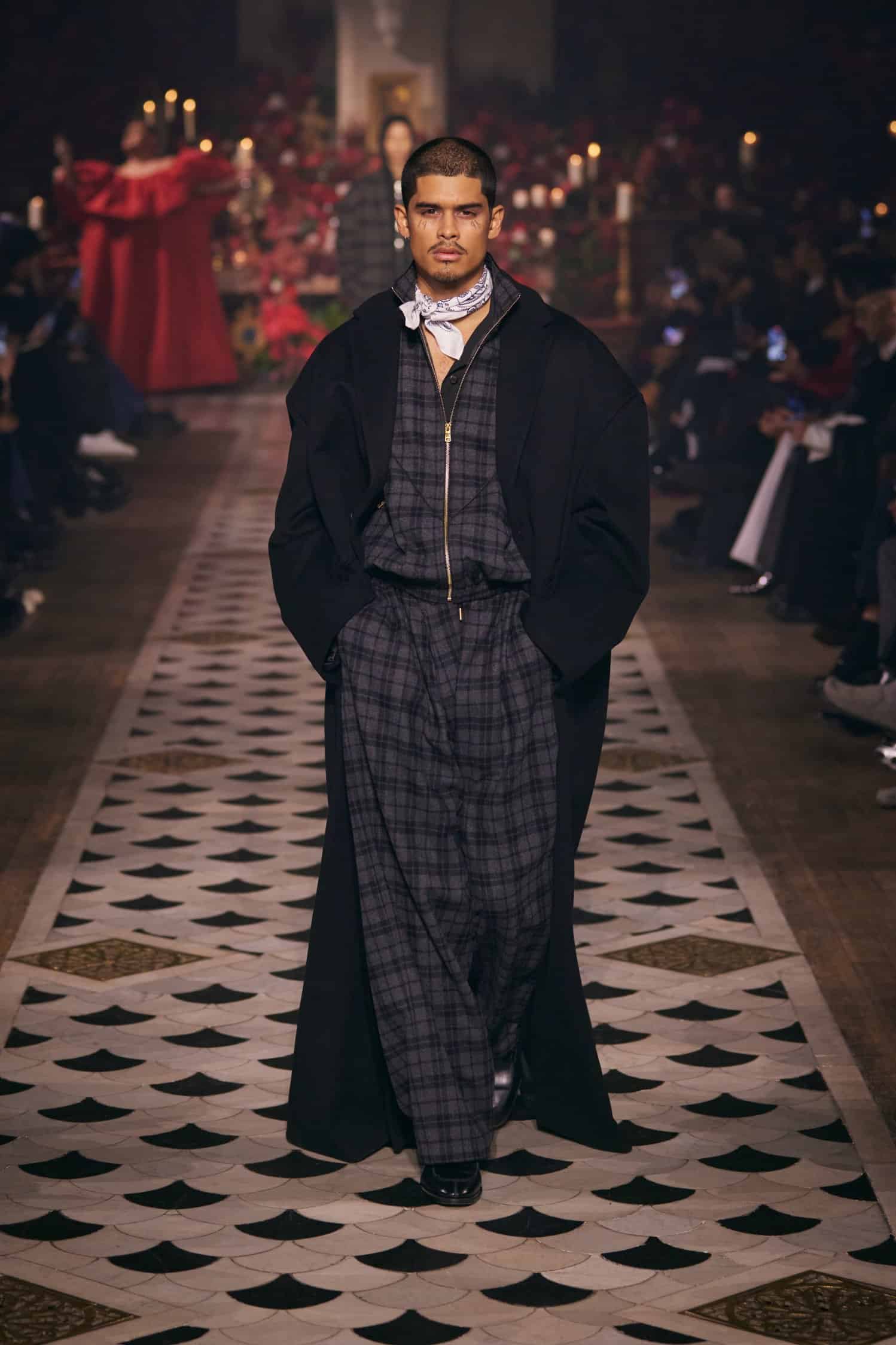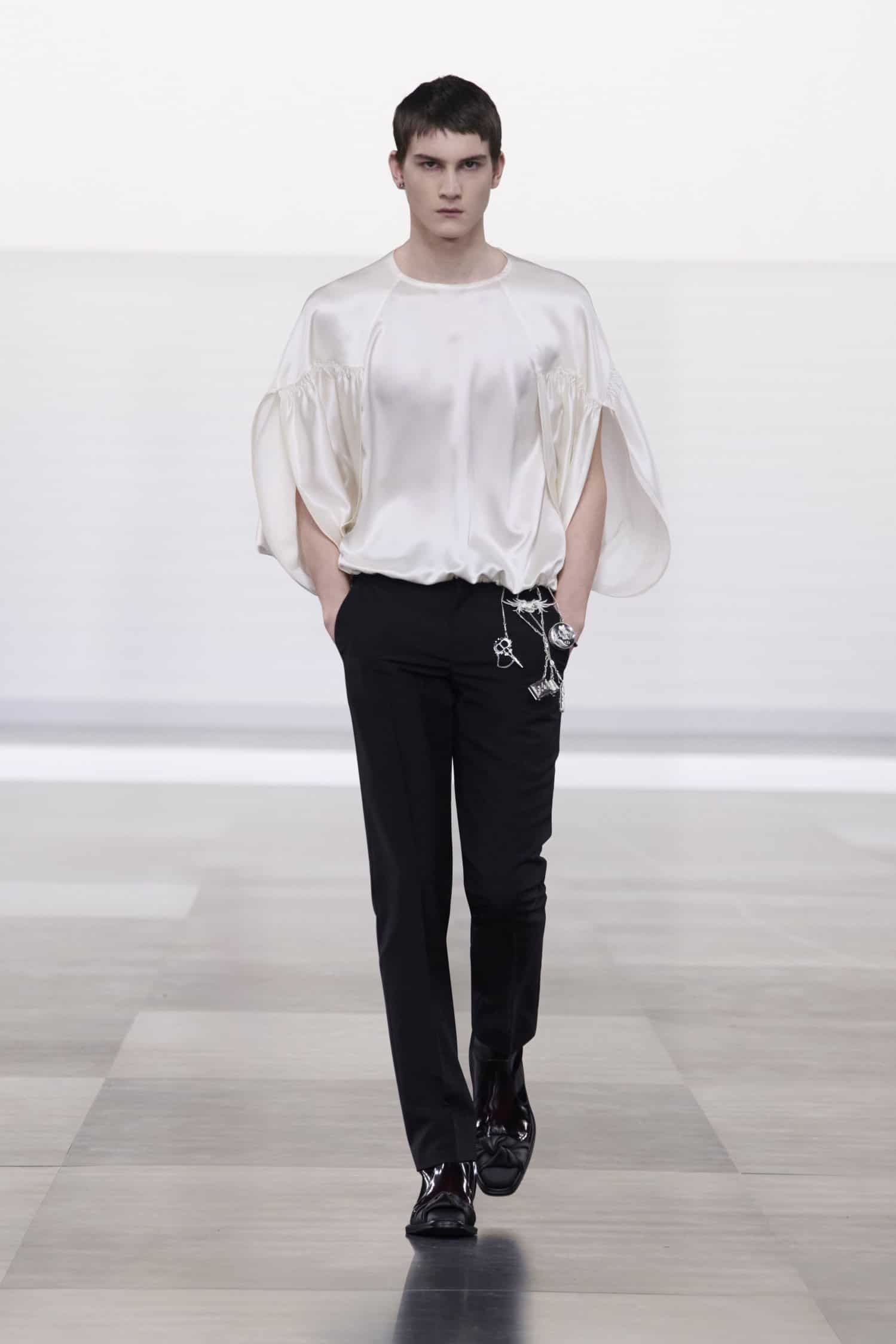 Monsieur Christian Dior’s Ligne H—a women’s silhouette made to simplify post-war dressing—served as chief inspiration for Kim Jones’ latest Dior menswear collection. That simplicity took center stage with a minimalist palette of pale pink, white, black, and various shades of inky blue and brown. However, Jones’ silhouettes and techniques were far from simple. The designer utilized styles that have become his signatures at Dior, revamped with textures from smooth silk to reptilian embossments—including wide-legged trousers to draped bombers, sharply cut jackets, and subtly oversized suiting. Nods to womenswear came in the form of bow-tied armbands, rounded top sleeves, and subtle splashes of crystals, all culminating in a viral finale look: a pale pink coat cinched with a knotted wash and covered in light gray and silver floral patterns, sequins, and beadwork.