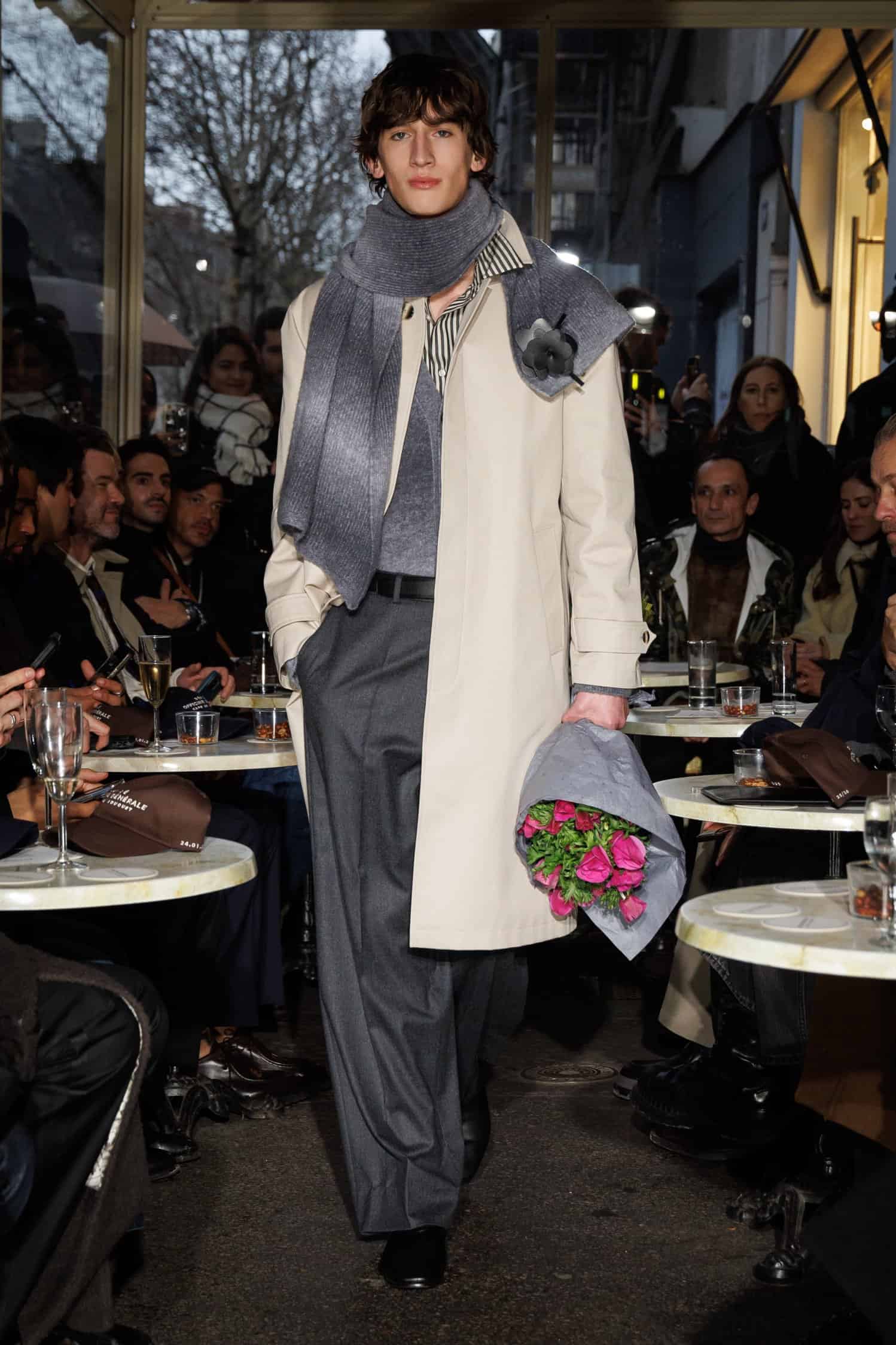 Officine Générale‘s Fall 2025 collection was especially intimate—especially as its Cafe Le Rouquet setting was mere meters away from the home of creative director Pierre Maheo! Fulfilling Maheo’s longtime goal of showing at a café, his latest co-ed designs were similarly personal—showcasing the close nature of a neighborhood hotspot. For Officine Générale, that took the form of extra-wide trousers, oversized coats, and plenty of striped shirts, light jackets, and soft sweaters to ward off the winter chill. Finishing touches like vintage books and bouquets nodded to the range of characters that frequent cafés, whether for long stays or a quick coffee pick-up.