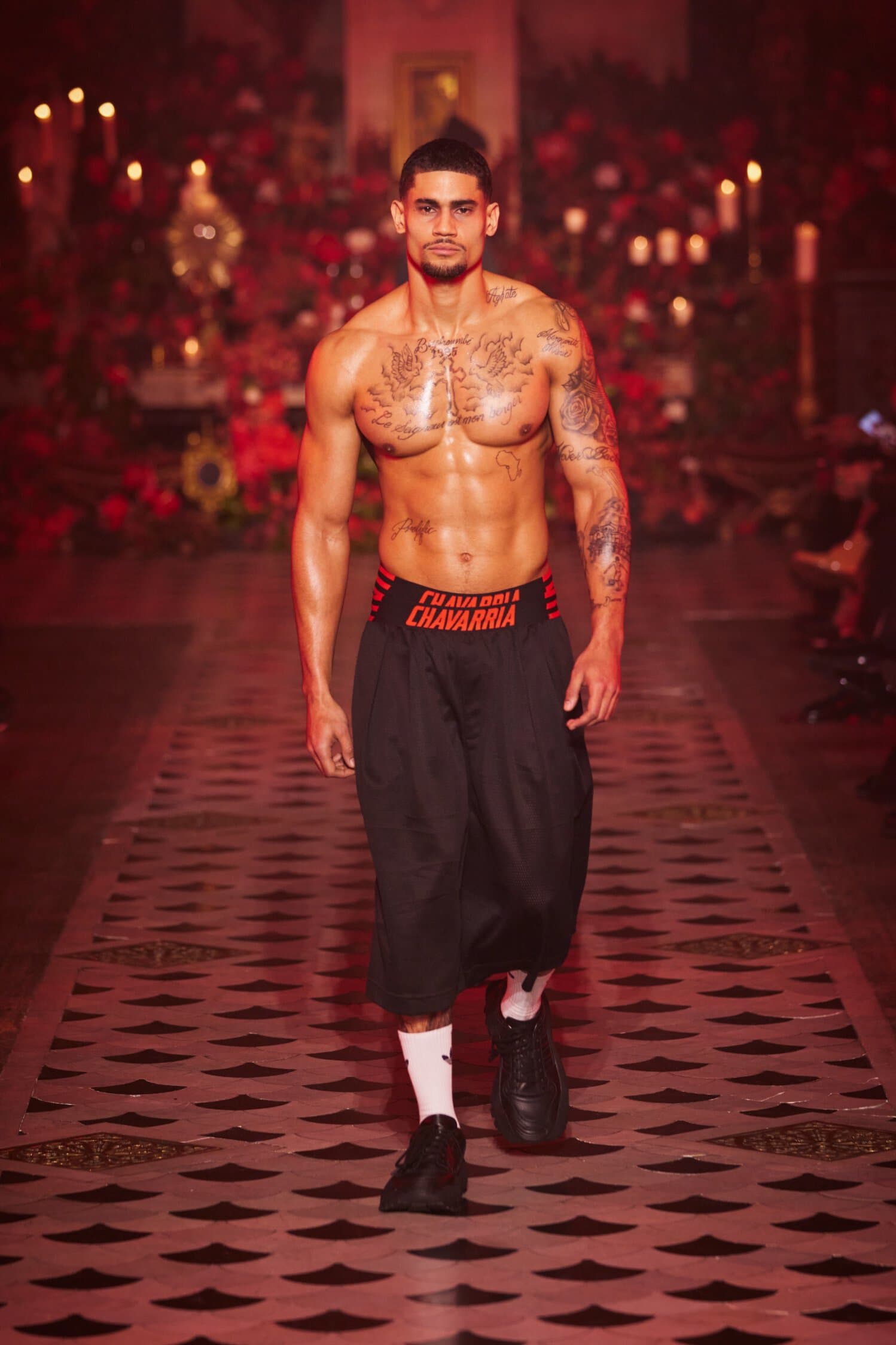 For Fall 2025, Willy Chavarria decamped from New York City to Paris for his latest collection, “Tarantula,” held at the American Cathedral in Paris. The serene setting for the show complemented its themes of powerful resistance and sensitive beauty, seen in Chavarria’s signature boxing shorts, dynamic suiting, and wide-legged denim. However, updated silhouettes were incorporated to the line, which marked the brand’s 10th anniversary: the unisex Chuco suit, Body-Tee bodysuit, and baggy drawcord Toluca pants, plus new jewelry, handbags, and Chavarria’s second footwear collaboration with Adidas. Tonal colors and signature Chavarria symbols delivered an intimate touch, from blooming rosettes to wide-brimmed hats and hues of red, gold, and black. The show notably featured Chavarria’s close friends and fashion community stars as models, including Jerry Lorenzo, J Balvin, Lyas, Honey Dijon, and more.