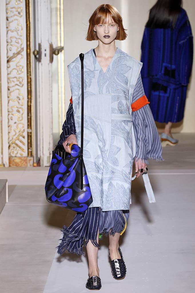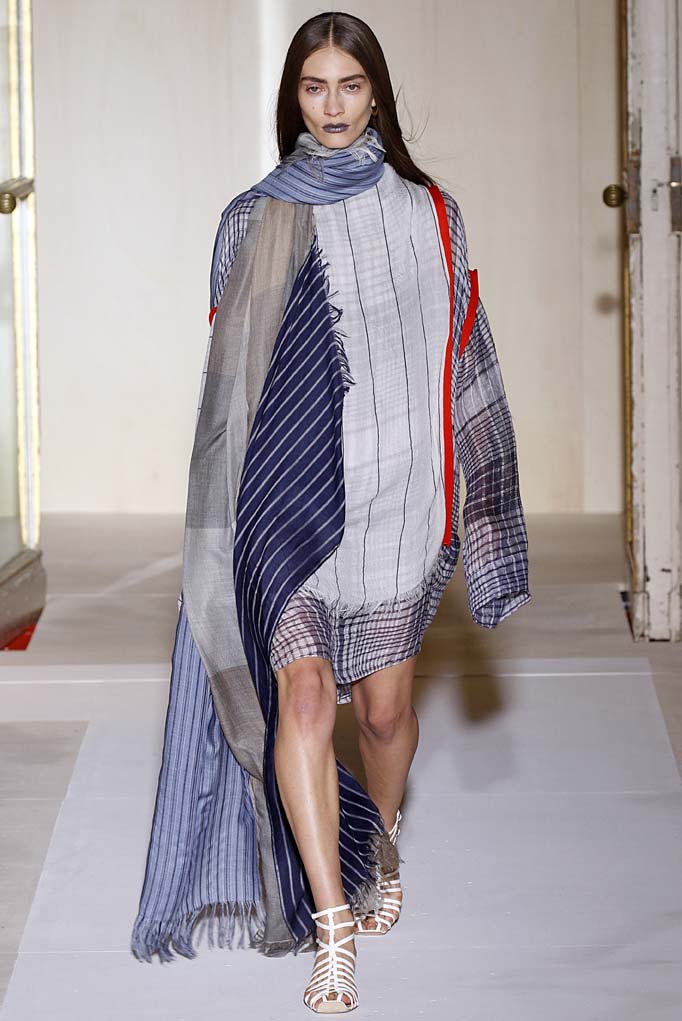 We have a polarizing presidential election, Britain had Brexit, and Europe has its refugee crisis. Elements of political strife have influenced the collection this season at Acne Studios. Textiles indigenous to regions like Syria and other Arabic countries, from which an appalling number of refugees have fled, served as the inspiration for Swedish designer Johnny Johansson. “It is interesting to me that even though we live in a digital age with a free flow of information, there are many countries who want to close their borders,” said Johansson in the show notes. “I prefer to focus on openness and looking out into the world.” There were garments made from and inspired by scarves and blankets. Patterns local to some of these regions, like paisley, indienne, checks, and stripes, ran throughout the collection, and Byzantine slippers and jeweled moccasins were worn with most of the looks. Colorful frayed knit kaftans and oversized bags hinted at the nomadic lifestyle. If only real life could be this beautiful.