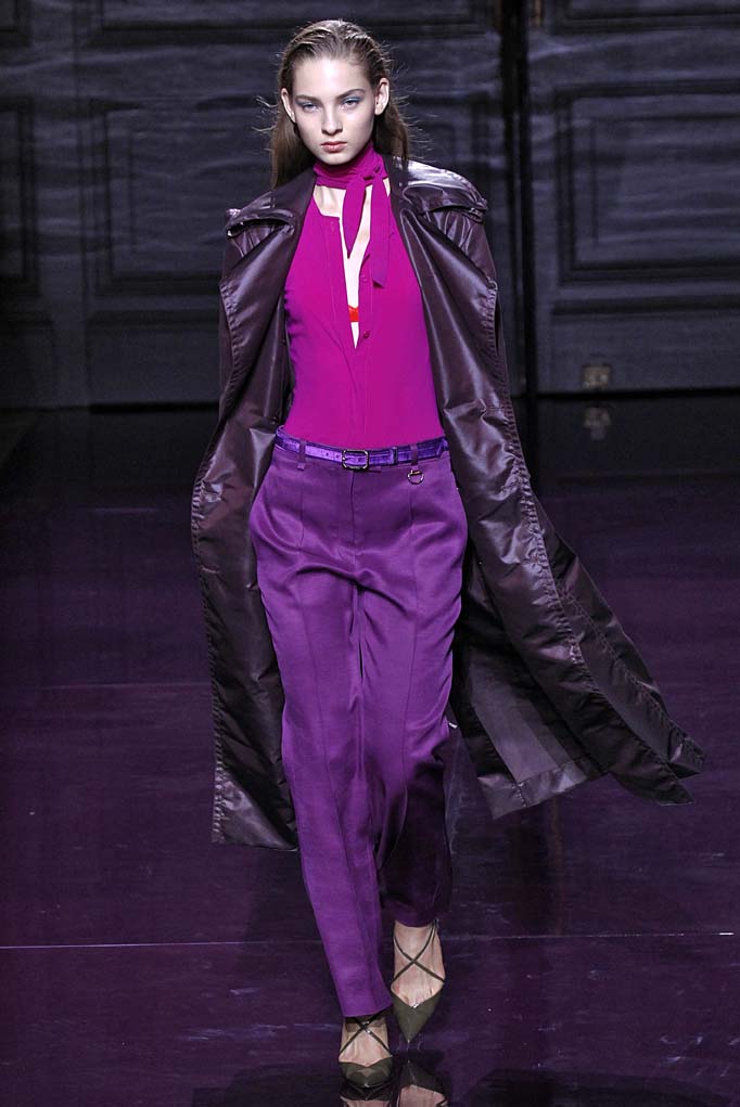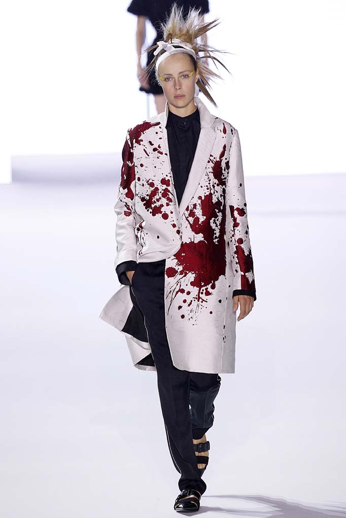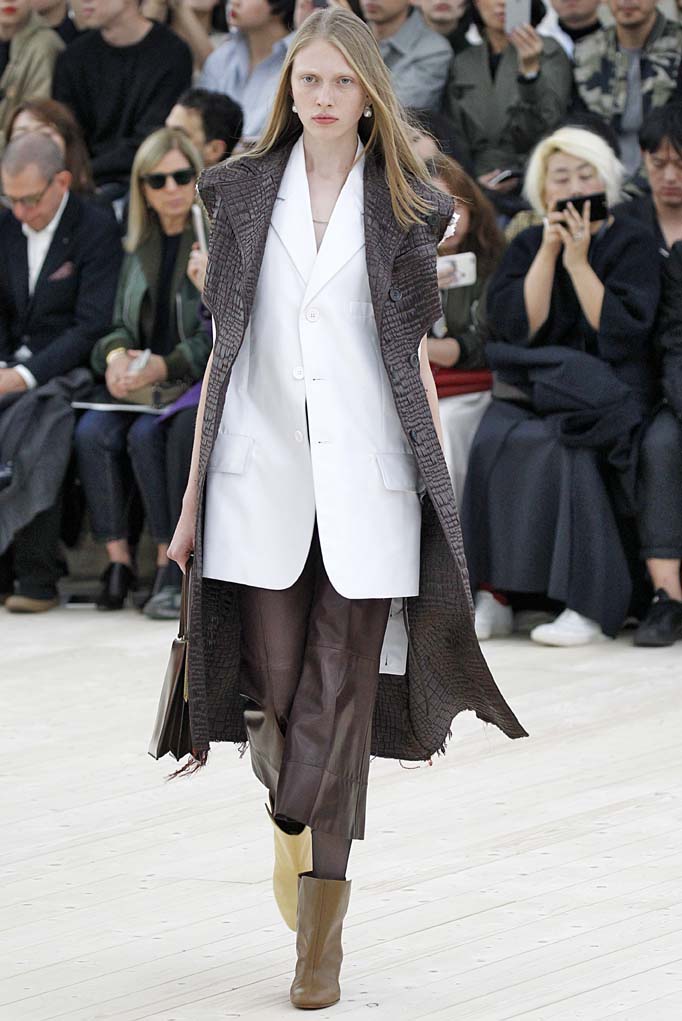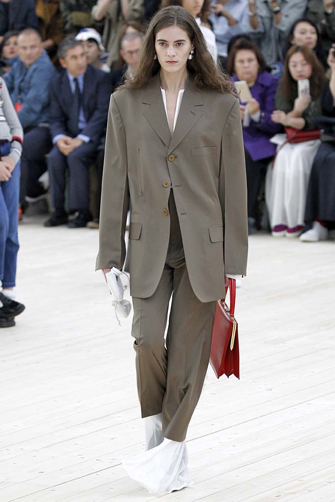 It’s no secret that Phoebe Philo is one of the industry’s preeminent feminists, so it’s not surprising that feminism was the underlying message of her show this season. It’s not, of course, the first time she’s visited the subject nor is it new territory for an industry predominately devoted to women, but there were some interesting ideas at play here. A long, white dress with a blue print of the female body, with two heads on each breast, referenced Yves Klein’s famous Anthropométrie series in which he used naked female models as living brushes—women making art with their bodies, or their bodies as art. The purity of a white dress with a white cape that billowed from the shoulders or a lone scarlet-colored gown or dresses with bustiers resembling breast plates gives you an idea of where Philo’s head was this season. Then there was the extremely exaggerated brown men’s suit or an immense version of a ladylike women’s purse with obvious connotations. As quiet as she is personally, Philo’s philosophy on women is at it’s best when it’s not just a suggestion, but a proclamation.