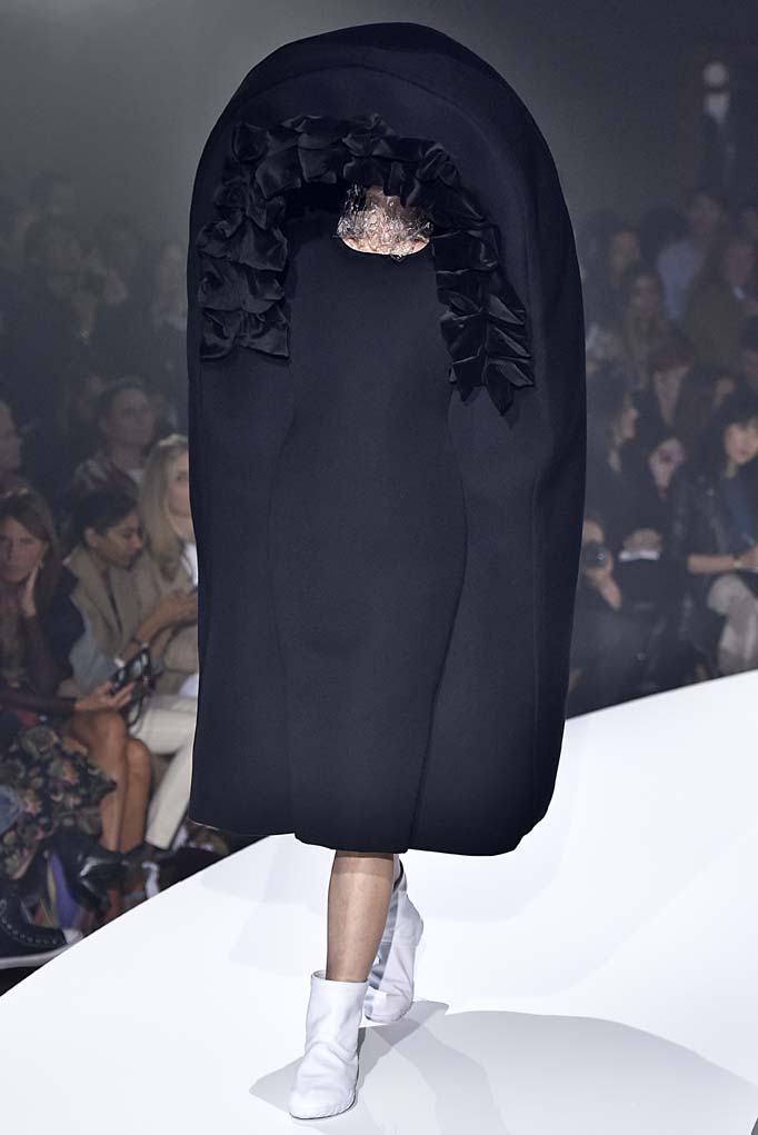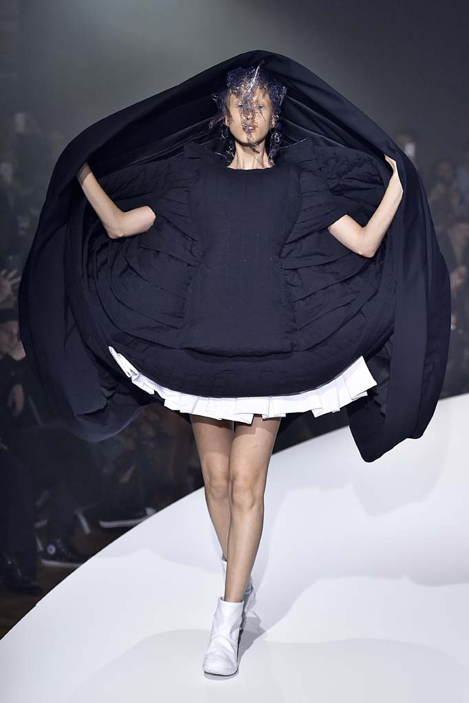 Rei Kawakubo was thinking about “invisible clothes” this season. Why then, you ask, did every piece come enormously oversized? What she meant was, clothes that make the person invisible. A black dress with ruffled trimming cocooned around the body like a moving hut with barely a peephole for the face, a dress with draping so that one can hideaway from the world, or a tartan dress with a wingspan so long you might knock down passerby. In a world where everyone is masking themselves with piles and piles of the latest trends and preening for the cameras, this might be Kawakubo’s comment on the fashion set’s need to overcompensate outwardly. Just recently, after all, Harper’s Bazaar featured designers wearing paper bags on their heads to tell the world what they hide from and how they protect themselves.