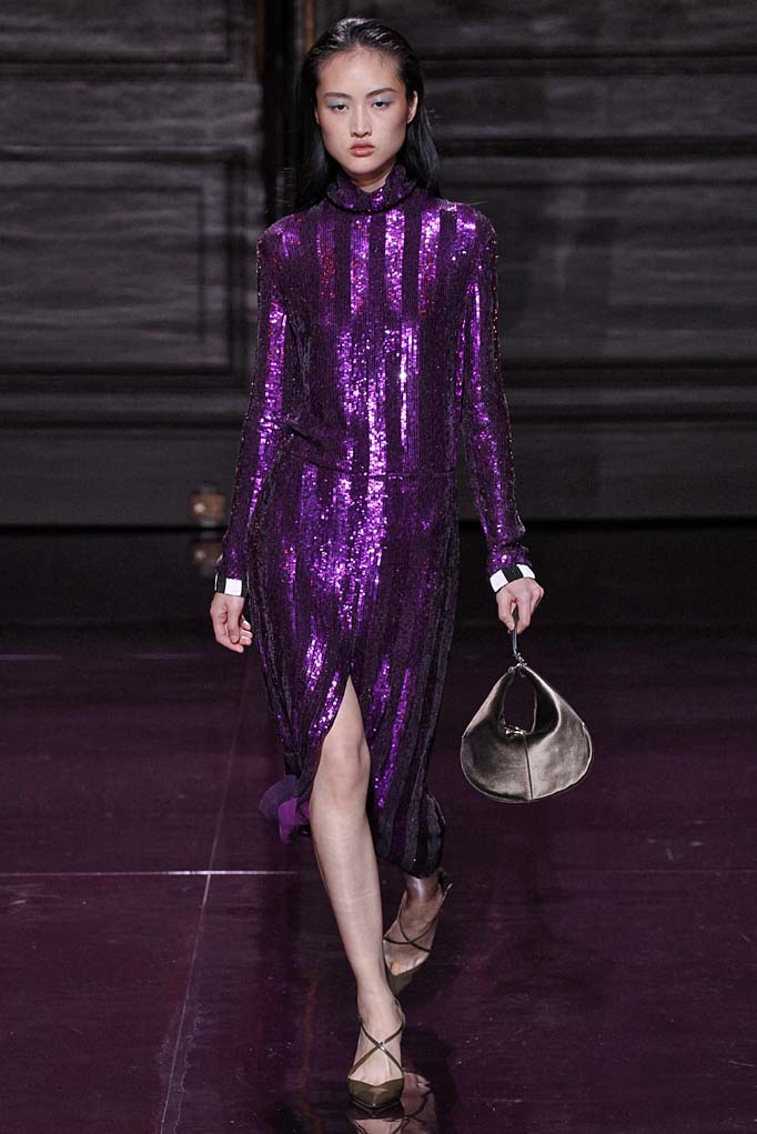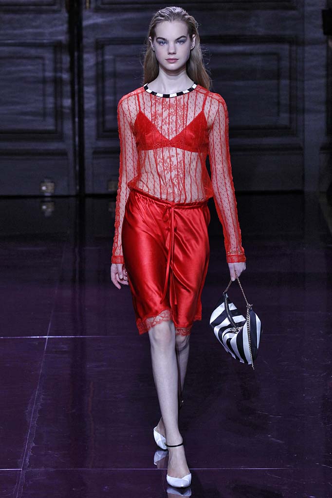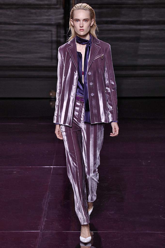 Everyone is mad for stripes this season and Guillaume Henry really took the trend to heart with over half of the collection done in the motif du jour. The best were the slinky sequin numbers, a lavender velvet suit with barely-there stripes, and a black and white striped leather jacket adorned with hundreds of small silver rings. Of course, there were the lingerie-inspired staples like silk skirts and dresses with lace trimming or a see-through lace top worn over a bralette, but this season introduced men’s suiting and more day attire for a slightly more casual vibe.