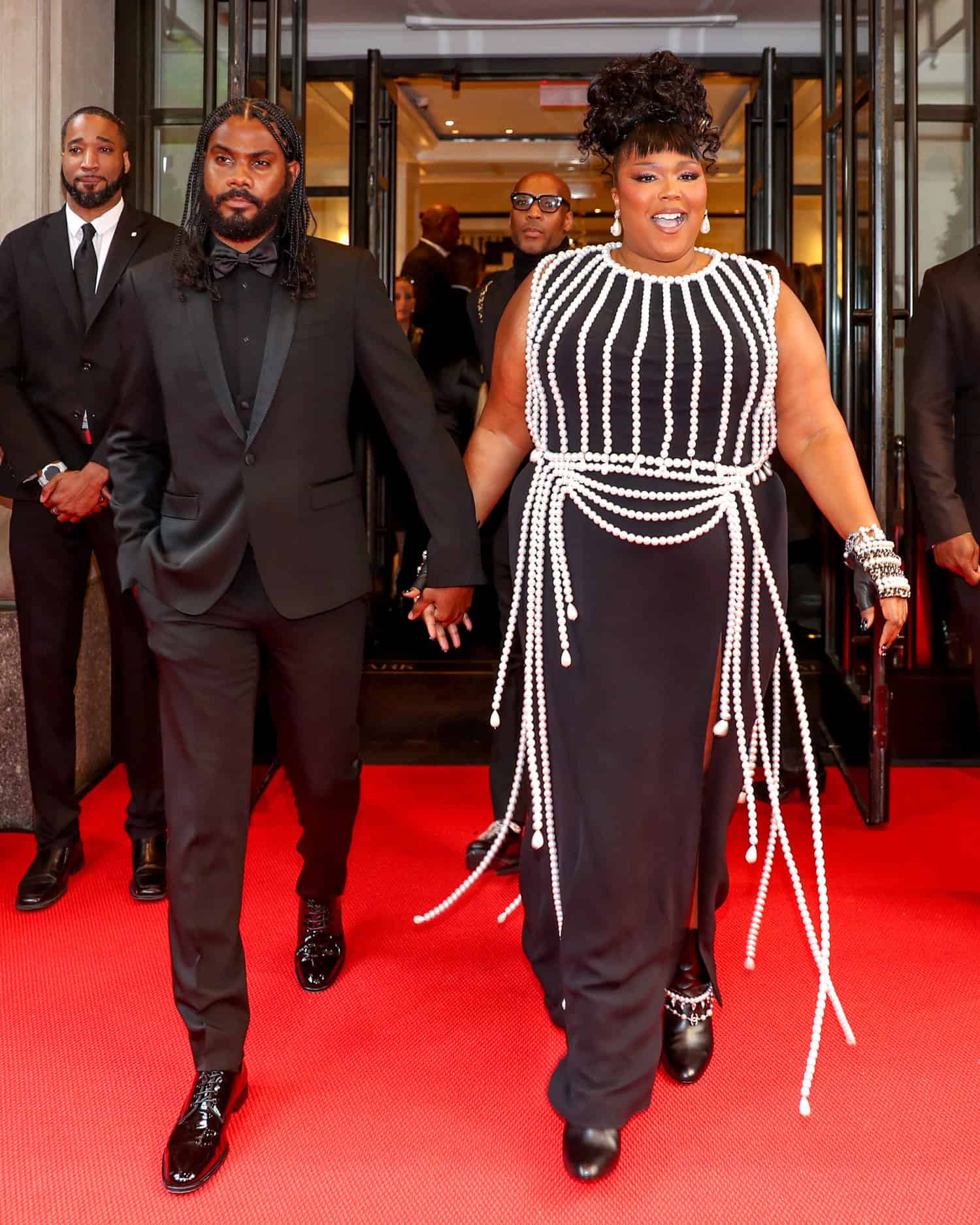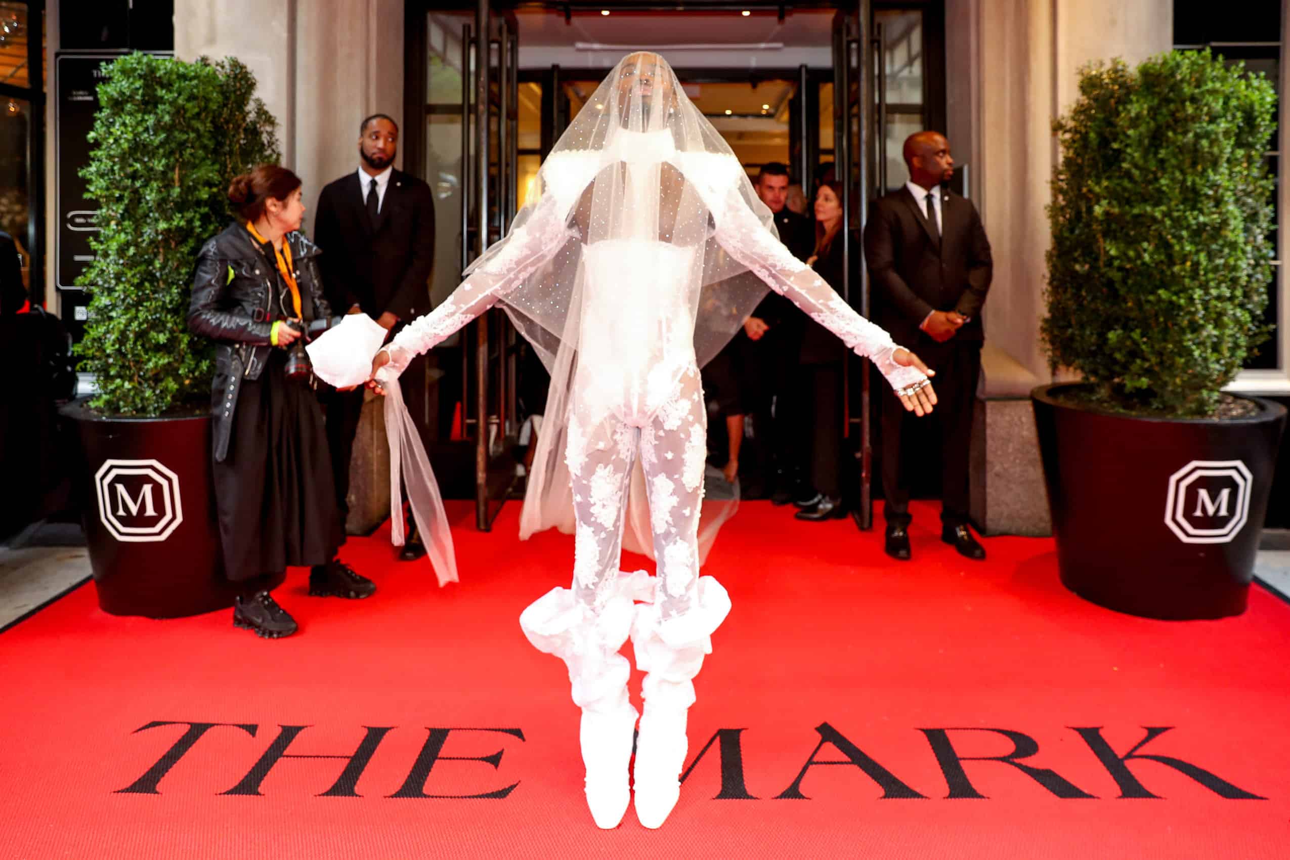 Guests seen departing from The Mark included Anna Wintour, who later made her red carpet debut coupled up with Bill Nighy, Alexandra Daddario, Alton Mason, Amber Valletta, Anne Hathaway, Ashley Graham, Bad Bunny, Barry Keoghan, Baz Luhrmann, Bella Ramsey, Burna Boy, Cara Delevingne, Carla Bruni, Cardi B, Catherine Martin, Daniel Lee, Donatella Versace, Devon Aoki, Doja Cat, Dr. Dre, Eileen Gu, Eva Chen, Gabriela Hearst, Gigi Hadid, Grace Elizabeth, He Cong, Imaan Hammam, Irina Shayk, Ivy Getty, Jessica Chastain, Jodie Comer, Jonathan Simkhai, Jordan Roth, Karlie Kloss, Ke Huy Quan, Lily James, Lizzo, Manu Rios, Mary J. Blige, Maude Apatow, Mindy Kaling, Naomi Ackie, Nicola Peltz, Olivia Wilde, Paloma Elsesser, Paris Hilton, Sienna Miller, Simon Porte Jacquemus, Simu Liu, Skepta, Stormzy, Vanessa Kirby, Vittoria Ceretti, and more.