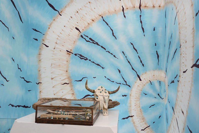 We really embraced the raw nature of the space and made it our own with brand signatures like a tie-dye wall done by Santa Monica based non-profit artist, Ruben Rojas of Beautify Earth. A set of dressing rooms made of a massive dream catcher on the lower level, created by Crystal Oak, is one of the store’s most interesting design elements. Other special touches include cowhide rugs and leather poofs arranged around the store to embody a laid-back, lounge type feel.