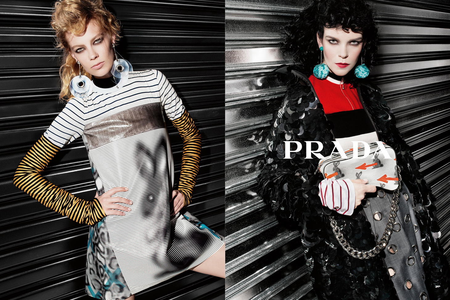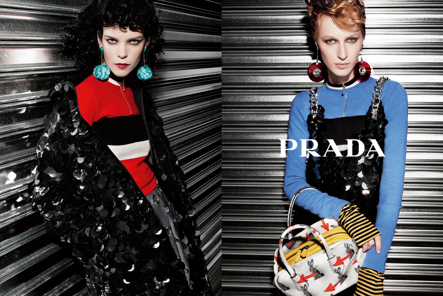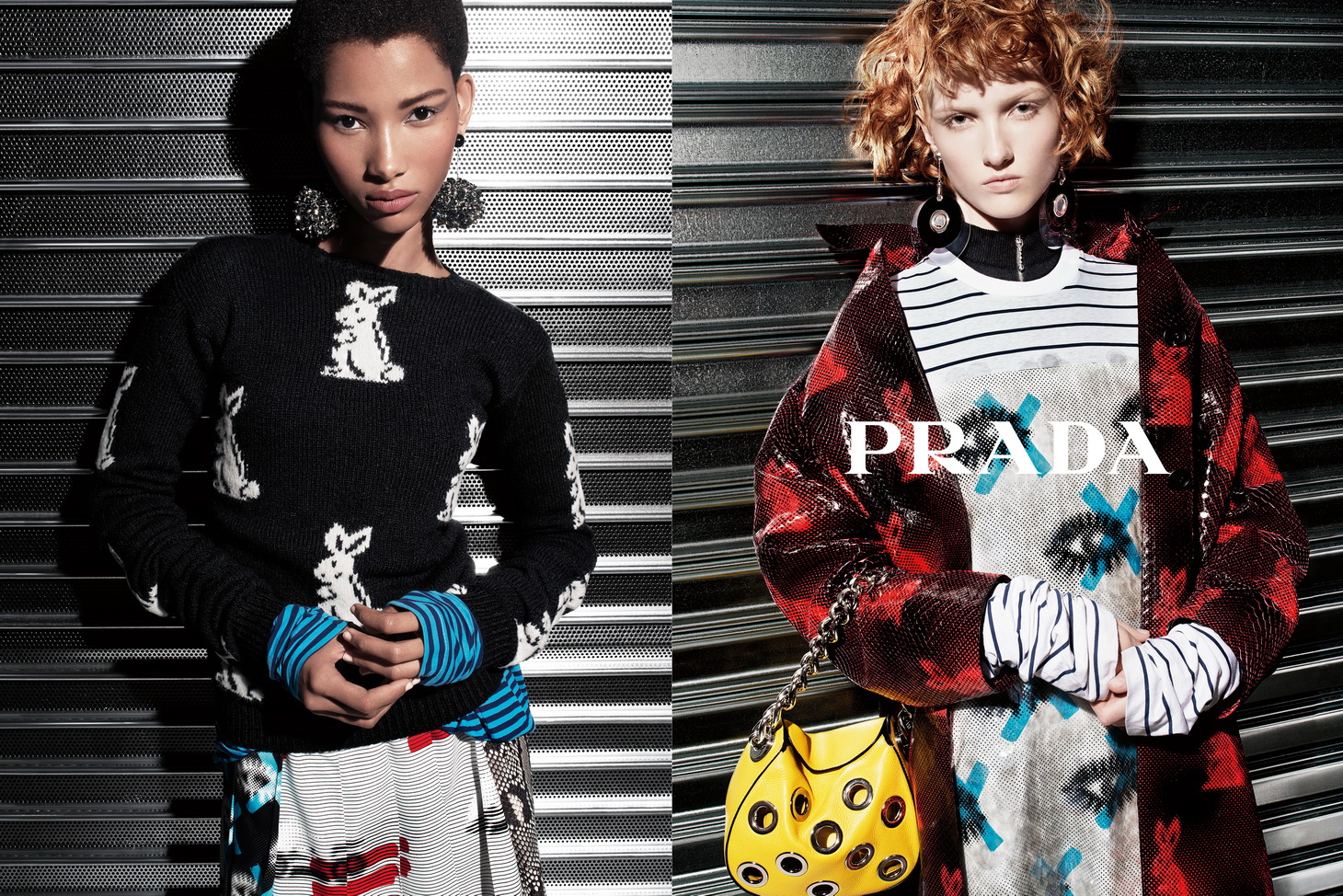 Though it still feels a wee bit early to be thinking about Resort (it’s only October, n’est-ce pas?), Prada is going there, so we’re along for the ride. Today, the brand released its Resort 2016 campaign which was shot by (you guessed it!) Steven Meisel, who returns to Miuccialand for the umpteenth time. The photog enlisted the all-star cast of Lexi Boling, Meghan Collison, Ina Jensen, Lineisy Montero, Julia Nobis, and Greta Varlese for what’s described in a press release as “bad girls turned good, or good girls turned bad, exuding a kind of unhinged innocence. The cool knowingness of their gaze is offset by expressive body language, hands on hips or folded across the body, arms swings as if in dance.” The collection, which was first spotted at Men’s (not a typo) Fashion Week in Milan, features quirky cars, rockets and bunnies, bunnies, bunnies.