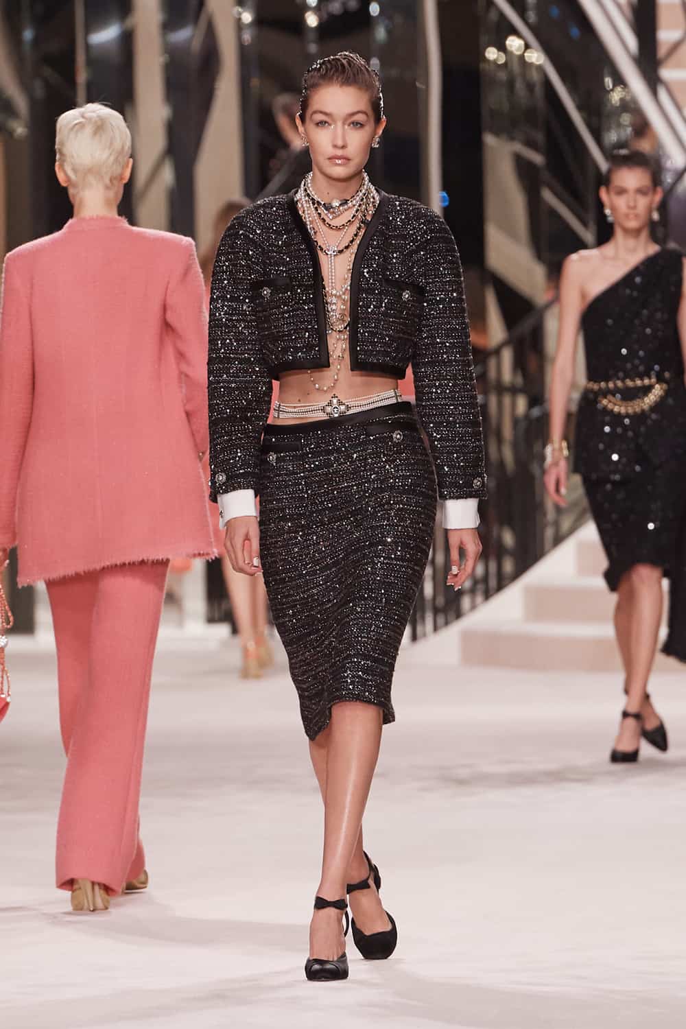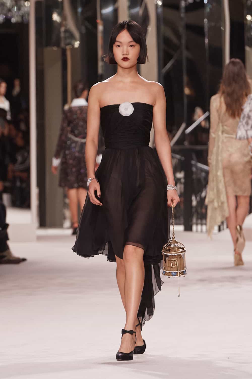 Otherwise, the collection presented slight updates on Chanel classics. Models wearing tweed suits, dripping in costume jewelry glided down the runway while celebrities like Kristen Stewart, Vanessa Paradis, Lily-Rose Depp, Penélope Cruz, Yara Shahidi, Sofia Coppola, and Marion Cotillard watched.