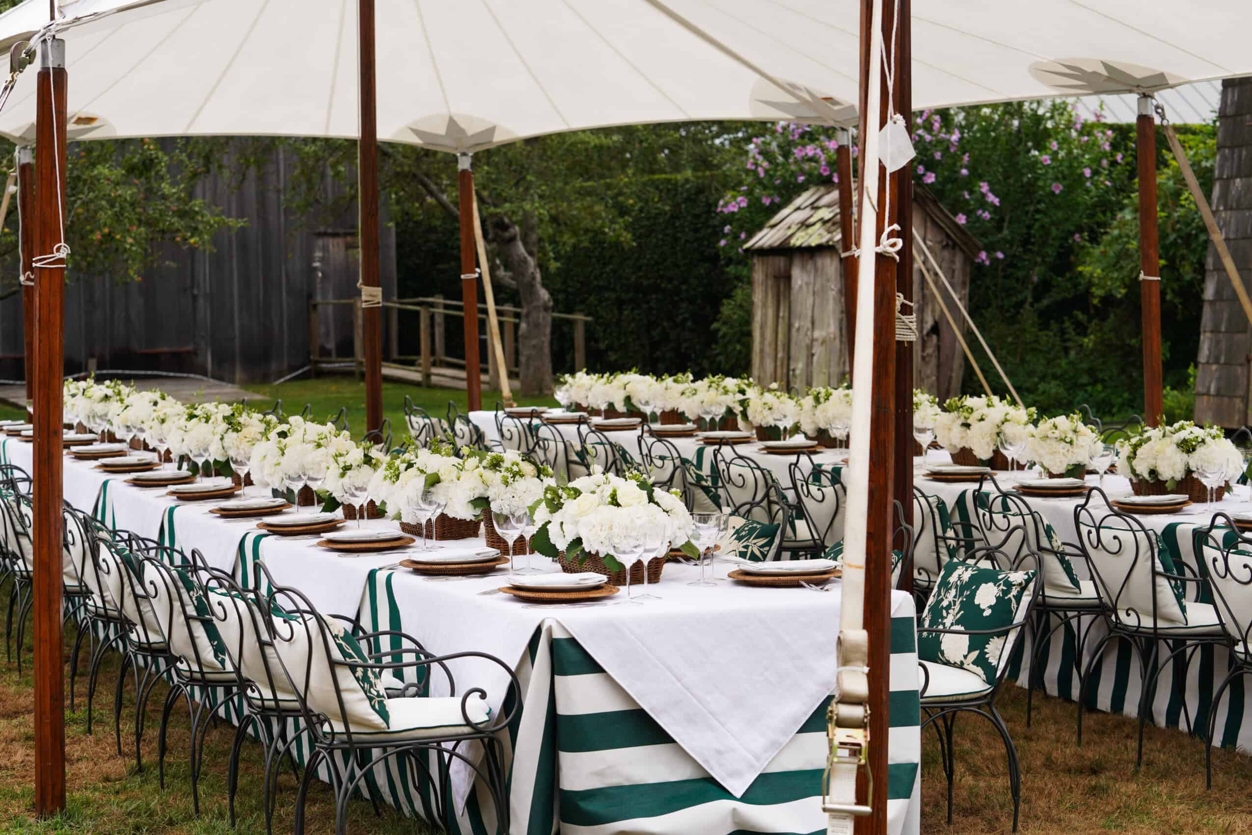 Mulford Farm, a 17th-century English Colonial homestead tucked off Main Street in East Hampton, was restored nearly two decades ago with Ralph Lauren’s support, and is lovingly maintained in partnership with the East Hampton Historical Society. It sits alongside the picturesque Pantigo Windmill, and now stands as one of the East End’s most significant historic properties. On this overcast afternoon, the scene unfolded as if plucked from an East Coast pastoral dream. Beneath cloudy skies, guests stepped onto a lawn transformed into an open-air space merging the Hamptons’ summer ease and Lauren’s quintessential Americana style—but not before stopping in the wicker and floral filled garden to take pictures. Elsewhere on the property, guests stayed refreshed with chilled spritzes served on silver trays and iced brews from a Ralph’s Coffee truck. Smaller seating vignettes dotted the lawn with large canopy umbrellas and coffee tables, each adorned with copies of Lauren’s “Polo Beach Edition” newsletter neatly stacked beside branded fans and vases of seasonal blooms.