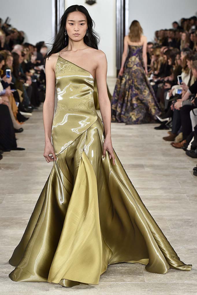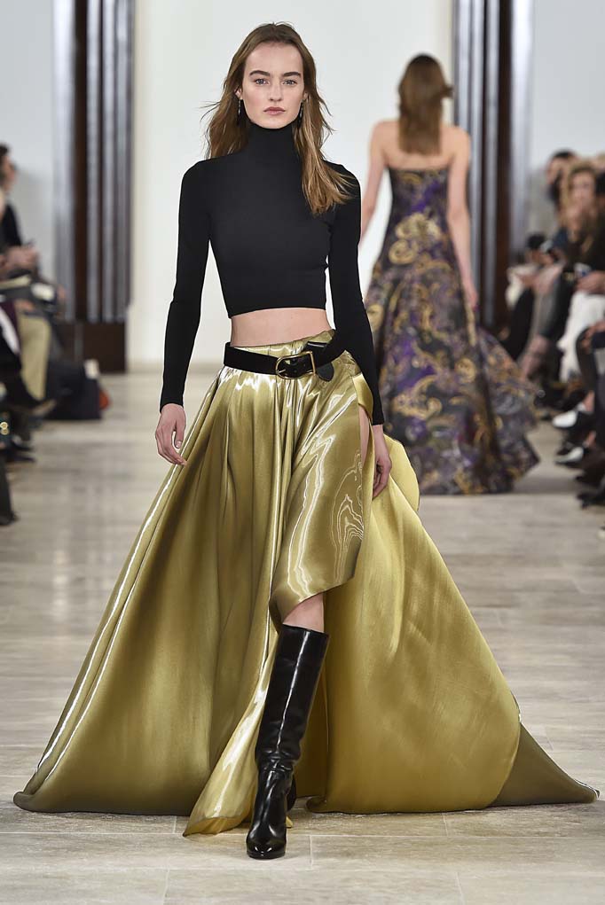 Ralph doesn’t go wrong with eveningwear, which is why so many of the red carpet looks on Hollywood’s best-dressed are Ralph Lauren (hello Gwyneth Paltrow). A ruby red velvet dress with an ultra deep-V and a gold liquid Mikado evening dress should make the best-dressed lists come Oscars season, if the right stars get their hands on them, like Sienna Miller, who was perched front row.