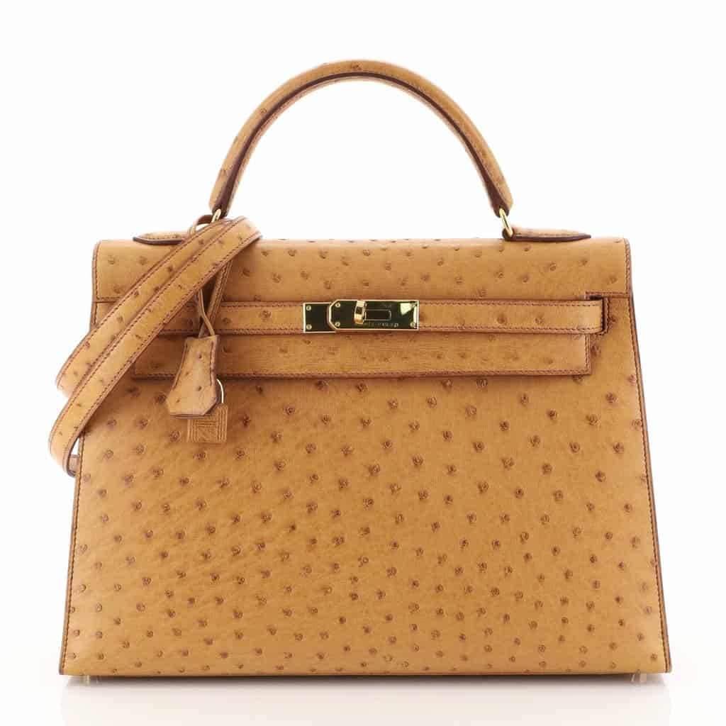 Kelly Handbag Natural Ostrich with Gold Hardware 32, HERMÈS (Available at Rebag), $15,440; One Two Three and Away We Go Birkin Bag Limited Edition Printed Swift 25, HERMÈS (Available at Rebag), $40,015