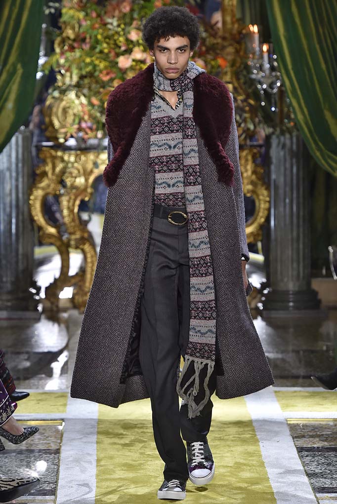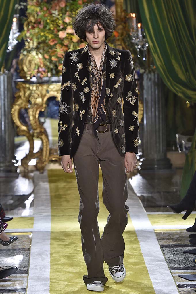 Seventies glam rock! Roberto Cavalli’s Peter Dundas let it roll with a collection of wild prints and all kinds of silhouettes inherent to the era from bell bottoms and velvet to Sgt. Pepper-style pieces and snakeskin patchwork. Some pieces even featured Led Zeppelin cover art, and the zebra print and leopard furs will surely be loved by Cavalli’s clientele. For the brand’s sauciest minxes there were plenty of sheer panty-revealer gowns and plunging keyhole necklines. And what’s not to love about that floor-sweeping denim coat?