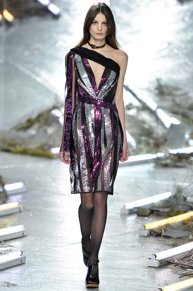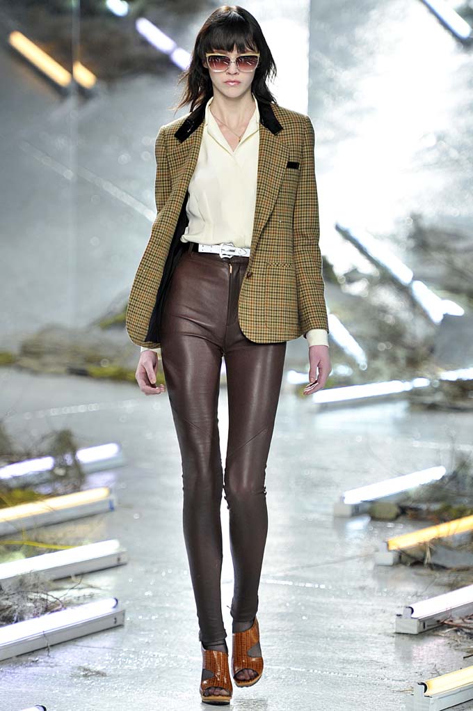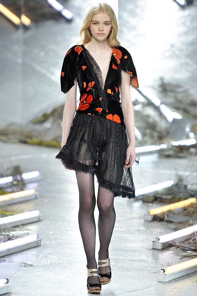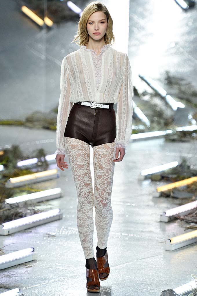 Upon entering Center548 for a Rodarte show, there’s a palpable sense of anticipation. The sets tend to evoke a mysterious and magical vibe, leaving the audience wondering what Laura and Kate Mulleavy have up their sleeves each season. This time around, it was a glorious mash-up of sumptuous furs, luscious leathers, a bit of cashmere, a healthy dose of lace, and a surprising amount of sparkle. Those leather leggings with panels of white lace were trumped by knockout pieces like a floral dress with an asymmetrical hem finished off with a touch of marabou. The outerwear commanded plenty of attention, too, including a plaid anorak with a hood lined in bold blue fur. The finale of the show included nine looks, and it felt decidedly Vegas showgirl-esque. In other words, this meant bright stripes of sequins, over-the-top Swarovski-embellished tulle, and ostrich feather detailing. In the hands of other designers, this mishmash could translate as gaudy and tasteless, but with Rodarte’s strange spin and off-kilter styling, the lineup veered back into It girl territory, right where it belongs.