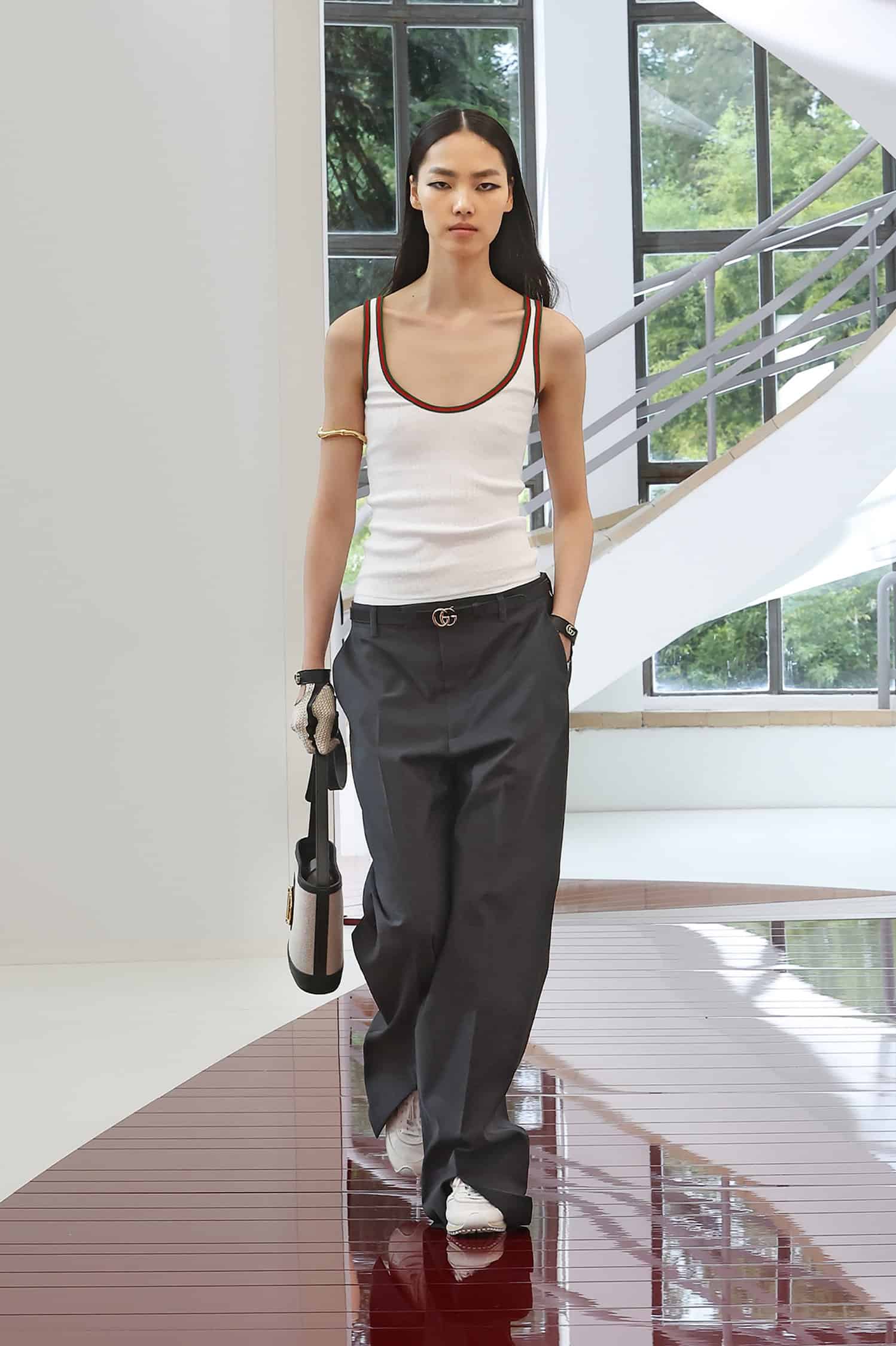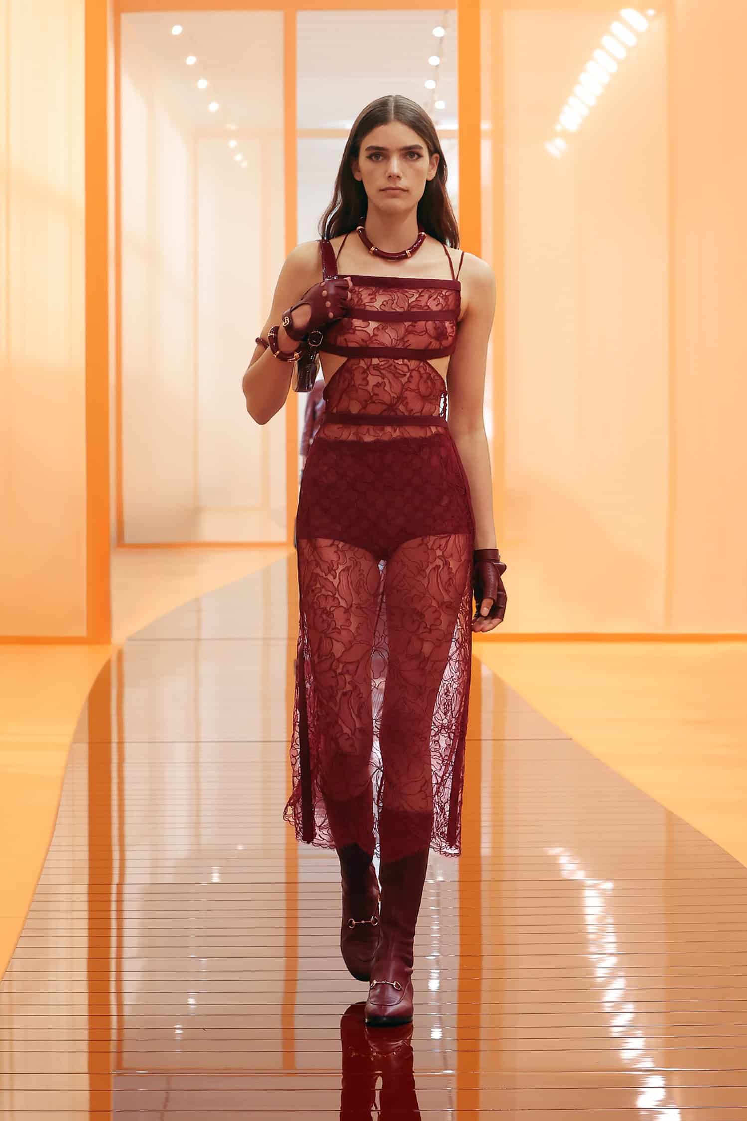 Under De Sarno’s leadership, Gucci was revamped with a modern, clean aesthetic that departed the former tastes of past creative director Alessandro Michele. The Italian brand’s collections frequently featured relaxed tailoring, jackets, denim, and plenty of matching sets—plus heaps of embellished dresses and outerwear accented by crystals and pailettes. On the accessories front, De Sarno constantly nodded to Gucci’s house codes with bamboo-handled handbags, horsebit-topped loafers, equestrian boots, and more. He quickly made a dark red “Ancora” hue his signature color, which has been part of every collection since his debut. New Gucci muses for De Sarno included Kirsten Dunst, Julia Garner, and Daisy Edgar-Jones—plus Paul Mescal, Yara Shahifi, George McKay, who all fronted the label’s campaigns over the years.
