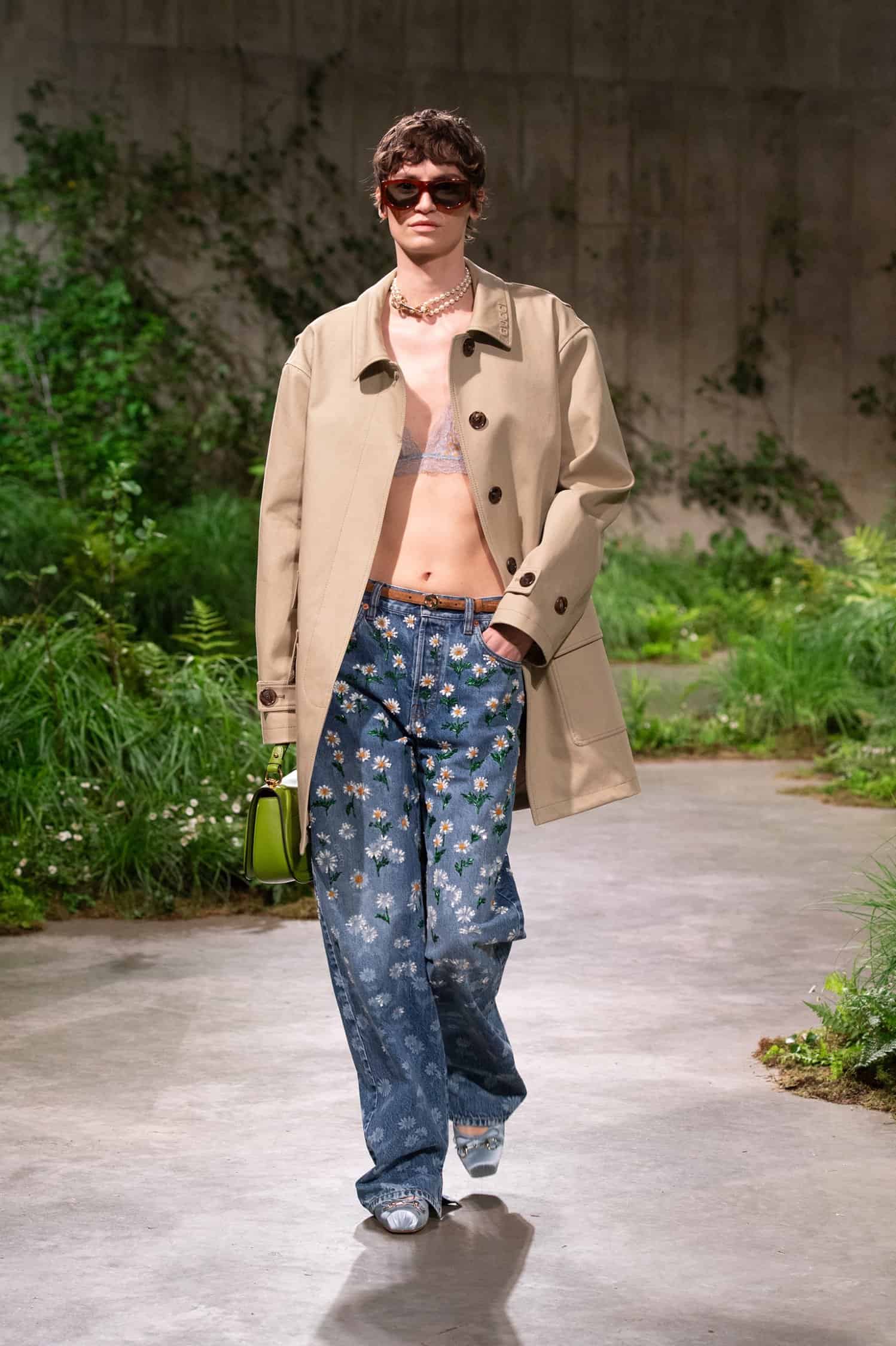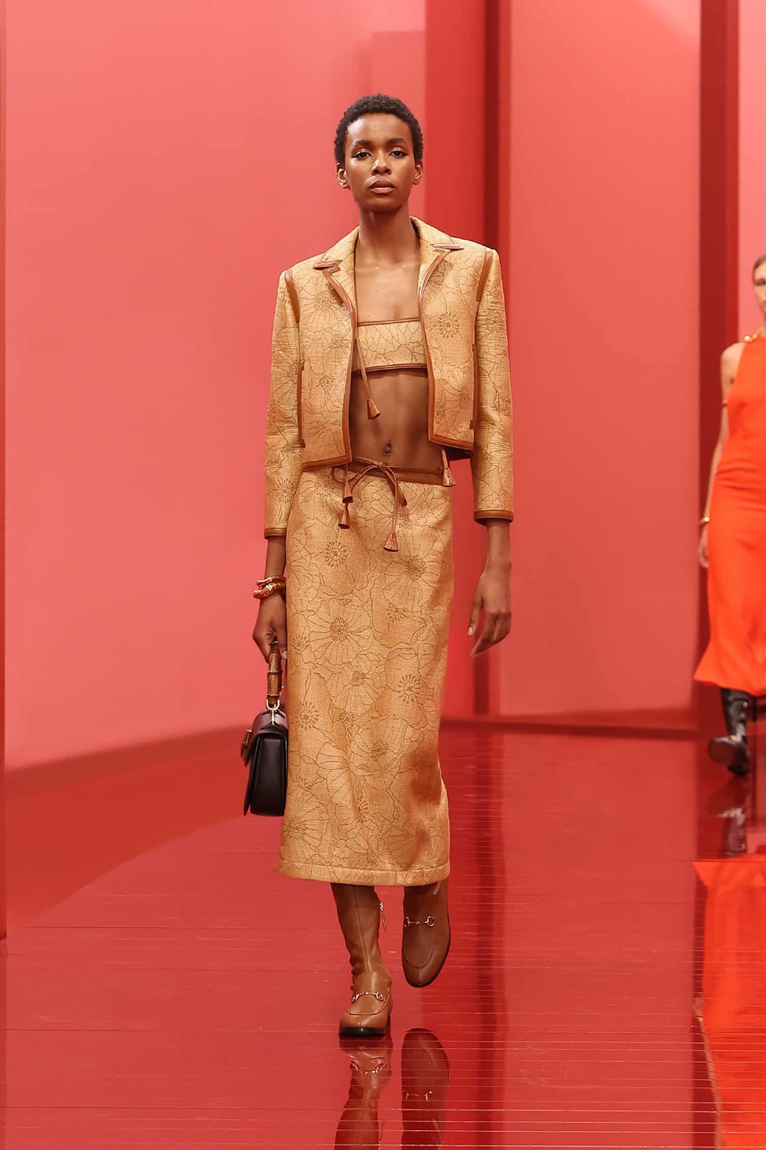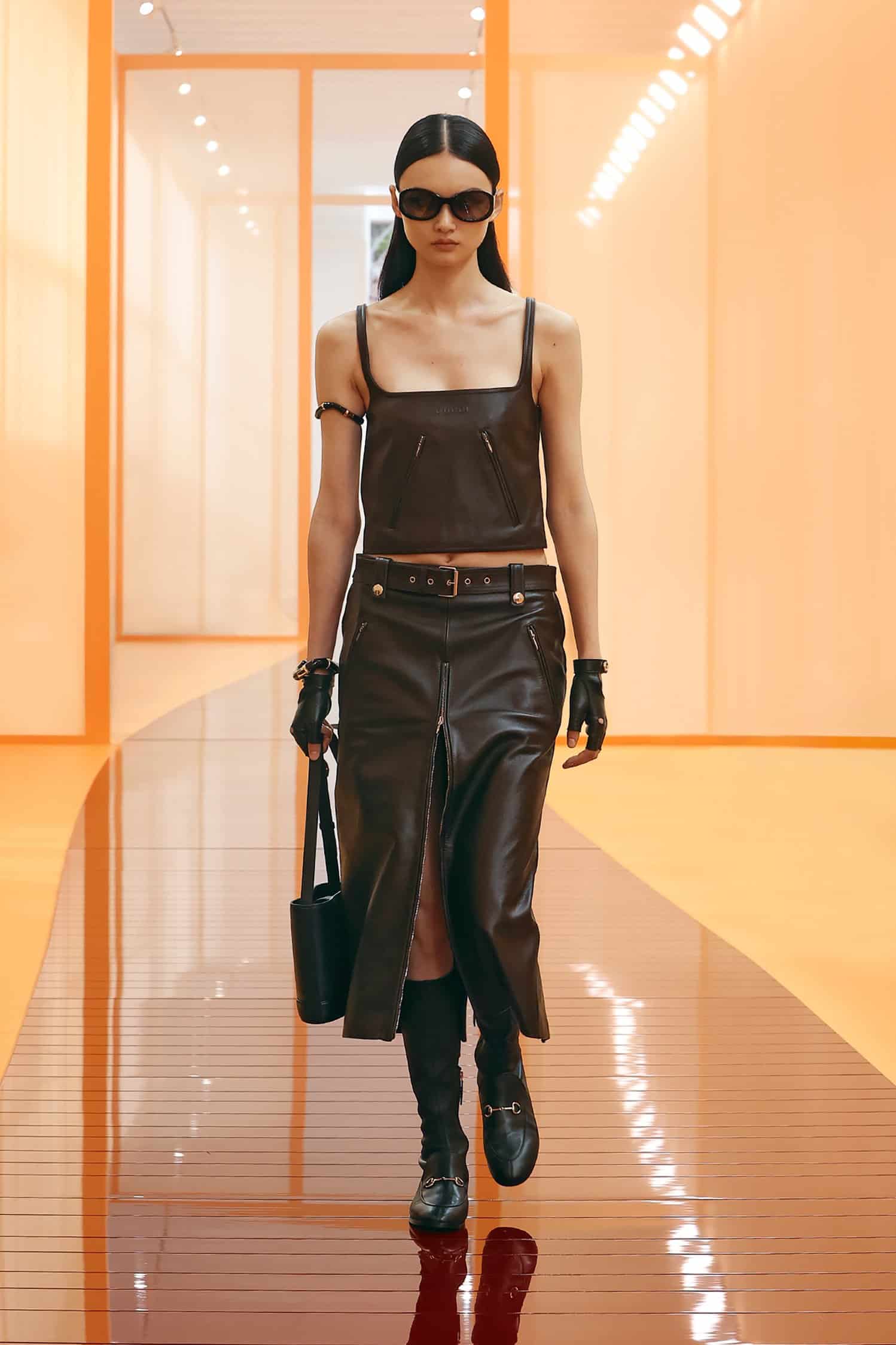De Sarno’s final show for Gucci was Spring 2025, one of his most positively received collections to-date for the house. Taking inspiration from the feeling of freedom, the line included a mix of ’60s-inspired tops, horsebit-topped boots, Mary Jane pumps, and leather sets—plus romantic dresses and outerwear accented with delicate lace and beaded fringe.
