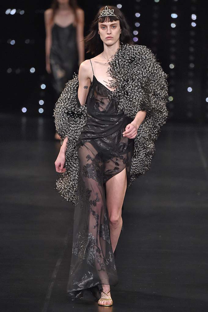 With Courtney Love in the front row, the tiaras weren’t exactly a surprise. What was a little provocative, however, were the clothes. It’s not like Hedi Slimane has been getting terribly conceptual during his tenure at Saint Laurent, but his Spring collection is deliberately middlebrow: slipdresses that were shapeless enough to suggest fashion of the fast variety, a distressed leather bomber jacket that resembled something rescued from a bin at a thrift store, normcore denim shortalls that some of the fashion industry’s junior set may have rocked in six, seventh, and eighth grades. Outwear was a focus, namely because most of the lacy, sequined little somethings won’t stave of much of a springtime chill. This collection will likely result in some angsty critics—is Slimane deliberately trying to unravel the very fabric of luxury?—but whatever he’s doing is resonating with shoppers, who can’t seem to load up on his bags, shoes, and sexy little dresses fast enough.