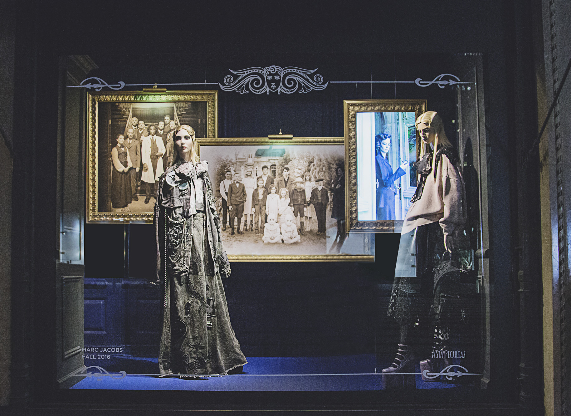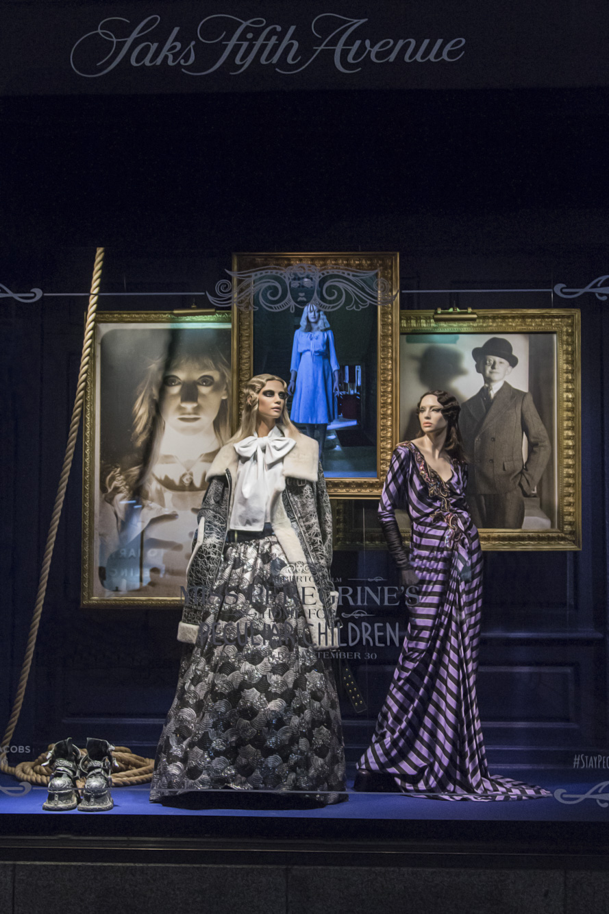 Saks Fifth Avenue has combined the creative genius of Tim Burton and Marc Jacobs for a series of window installations at its flagship and a few locations nationwide. Each window combines Jacobs’ Fall/Winter 2016 collection (for which Burton’s aesthetic provided inspo) with looks from the director’s film Miss Peregrine’s Home for Peculiar Children, including film props, costumes, and art, while footage and pictures from the film served as the backdrop.