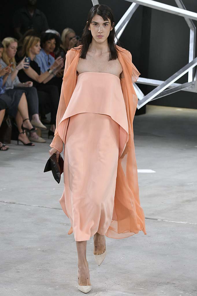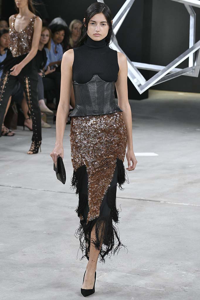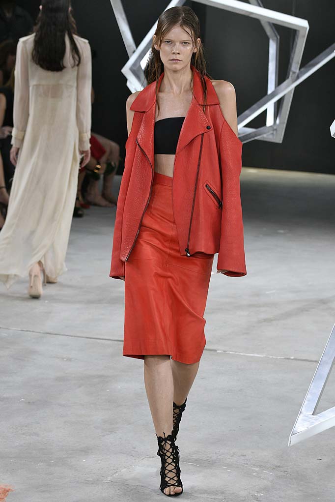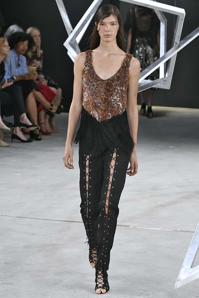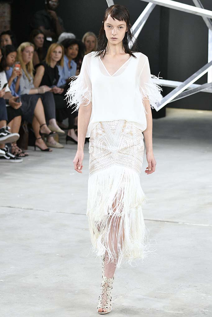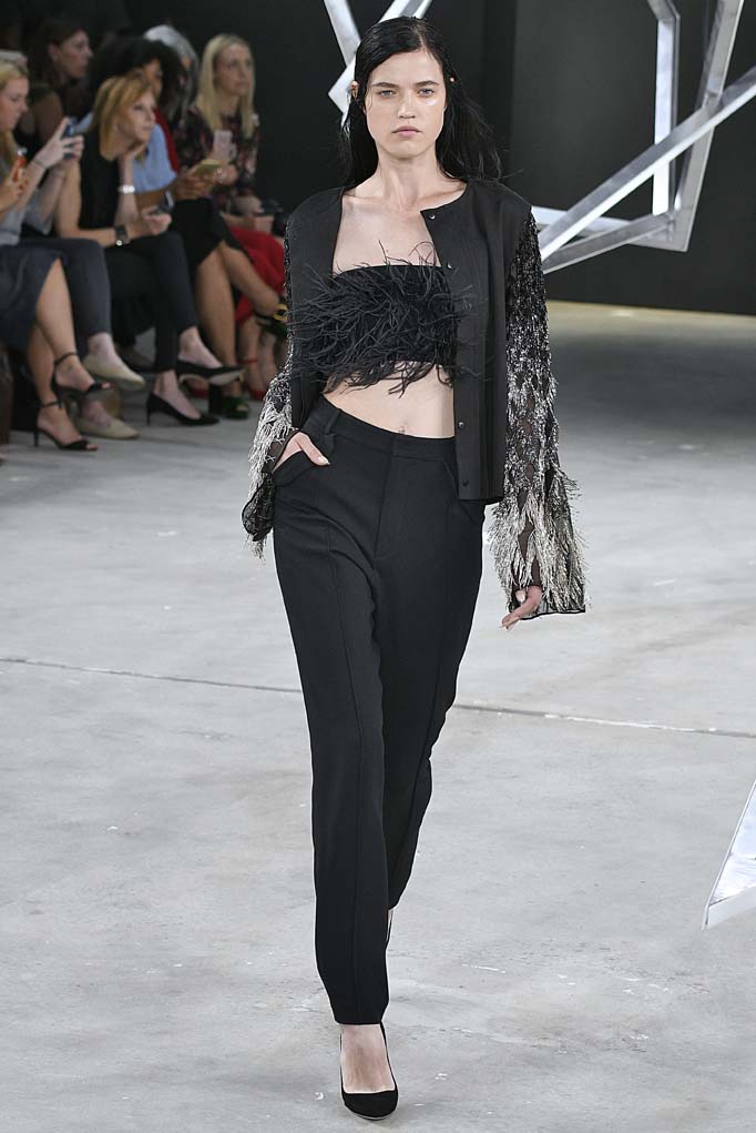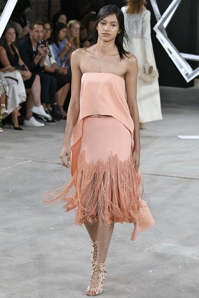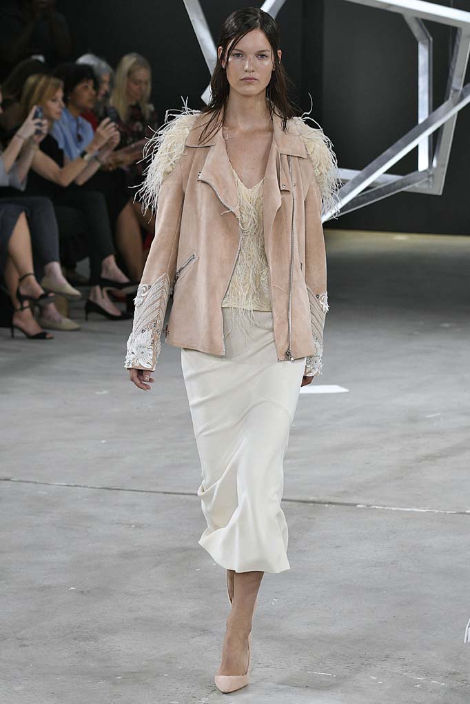 Excess fringe, ostrich feather detailing, corsets that outline the under boob…you could imagine Kim Kardashian wanting to get her hands on the sheer, nipple-baring peach t-shirt dress with matching corset. It reminded us of a certain show last season in Paris, but nevertheless there were some stellar pieces in both the skirting and outerwear pieces (both strong suits of Sally LaPointe). The opening woven and fringed skirt was a beautiful statement maker and an embellished cream trench coat should fly off the racks. And be prepared to see those leather jackets with the cut-out sleeves everywhere. Some of the embellished sequined cocktail dresses that closed the show felt special, but could have done without the corsets. LaPointe has a loyal following in the fashion world and beyond, and deservedly so, but we like LaPointe’s collections best when her designs are aimed at smart, edgy women like herself.