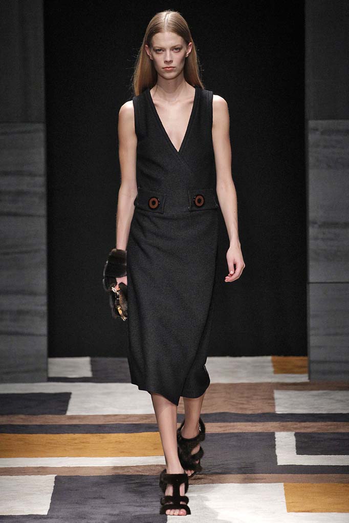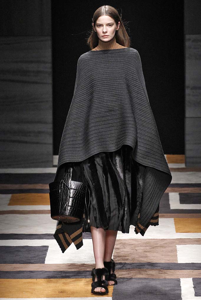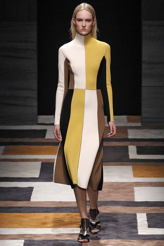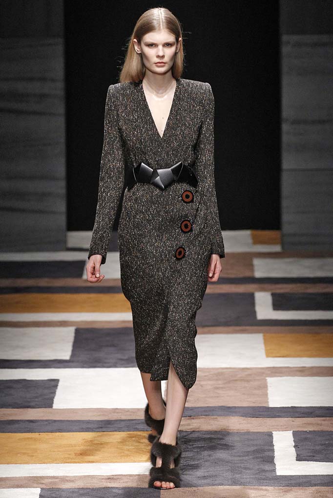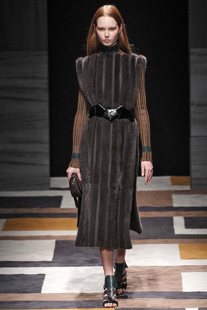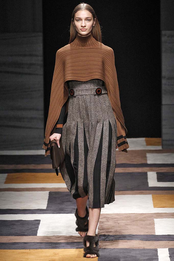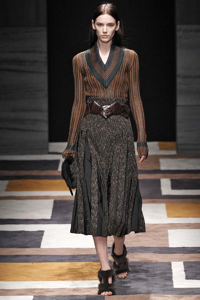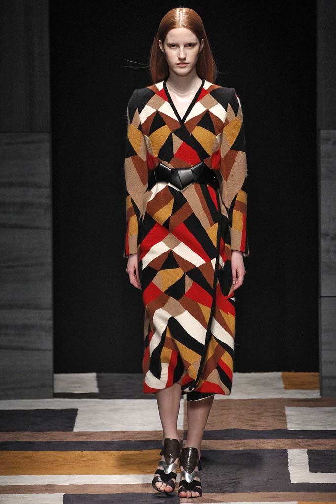 Prints galore! Massimiliano Giornetti delivered a vibrant collection with stellar graphic prints for Fall. The patterns mostly came in earthy tones of forest green, chestnut brown, mustard yellow, and a berry red. The focus was knitwear, with long slim turtleneck dresses and tops or a wrap dress with a must-have knotted leather belt, but the standout was the fur coat done in patches of dyed geometric fur. Even the heels had a triangular geometric element.