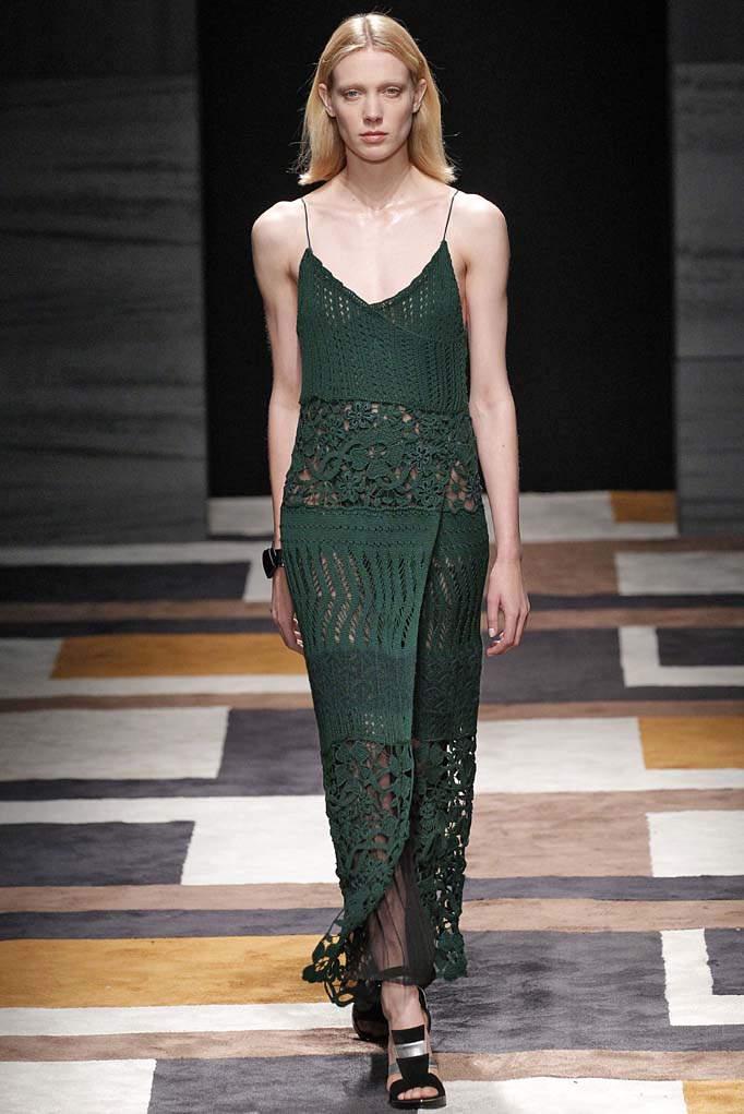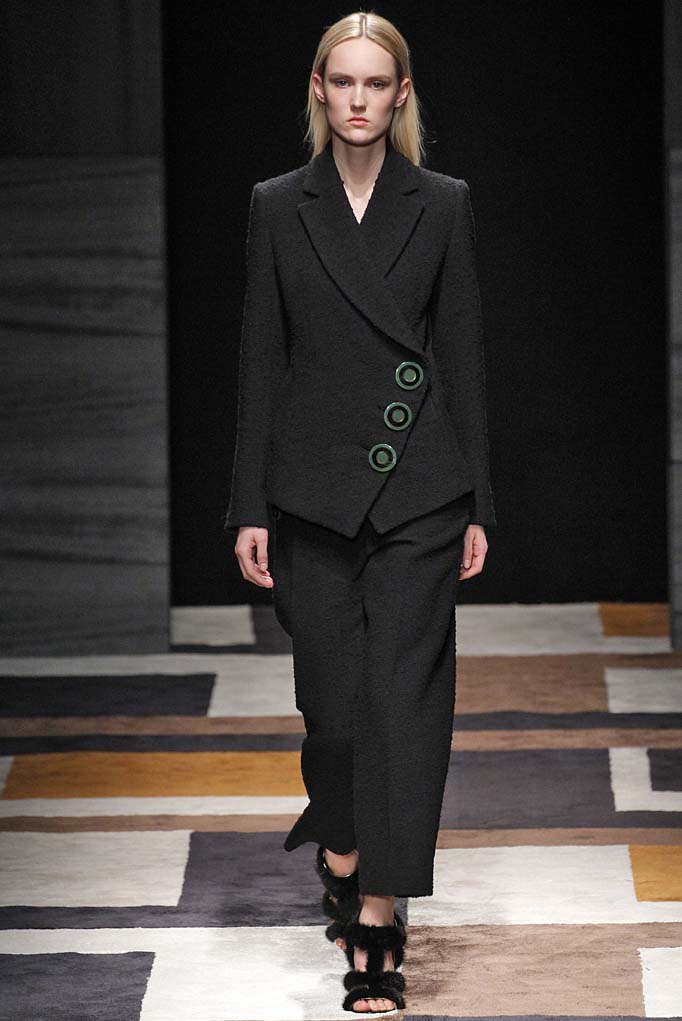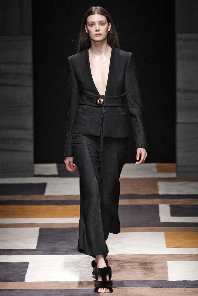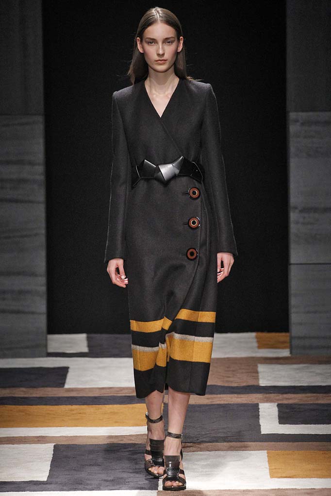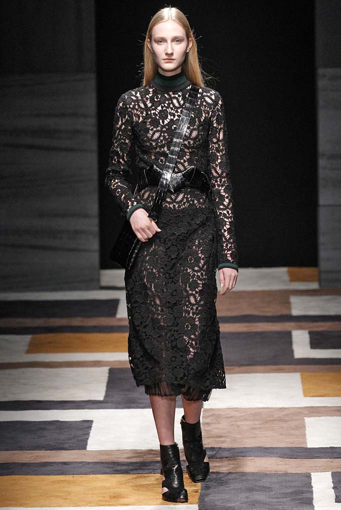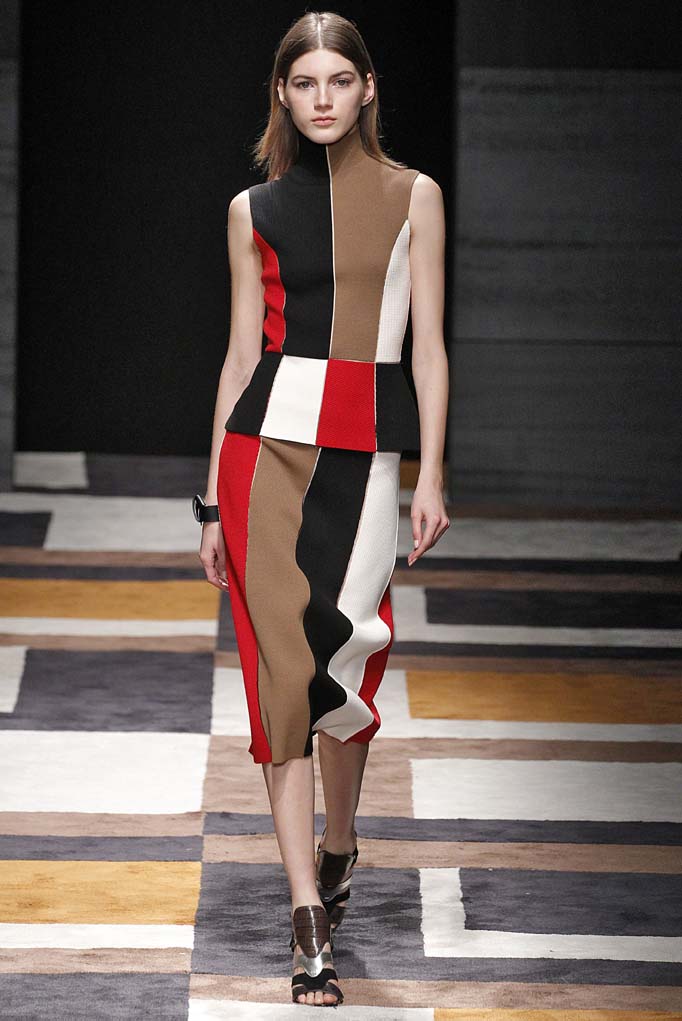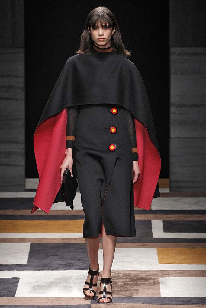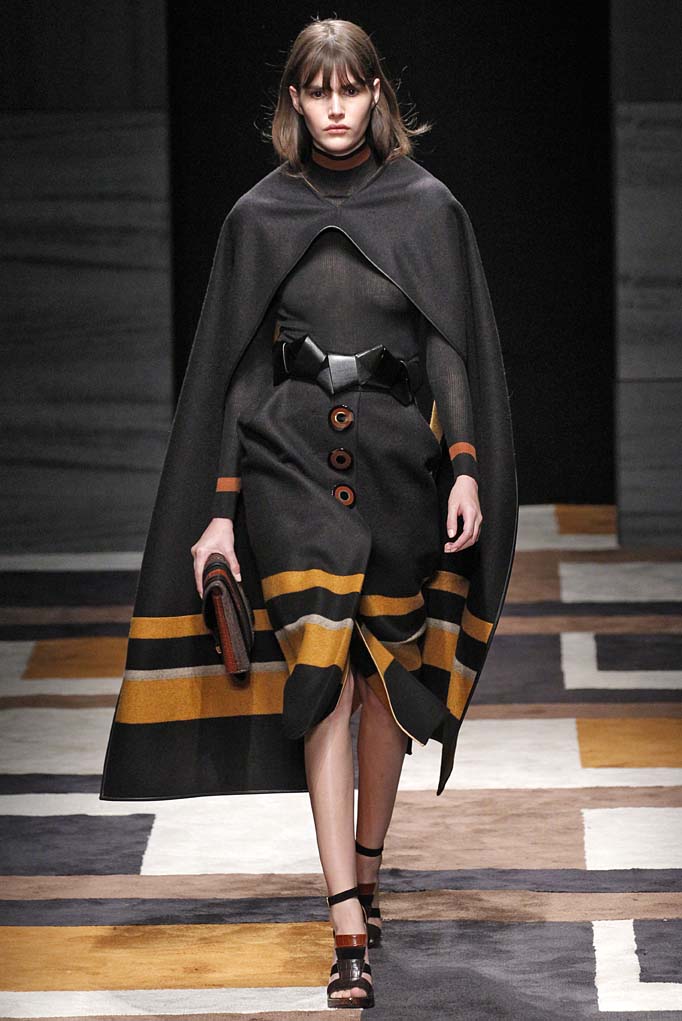 Prints galore! Massimiliano Giornetti delivered a vibrant collection with stellar graphic prints for Fall. The patterns mostly came in earthy tones of forest green, chestnut brown, mustard yellow, and a berry red. The focus was knitwear, with long slim turtleneck dresses and tops or a wrap dress with a must-have knotted leather belt, but the standout was the fur coat done in patches of dyed geometric fur. Even the heels had a triangular geometric element.