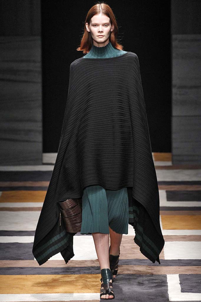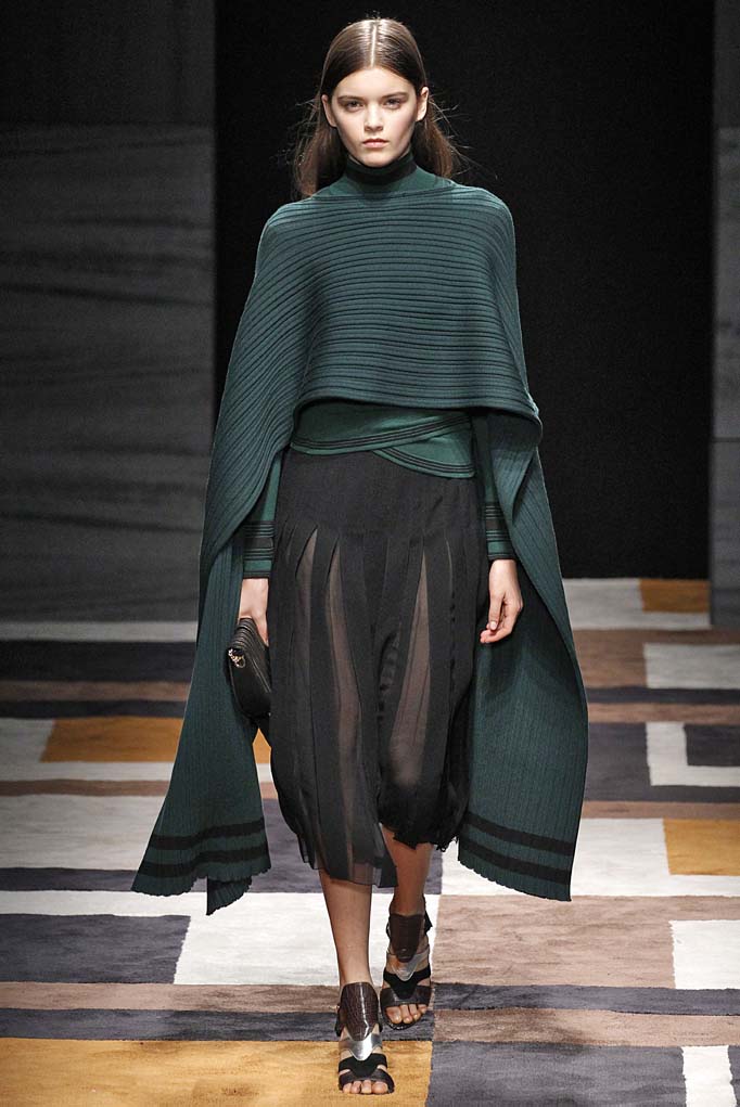 Capes were another theme, in soft, warm, oversized and pleated knit iterations. Giornetti got his start at Ferragamo working in knits, after all. A brown version nearly swept the floor and a much shorter red version fell across the chest and hung in the back over a matching pleated red dress. Two all-leather pleated skirt dresses, one in forest green and the other in burnt sienna, were noteworthy and an ode to the house’s leather making expertise. Ferragamo reported a six percent rise in revenue in January, and this stellar collection should ensure that upward trajectory.