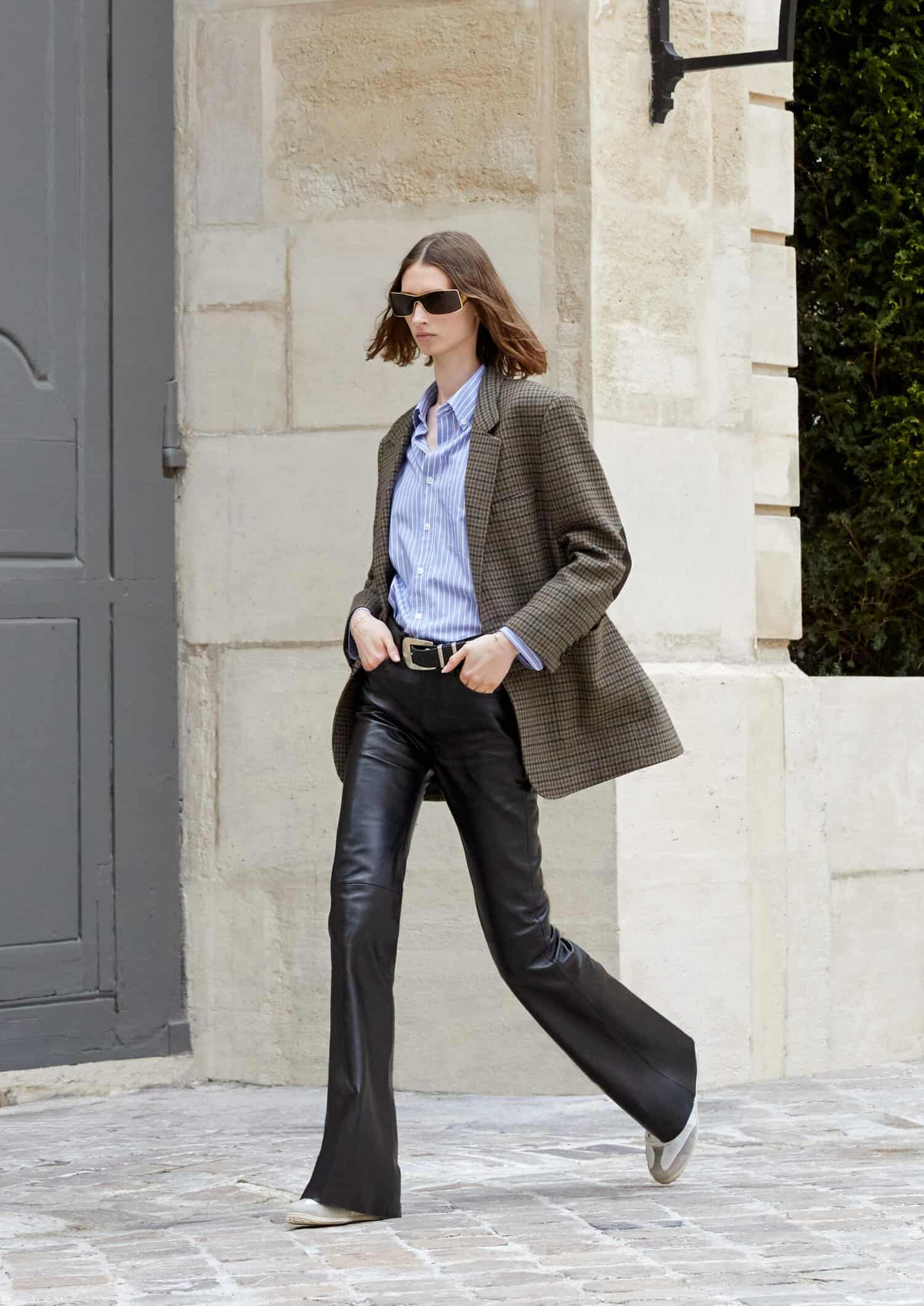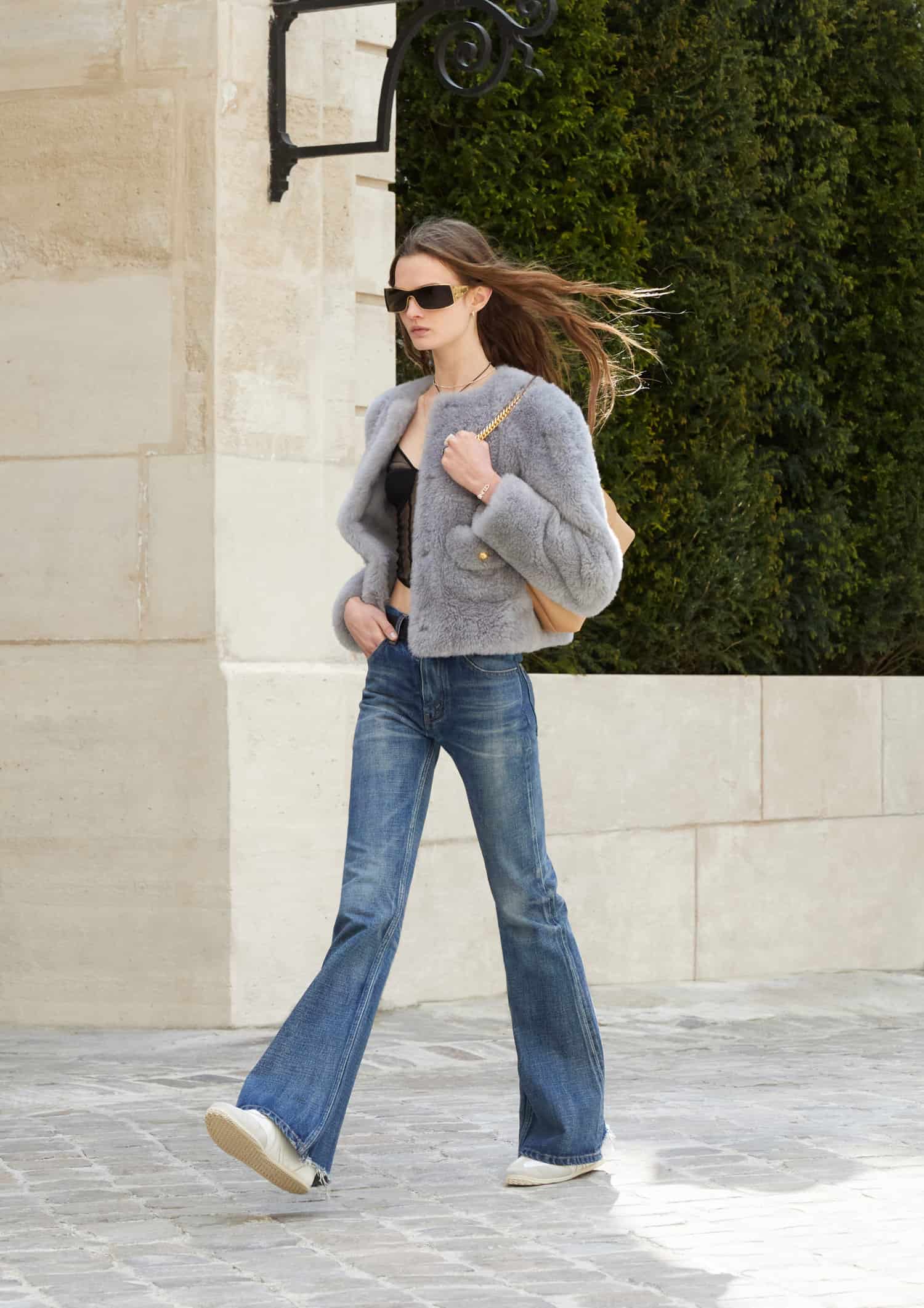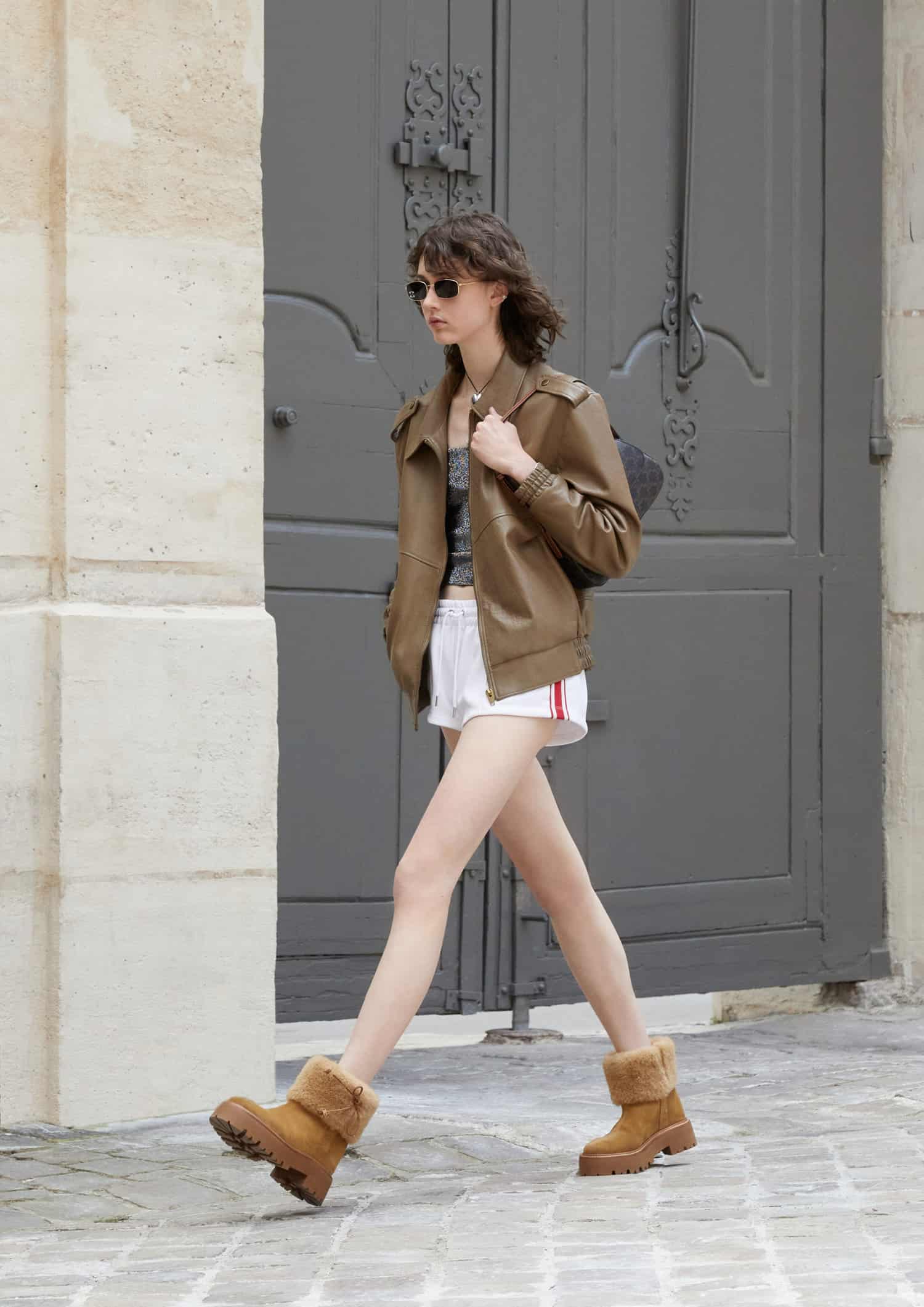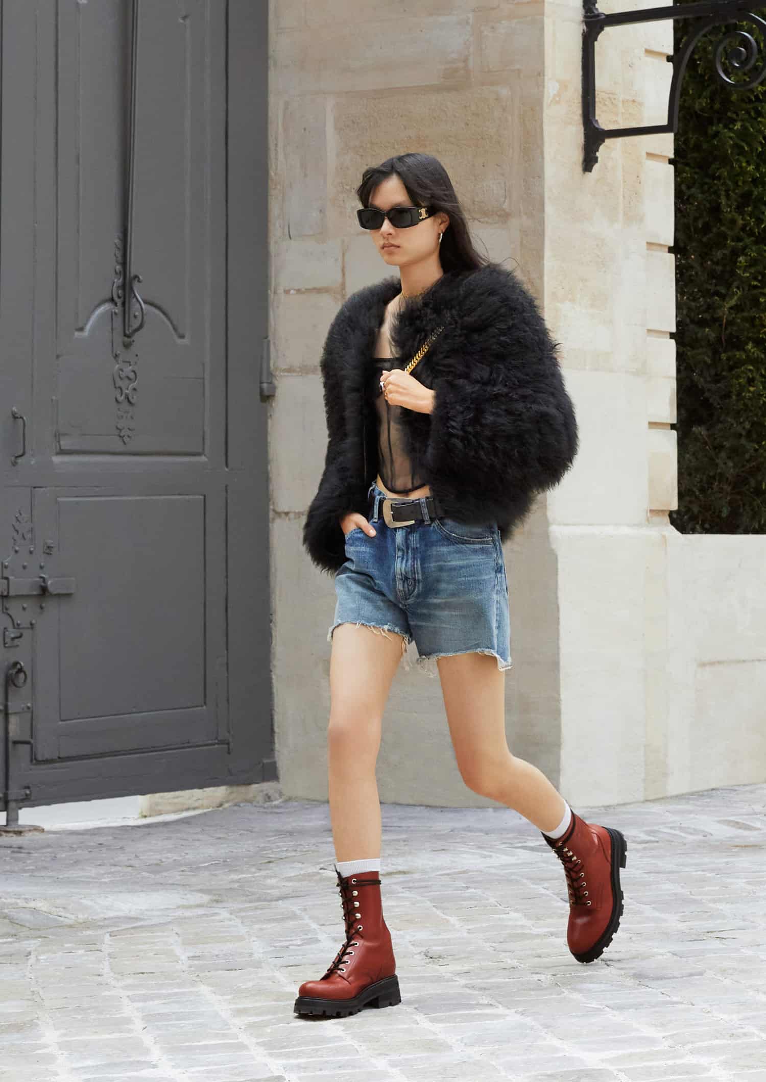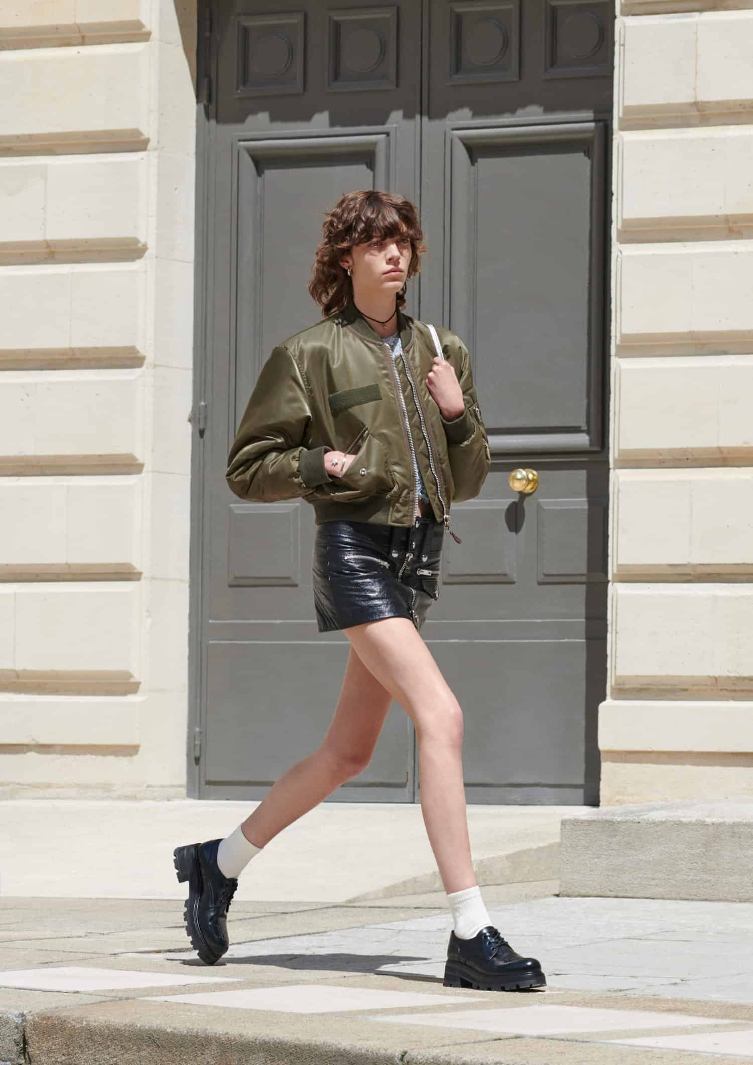 As he is wont to do, Slimane once again teamed up with a musician for the project. This time around, James Murphy of NYC-based LCD Soundsystem provided an extended, original version of the group’s 2005 indie electronic track, Too Much Love. And all the better to hear it with…select models wore Celine Triomphe-embossed headphones in leather; a new collaboration with Master & Dynamic. Equally as cool girl-approved were embellished chandelier dresses and an array of leather and aviator jackets. As always, the ’90s influence reigns supreme, with grunge-chic lace slip dresses, chokers, loafer-and-sock combos, and school girl skirts up for offer, as well as unexpected but likely buzzy pieces such as track shorts, shearling boots, and shimmering hoodies.