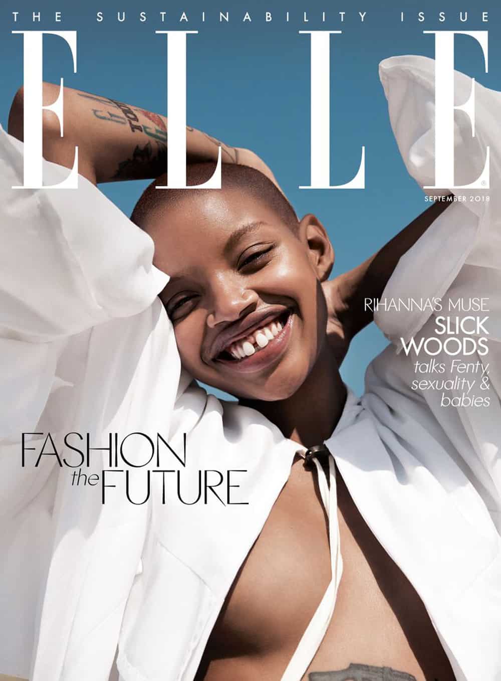 Slick Woods announced her pregnancy on the cover of British Elle, in an issue dedicated to sustainable fashion.