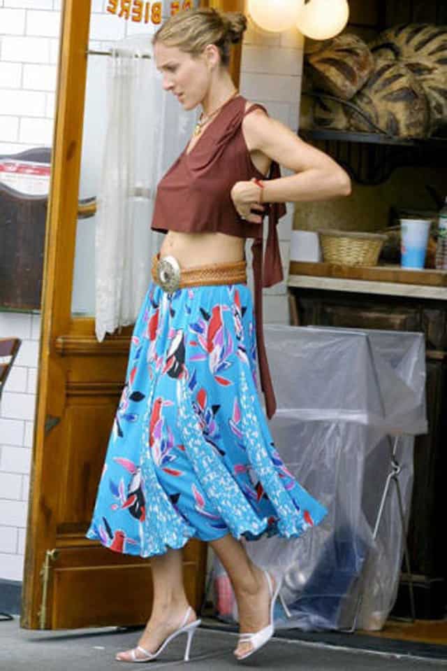 ……. buttttt, okay, okay, i’ll give you a *liiiiiiittle* bit of a free pass, bc i’ll admit there were at least a handful of WTF and/or just straight up ugly IMO haha. like the one that always comes to mind first for me that i can’t believe you didn’t mention here! when she was at like a thrift store i think with miranda or samantha or idk maybe it was even charlotte? but she was wearing i believe a button down oxford-style polo blouse, but somehow tied up so the majority of her entire torso was exposed. and i think she paired it with like a maxi skirt or something? but just wait… i haven’t even gotten to the CRAZIEST part yet. she was wearing a belt RIGHT THROUGH THE MIDDLE. and yes, by that, i do mean SHE WAS WEARING A BELT AROUND HER COMPLETELY BARE TUMMY, ONLY SKIN-TO-BELT CONTACT. not even tucked into or hooked onto the clothes at all whatsoever. from the first time i saw it and too this day i’ve always just seen that and been like WTH THAT IS SO FREAKING STRANGE lol. and it was one of those ribbon-type belts with the metal D rings that you’d pull it through…. which for some reason made it even weirder in my mind? lol