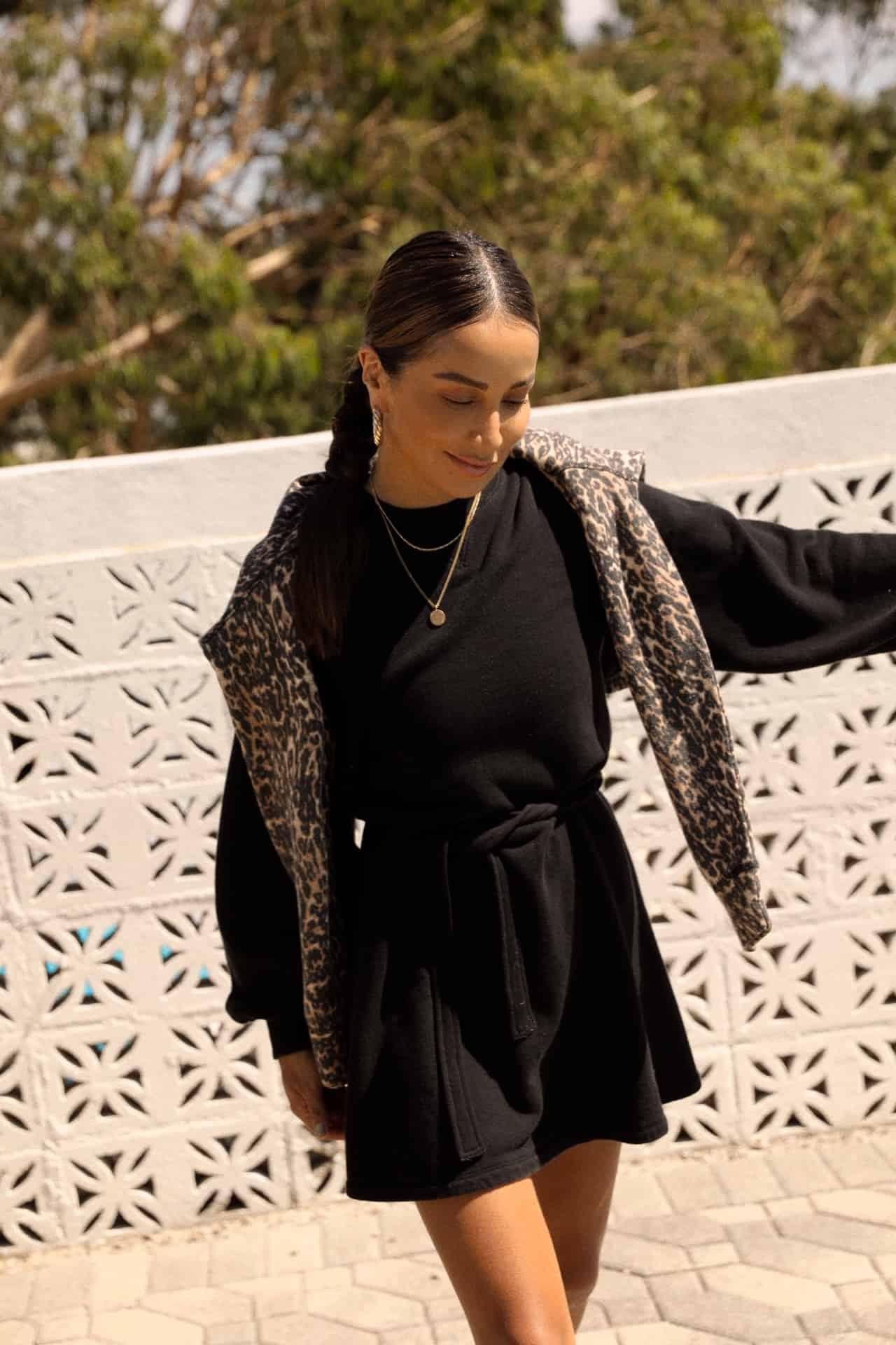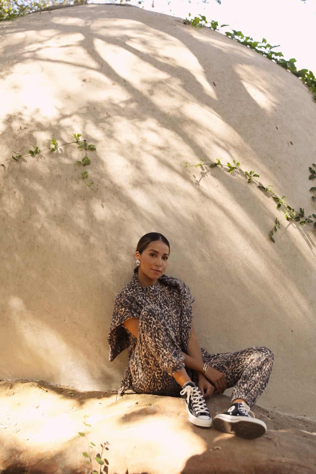 I’ve been wearing the juniper crewneck and sweatpant kit in the leopard print on repeat! It’s warm, comfortable, and I love it with some chunky gold accessories, in the form of either an earring, or some bracelets paired with a messy braid and sneakers. The leopard pattern is a great way to add some variation to the fall mood!