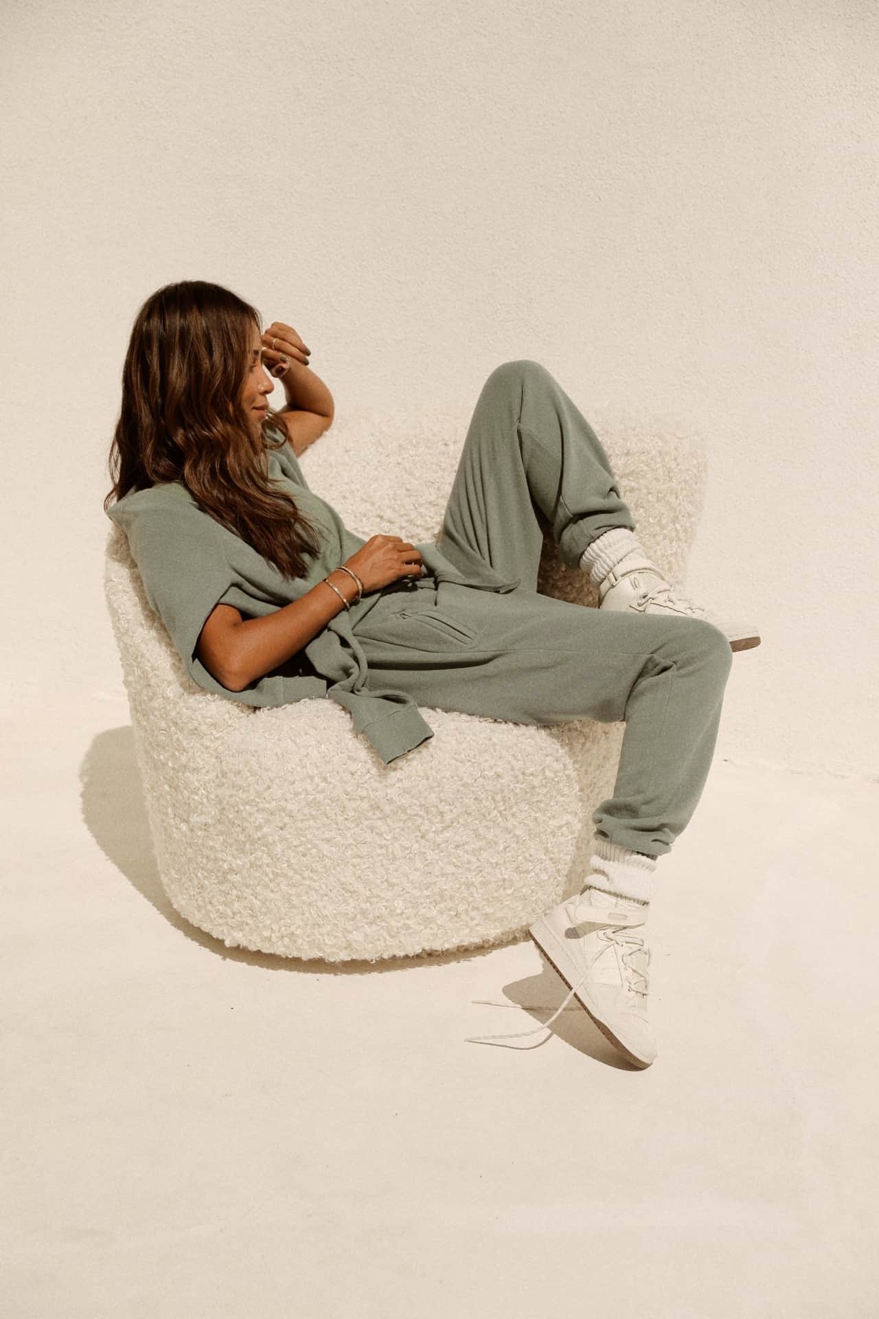 This collection is about comfort, and playing with colors inspired by California in the fall. I love a muted or statement monochrome look, so I worked with that concept in creating the tonalities for these basic sets. I really like that athletic fits are having a spotlight moment. Designing with this as the creative center of this collection was inspiring and really cool to do.