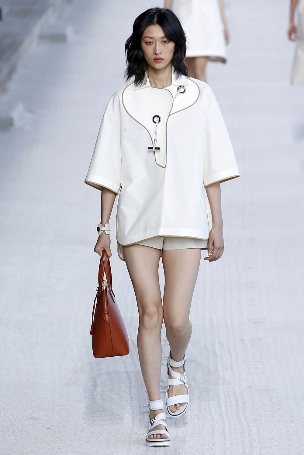 The Paris Longchamp Racecourse was the perfect stage for Hermes’ new collection, that was full of sporty and summery vibes. A perfect balance of vibrant colors like turquoise, earthy hues, and the brand’s signature orange, made for a harmonic show. The bucket-like and the smaller bags with broad leashes were without a doubt among my favorites.